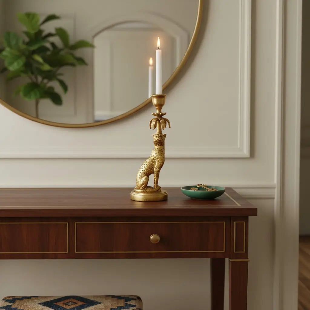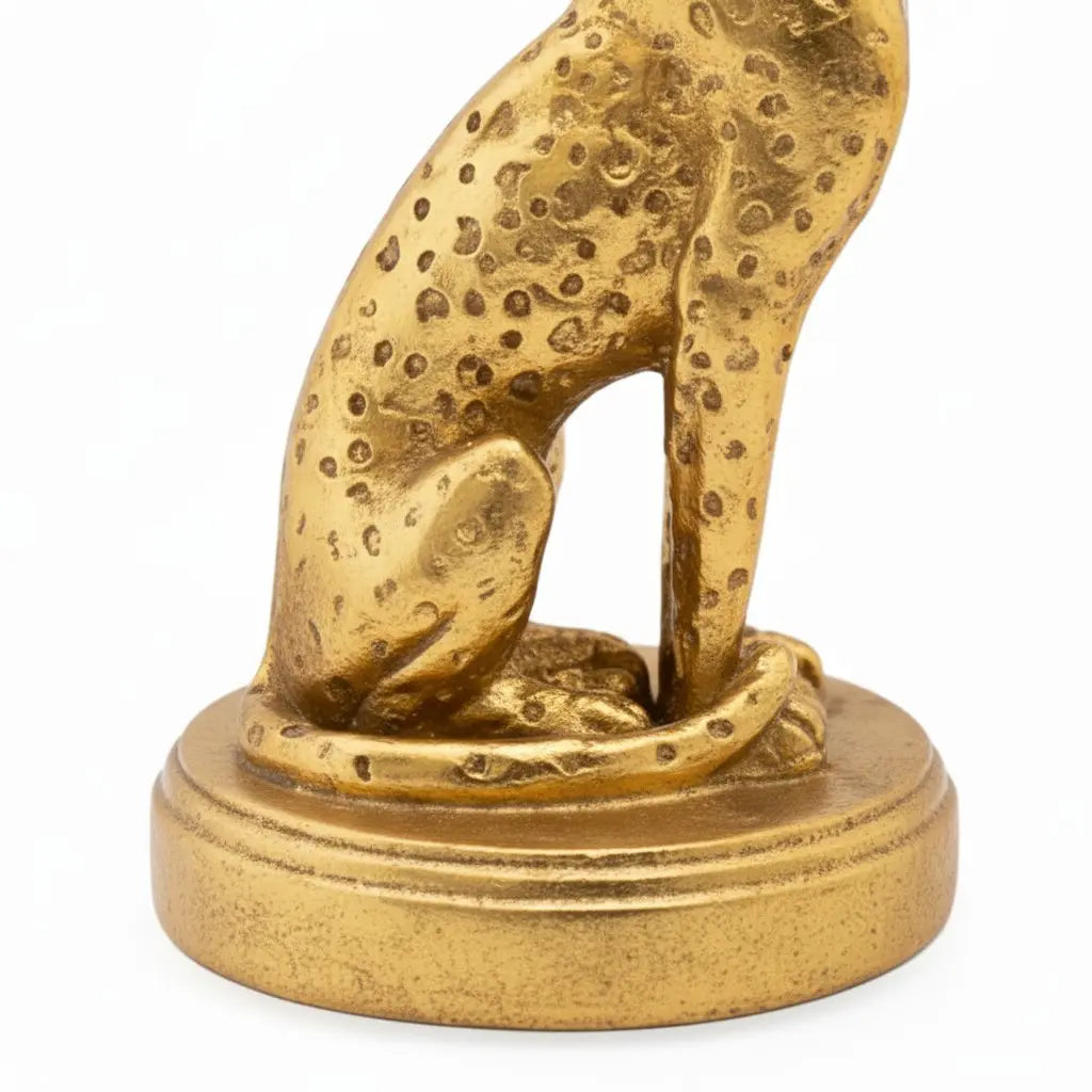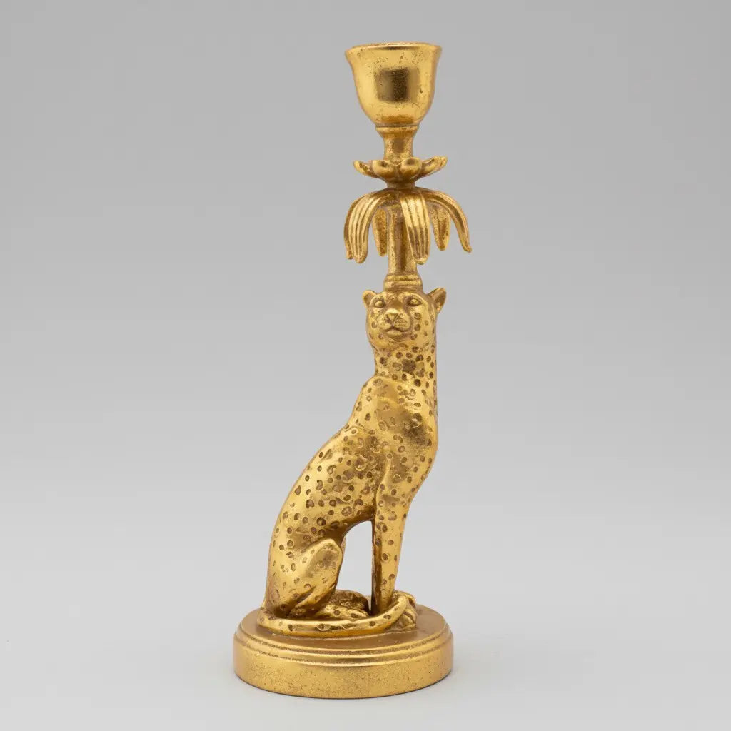 This vintage luxury candle holder showcases a gold cheetah sculpture - merging bold animal-inspired design with opulent metallic finish. It suits dining tables, console displays, or glamorous living room and entryway accent spaces.