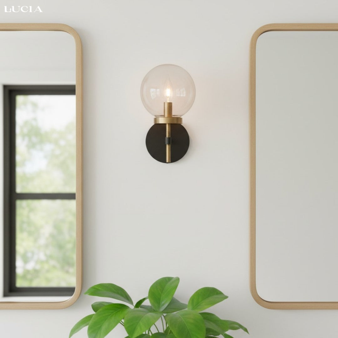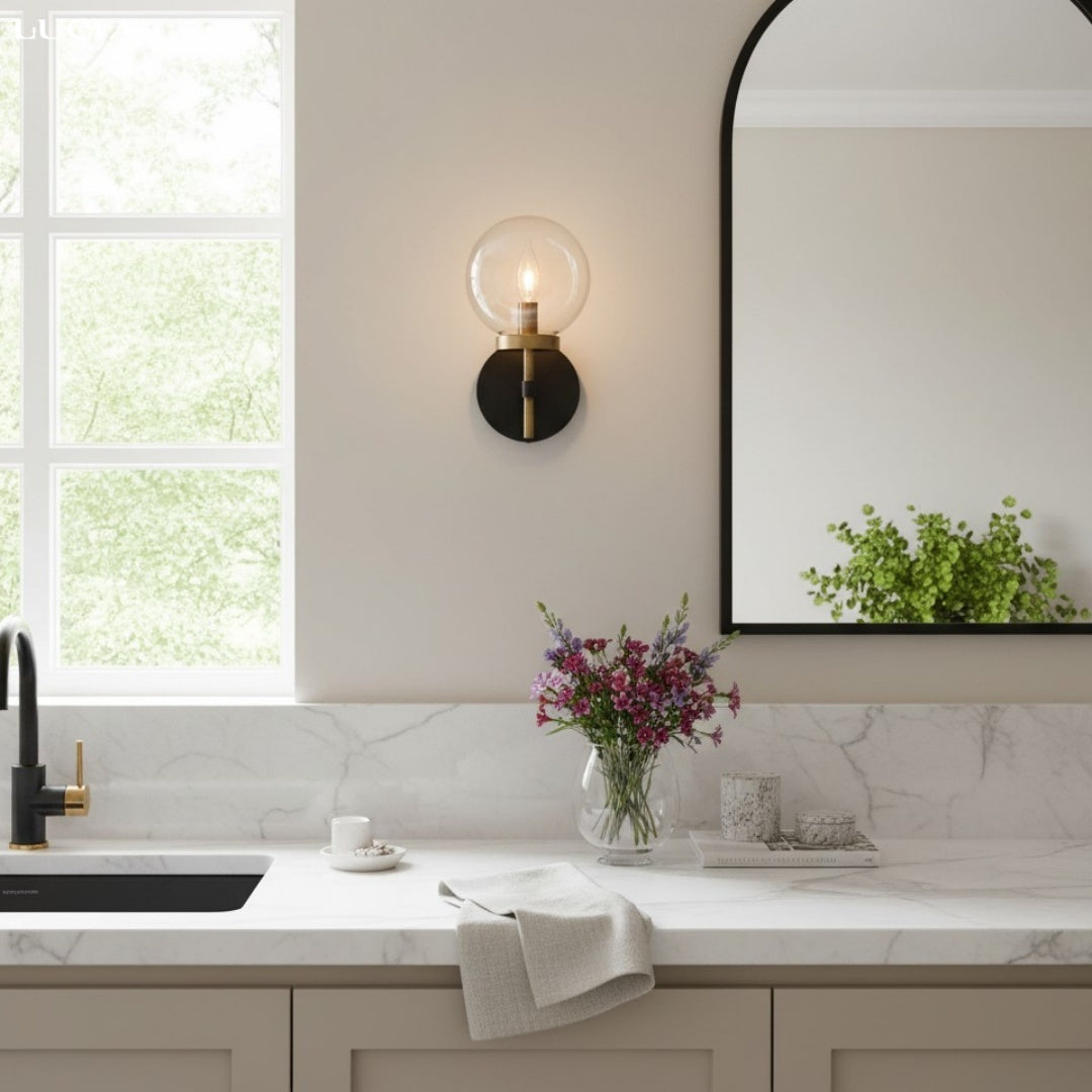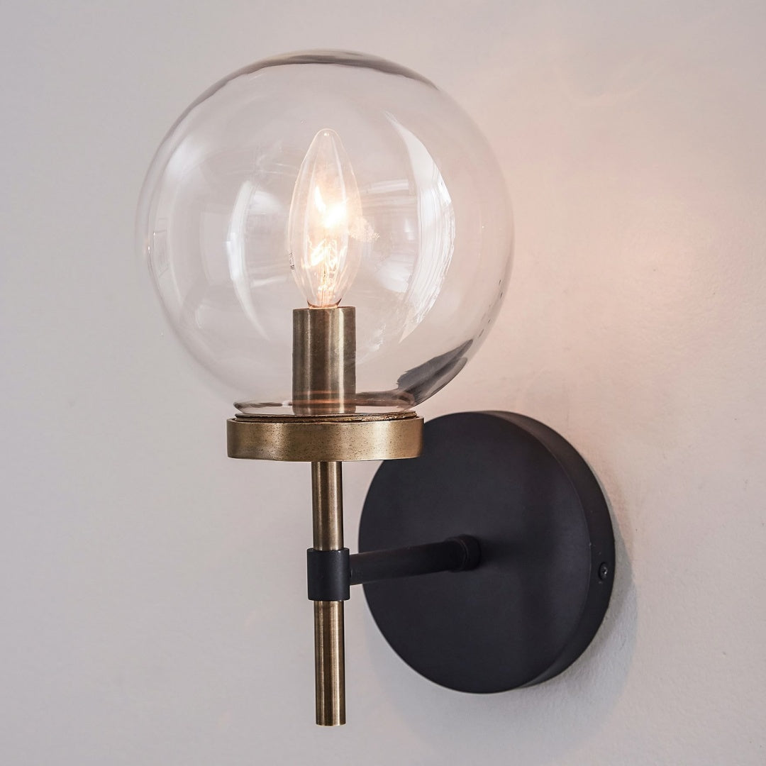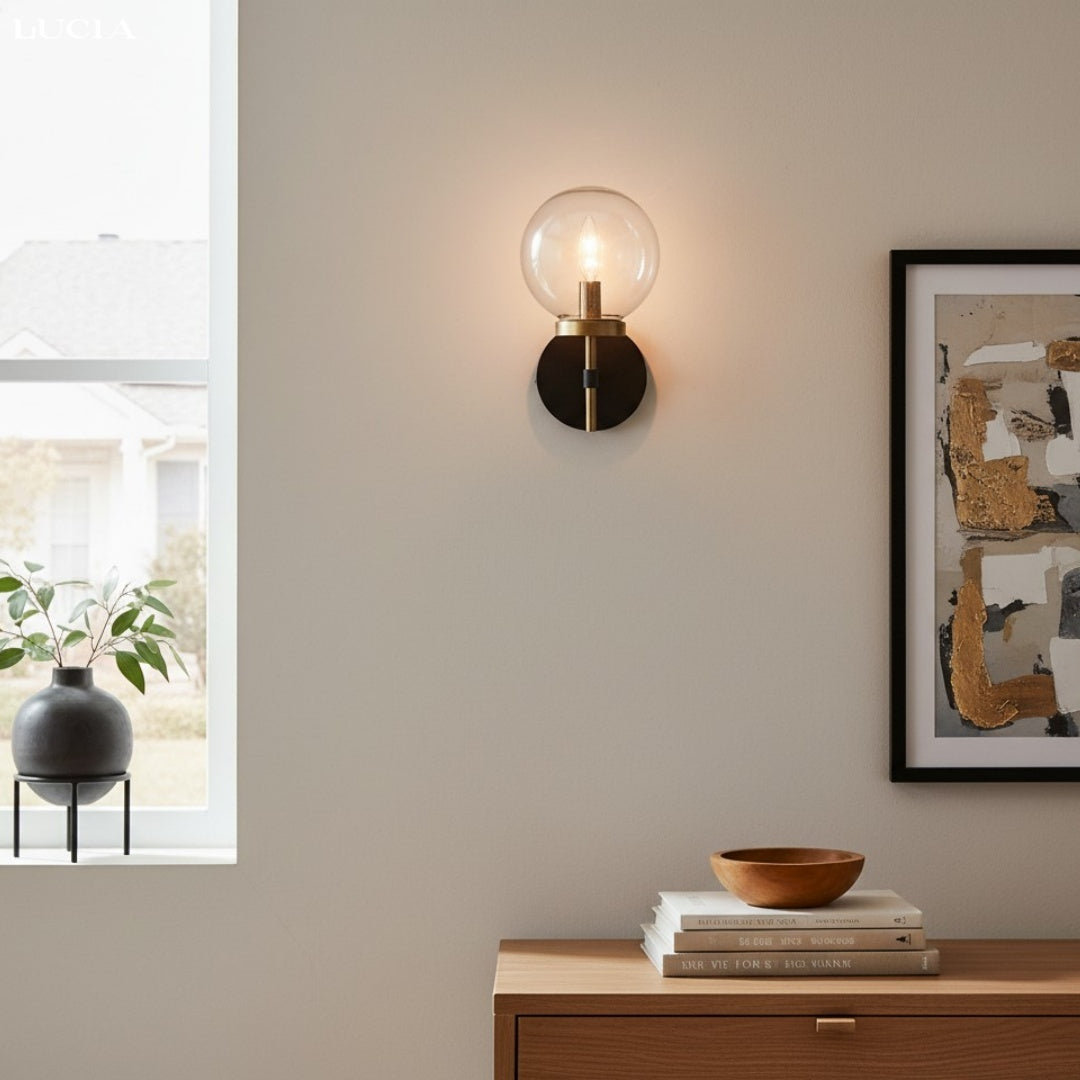 The Artemis Wall Sconce blends sleek industrial style with timeless elegance. Its handblown glass globe and refined metal frame provide bright, balanced lighting perfect for hallways, bathrooms, or bedrooms.