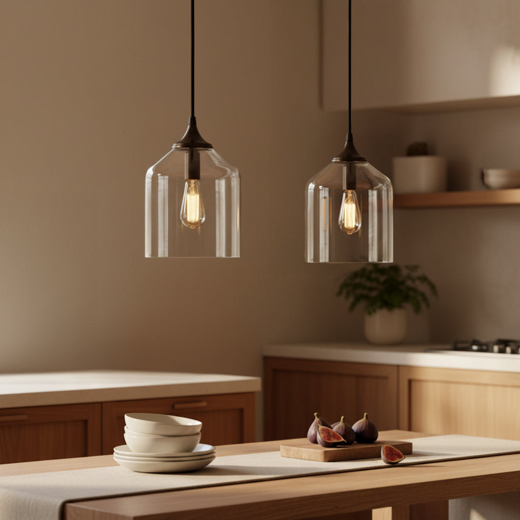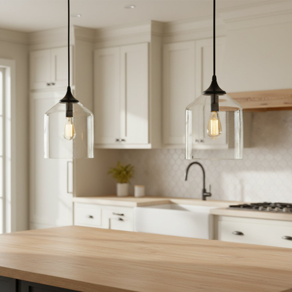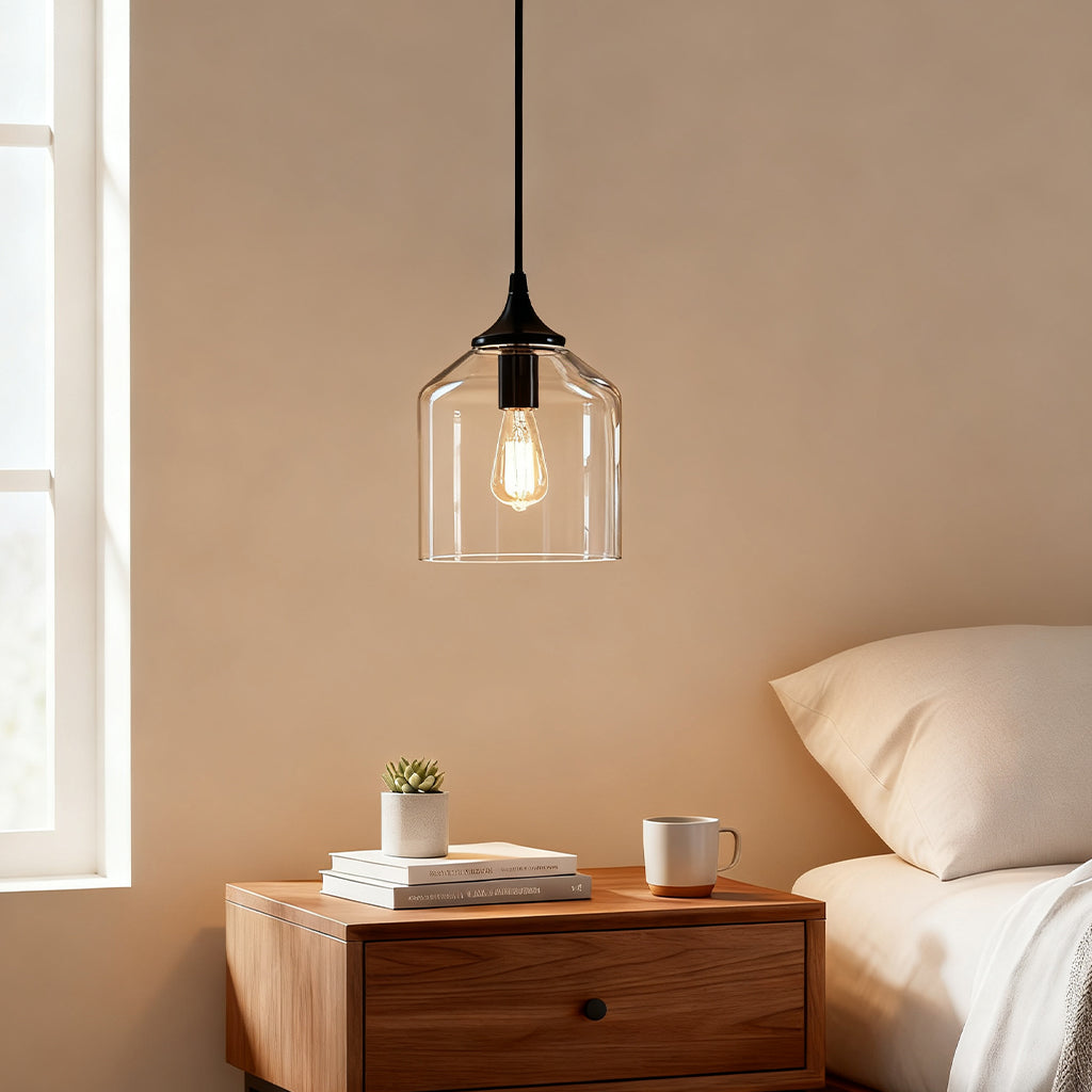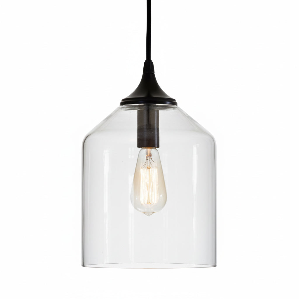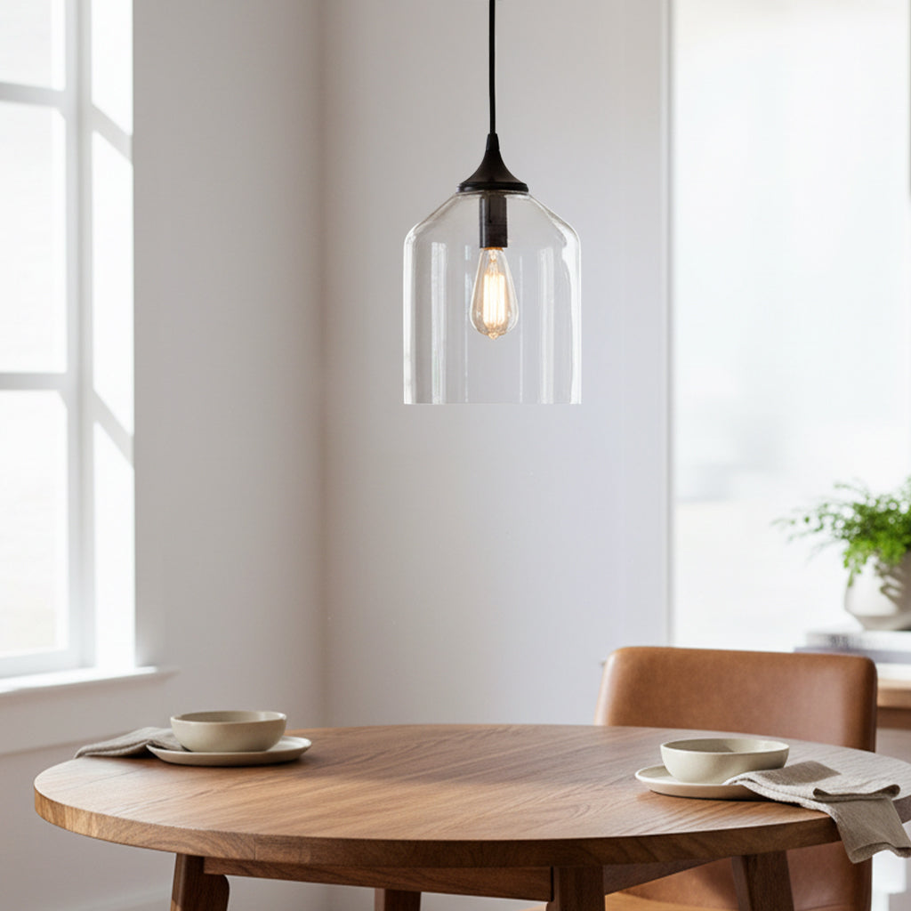 Featuring a hand-blown glass shade and a minimalist silhouette, this clear glass pendant highlights the warm glow of an exposed bulb, making it perfect for kitchens, dining areas, or entryways. The black metal fixture adds a modern touch, effortlessly blending with both traditional and contemporary interiors.