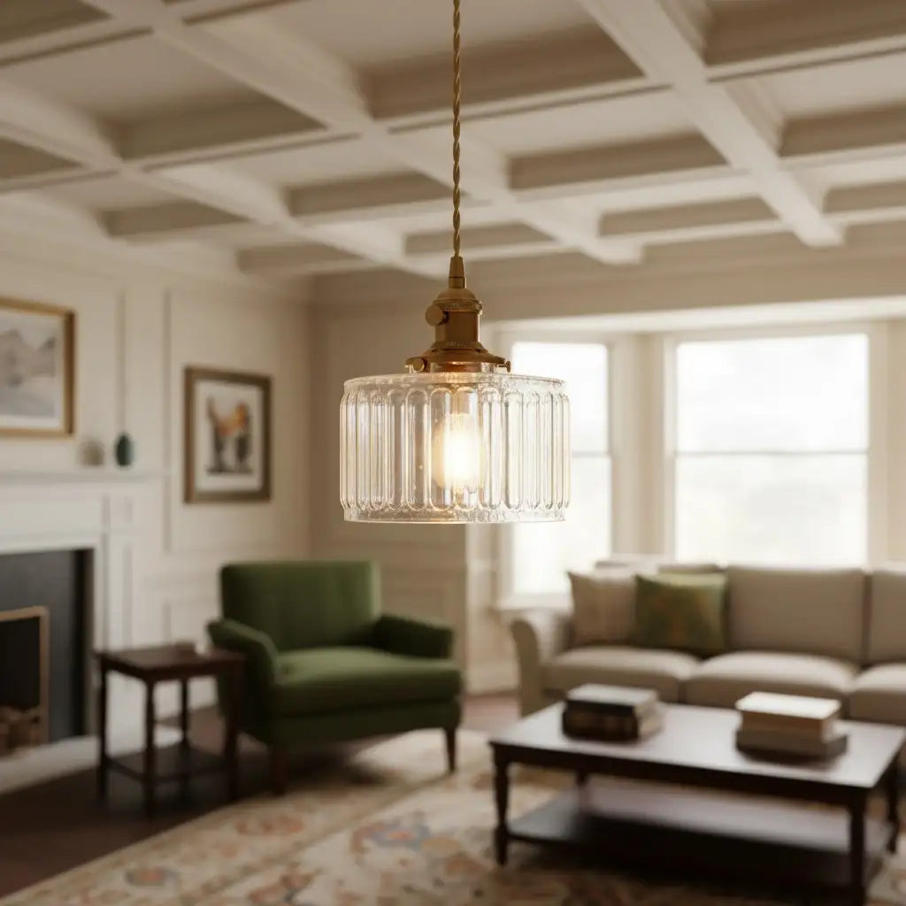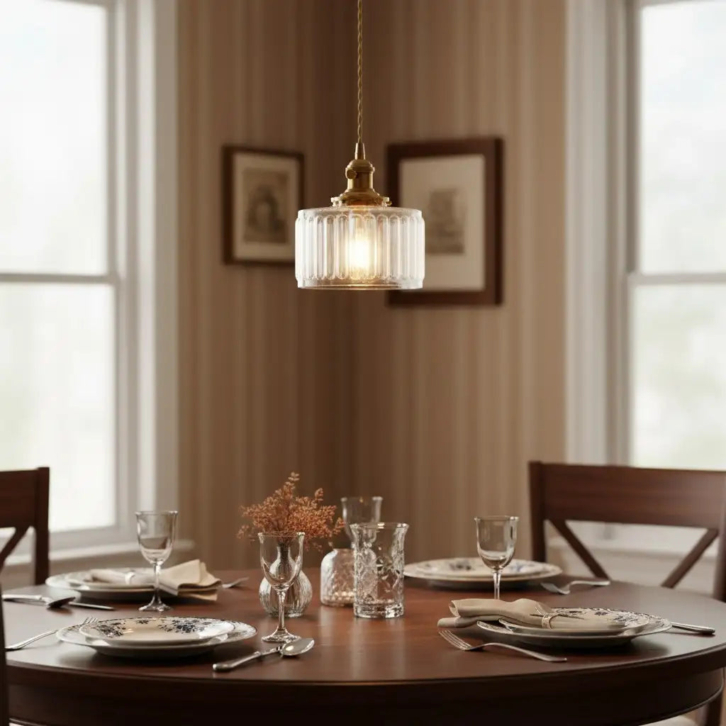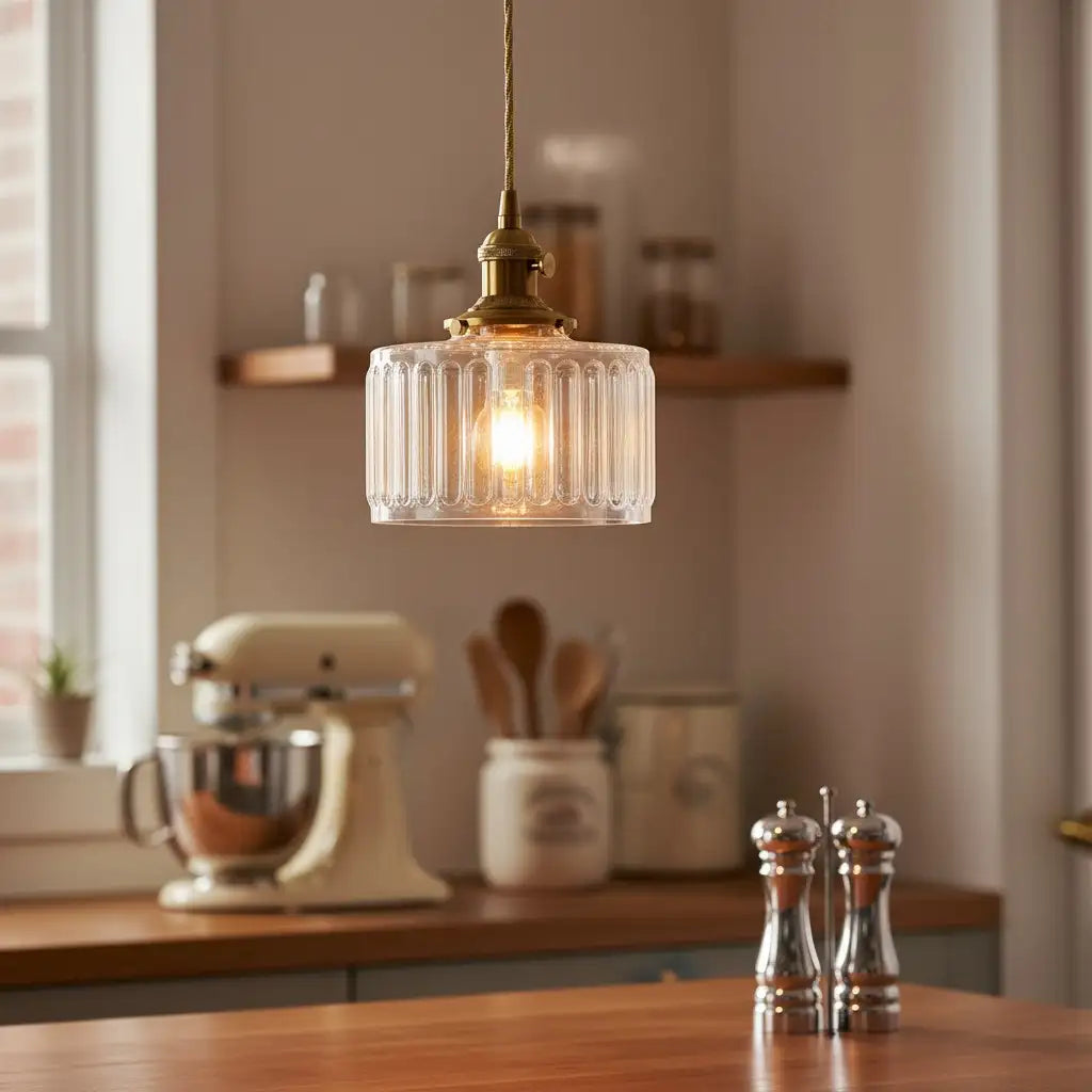 This Lucent Retro Pendant Lamp features a brass frame paired with ribbed clear glass shades. Its adjustable design blends vintage charm with modern vibe and suits dining room and kitchen perfectly.