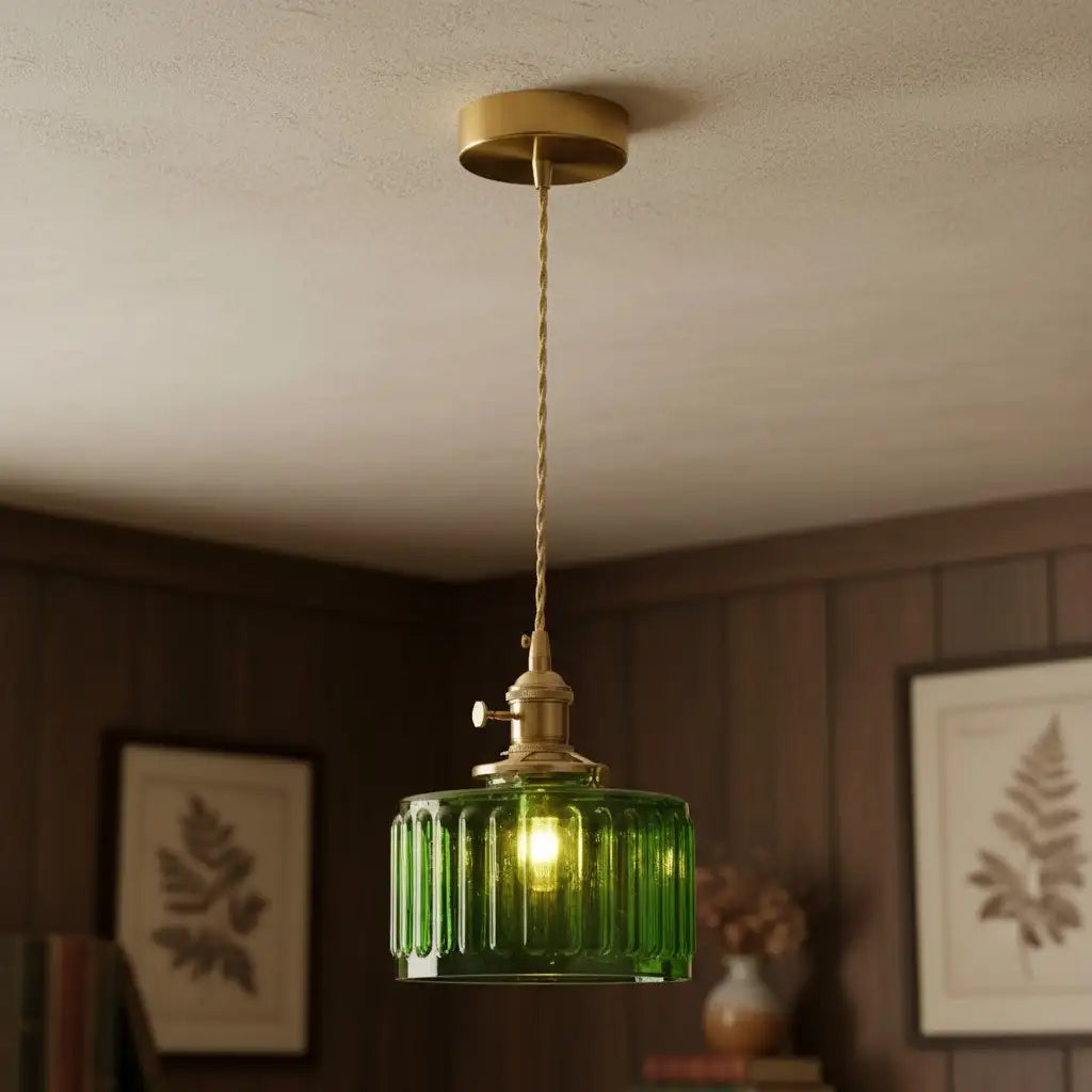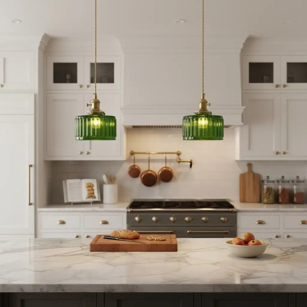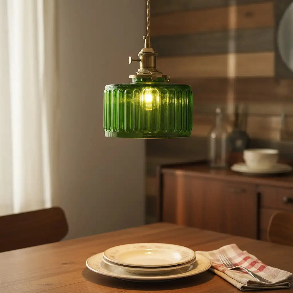 This Lucent Retro Pendant Lamp features a brass frame paired with ribbed clear glass shades. Its adjustable design blends vintage charm with modern vibe and suits dining room and kitchen perfectly.