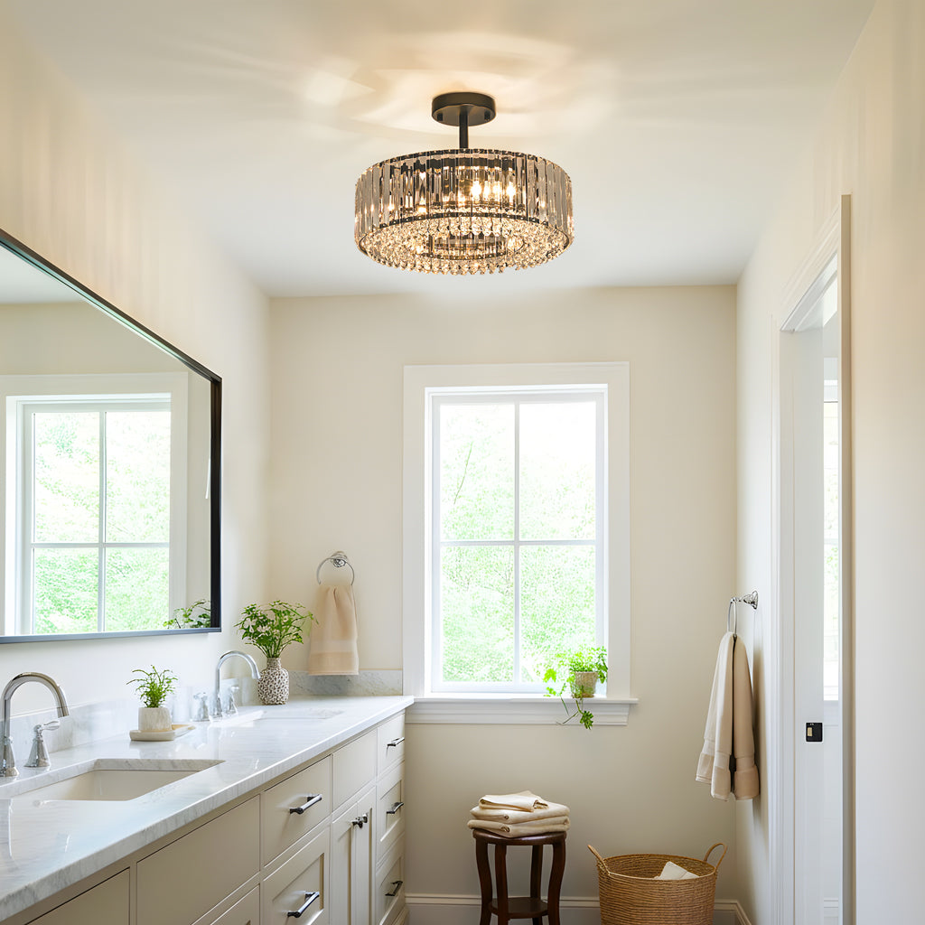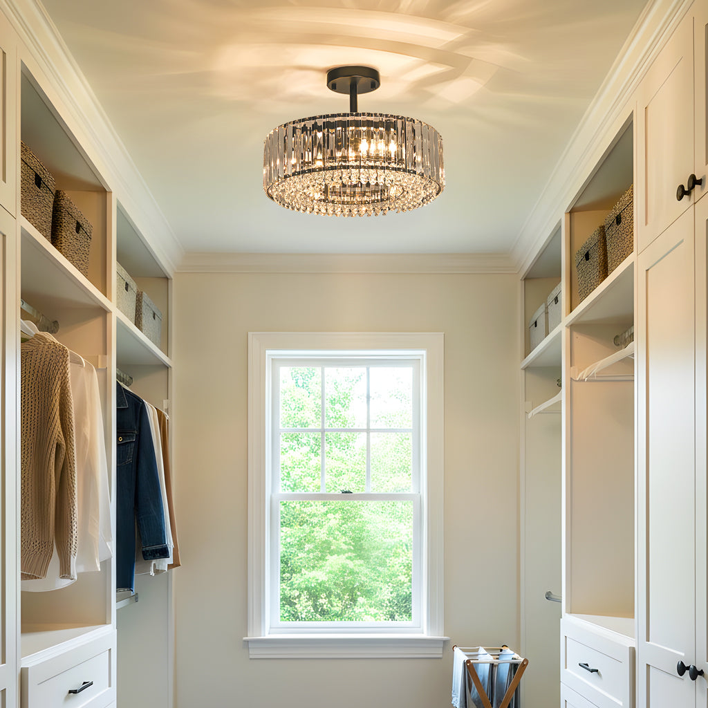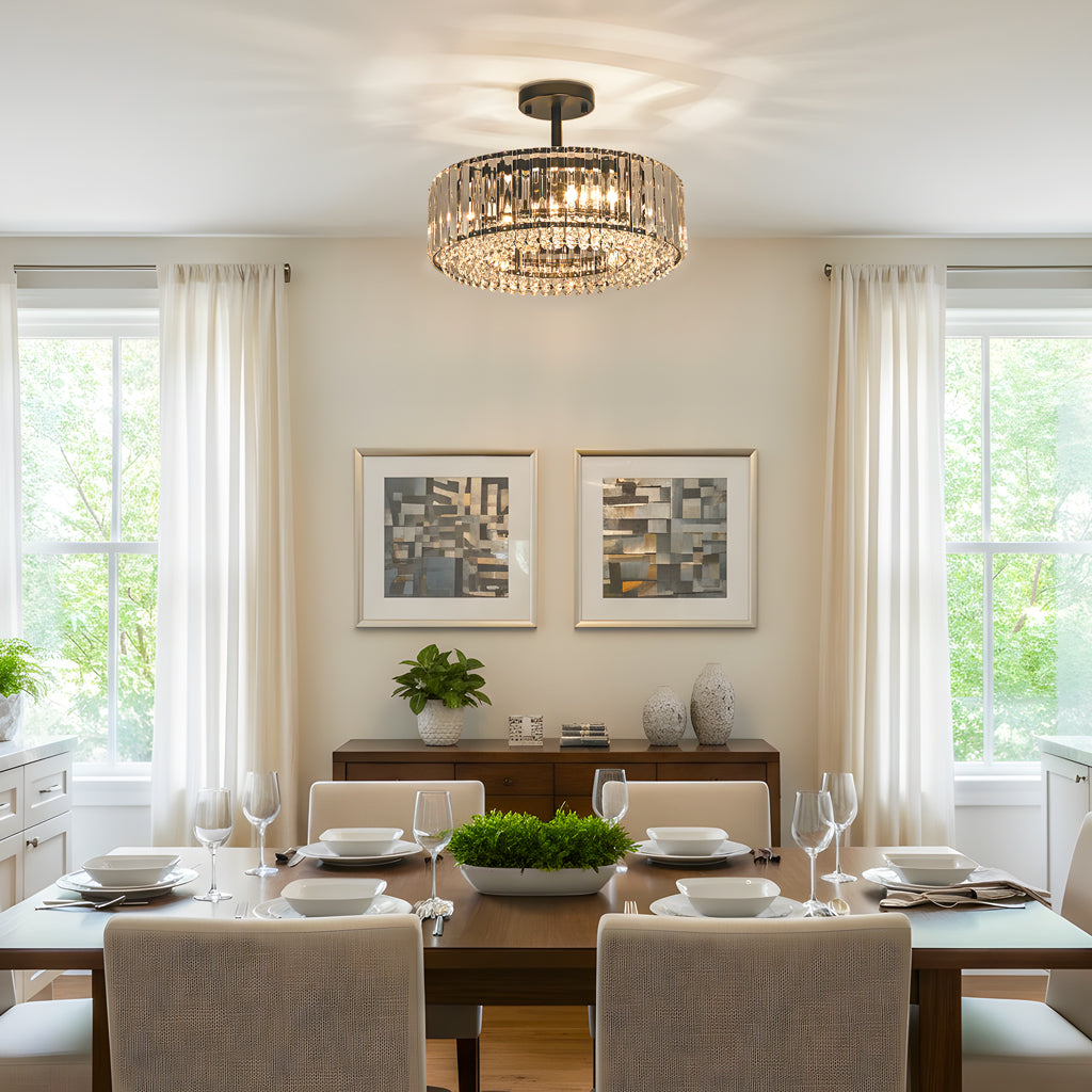 A blend of classic and modern elegance, this semi flush mount features a metal drum frame with precision-cut crystals that reflect light beautifully. Available in gold or black. Ideal for dining rooms, bedrooms, and entryways.