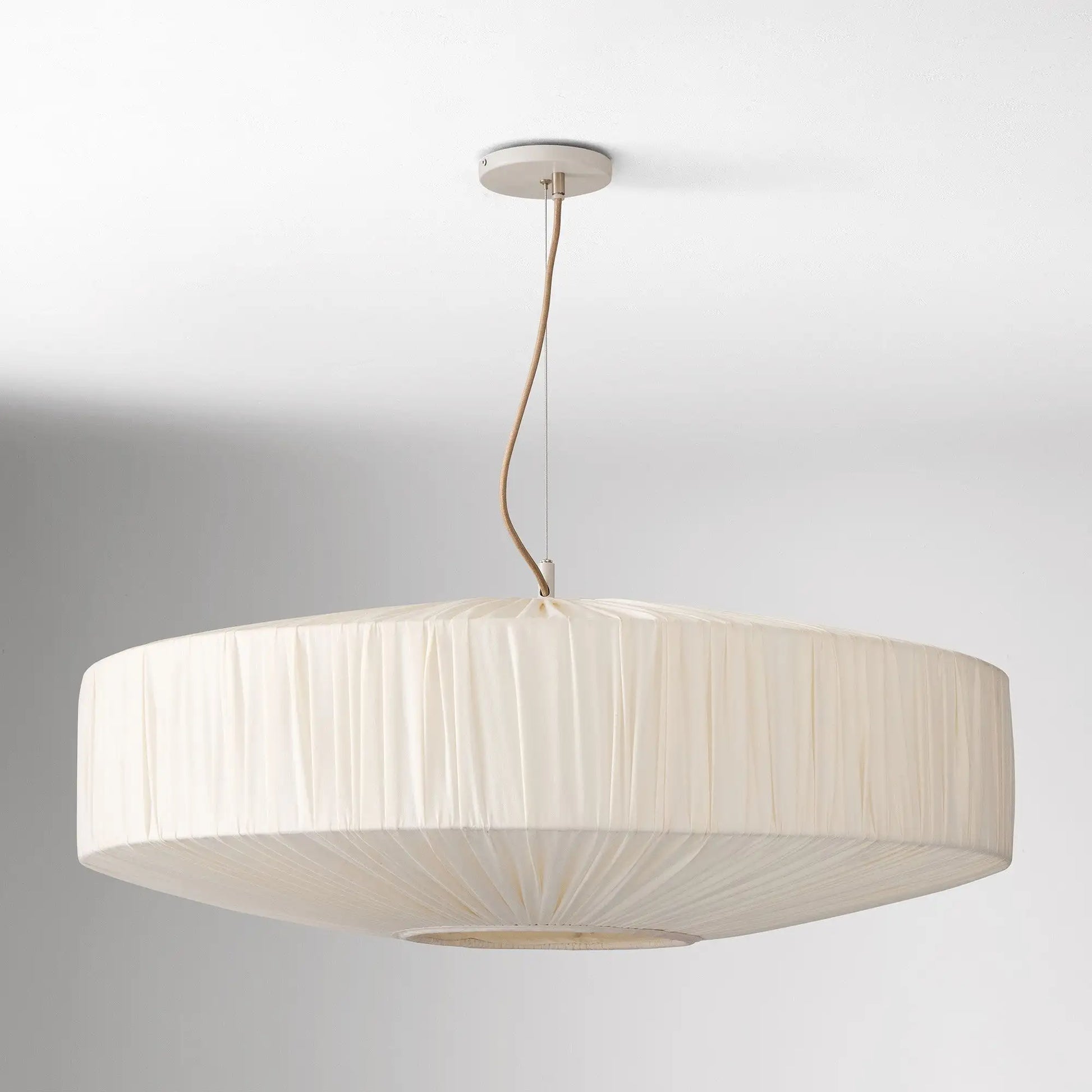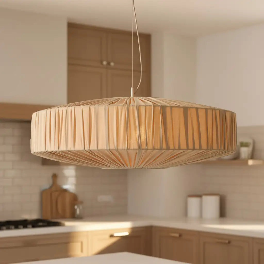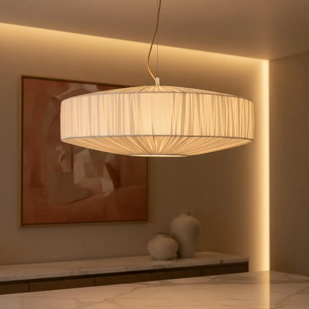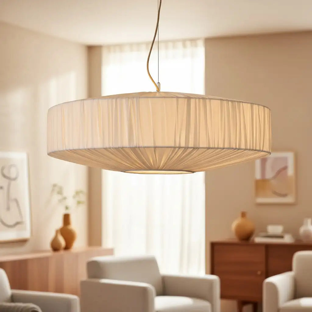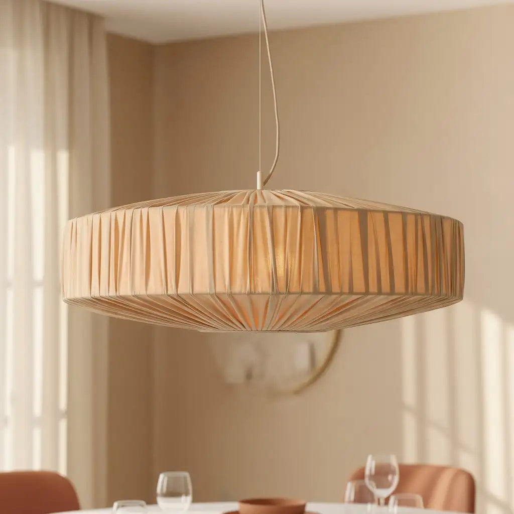 This modern pendant light features a pleated silk-like fabric shade. Blending sleek design and delicate texture, it adds refined, soft elegance to any interior space.