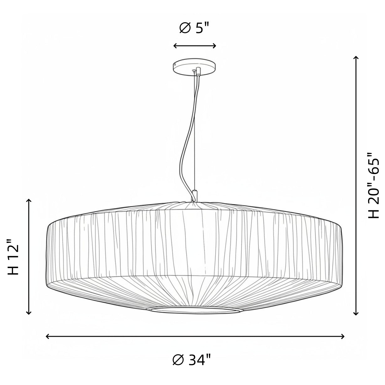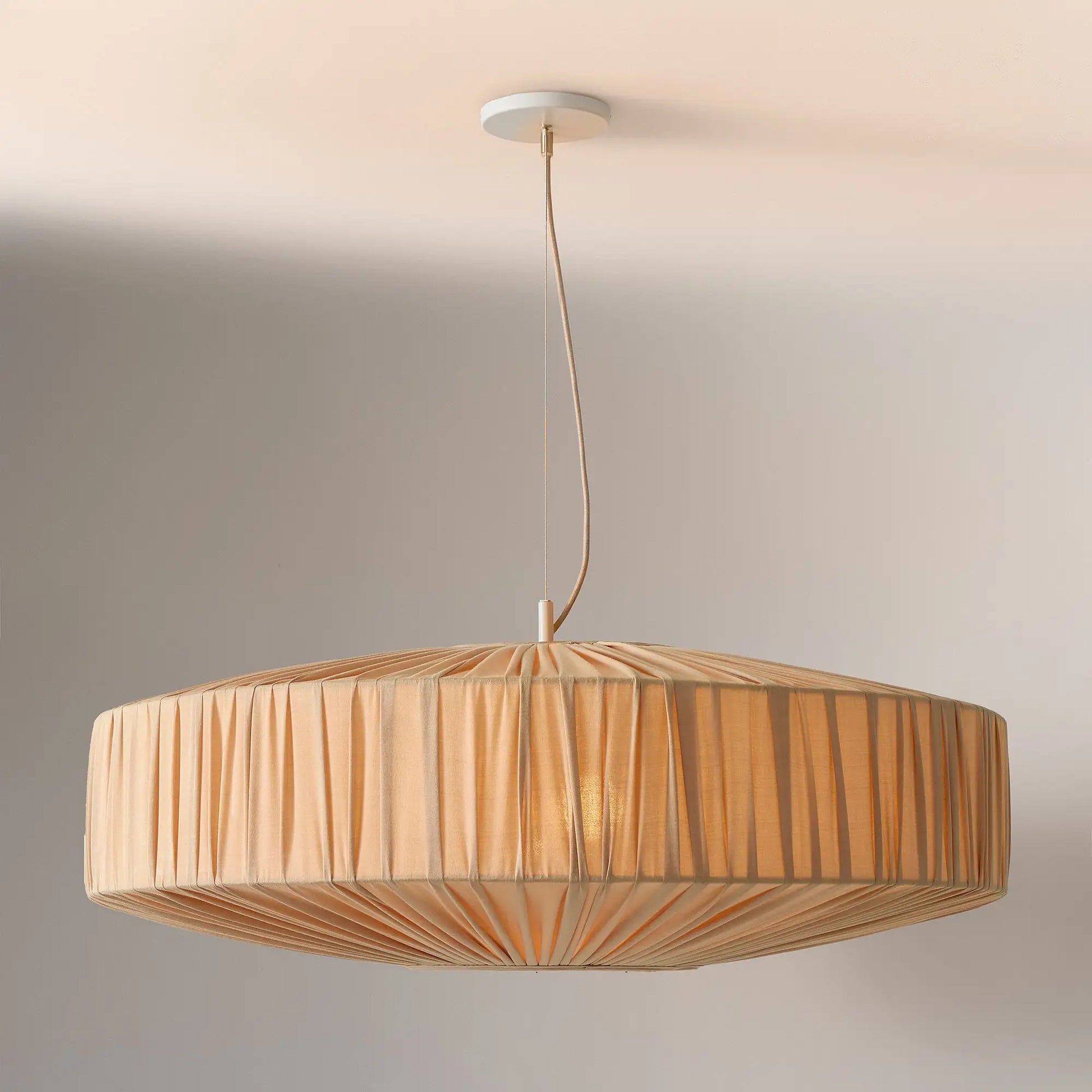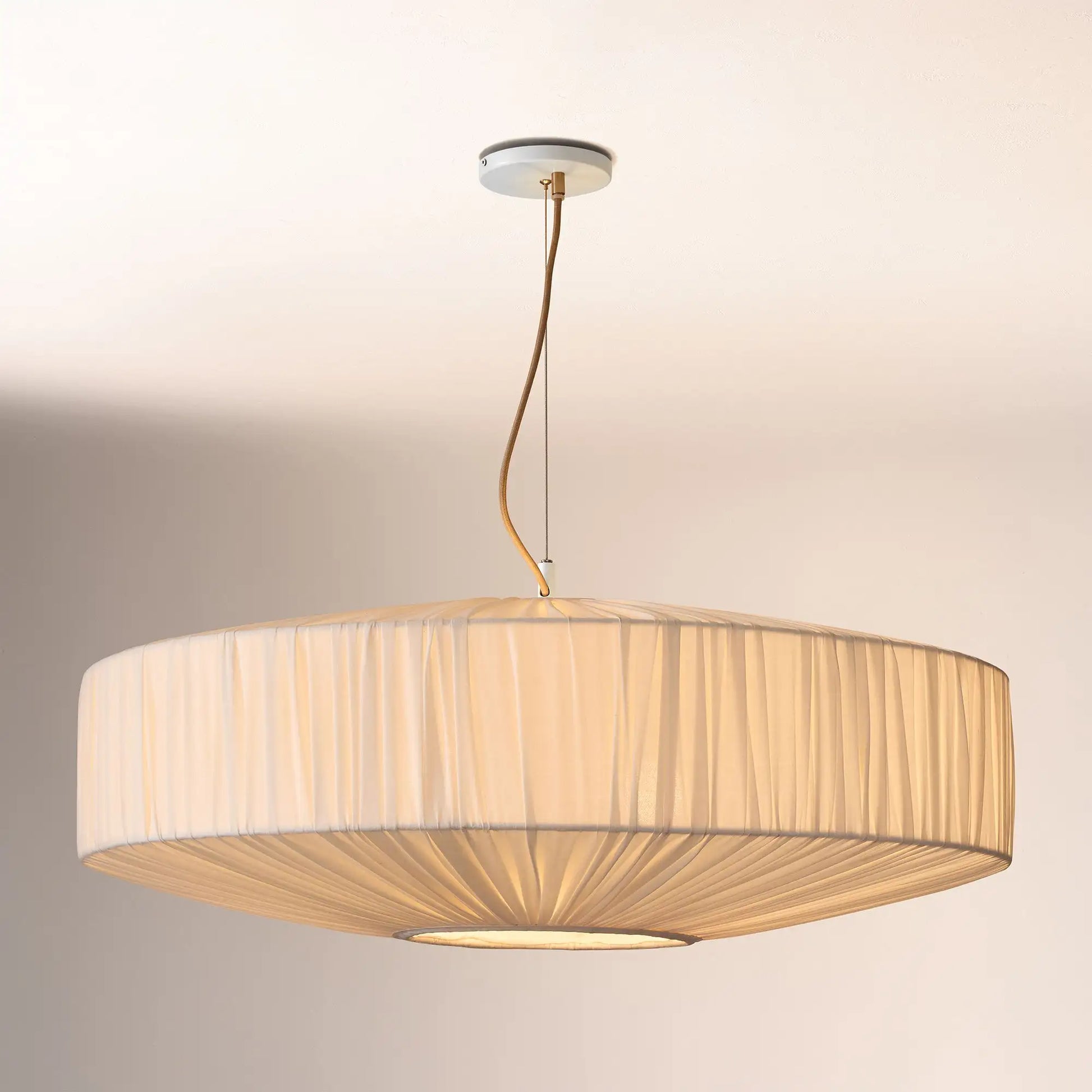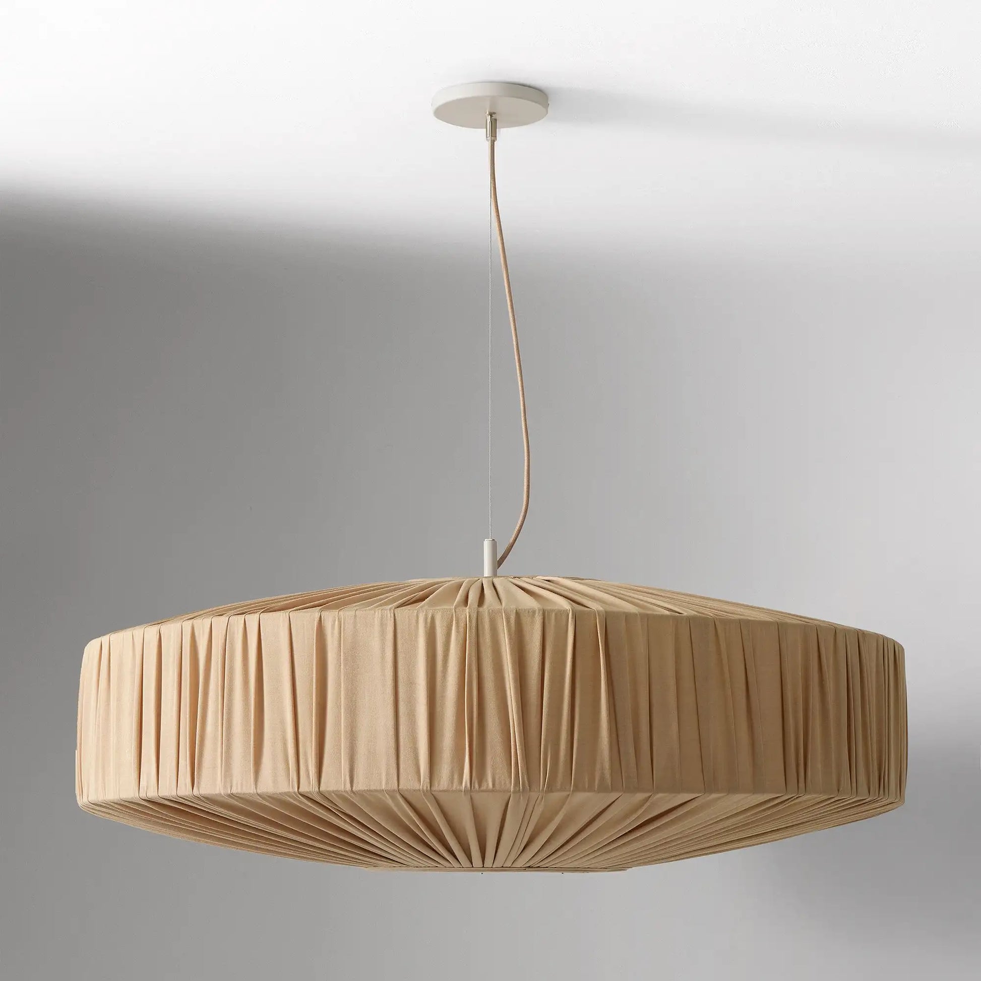 This modern pendant light features a pleated silk-like fabric shade. Blending sleek design and delicate texture, it adds refined, soft elegance to any interior space.
