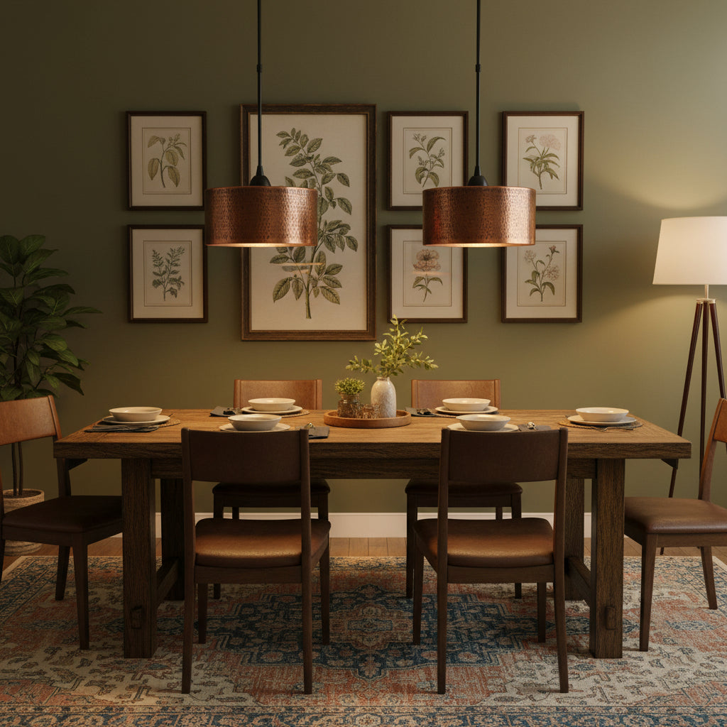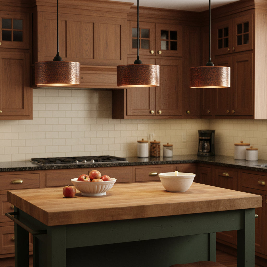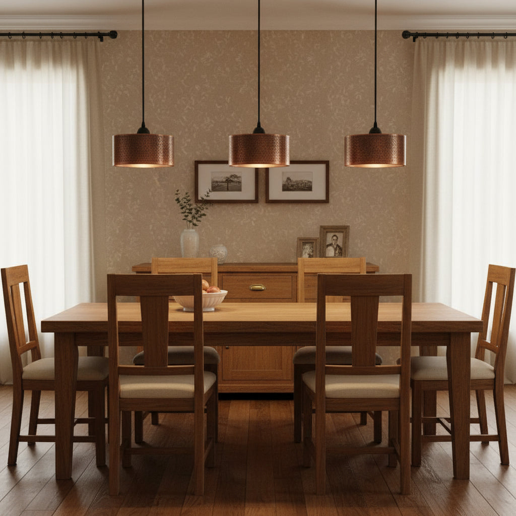 Add a touch of vintage charm to your space with the Cedric Pendant Light. Its hammered dark brown copper drum shade exudes a warm, inviting glow. Perfect for kitchens, dining areas, living rooms, or entryways.