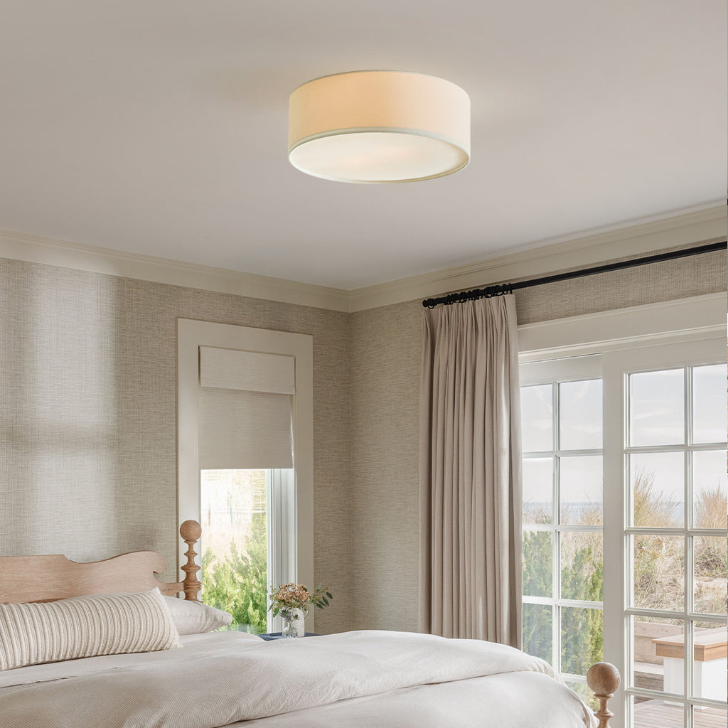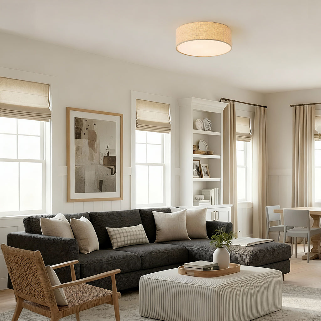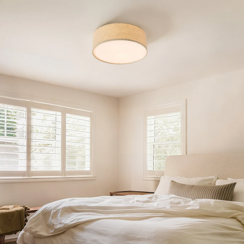 Add understated elegance to your space with this linen drum flush mount. Its iron frame and fabric shade emit a soft, diffused glow, while the low-profile design offers modern sophistication perfect for bedrooms, hallways, and entryways with lower ceilings.