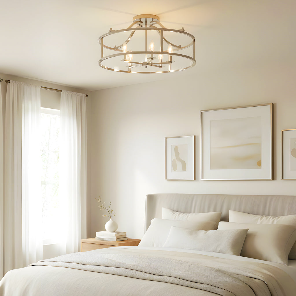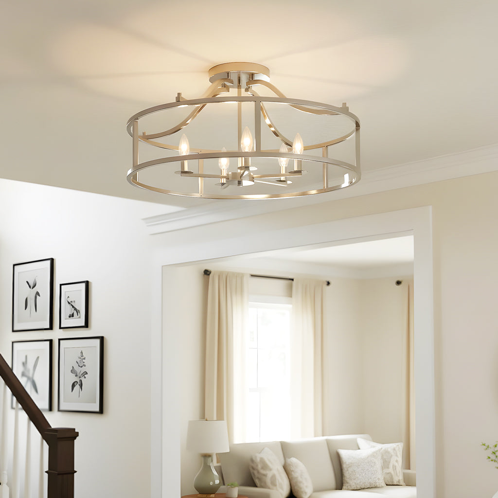 Made of durable steel with an open-frame caged drum design, it offers a modern, airy look. Exposed candelabra sockets provide a timeless touch and fill the room with warm ambient light. Designed for dry indoor areas like bedrooms, entryways, and living rooms.
