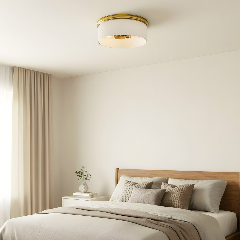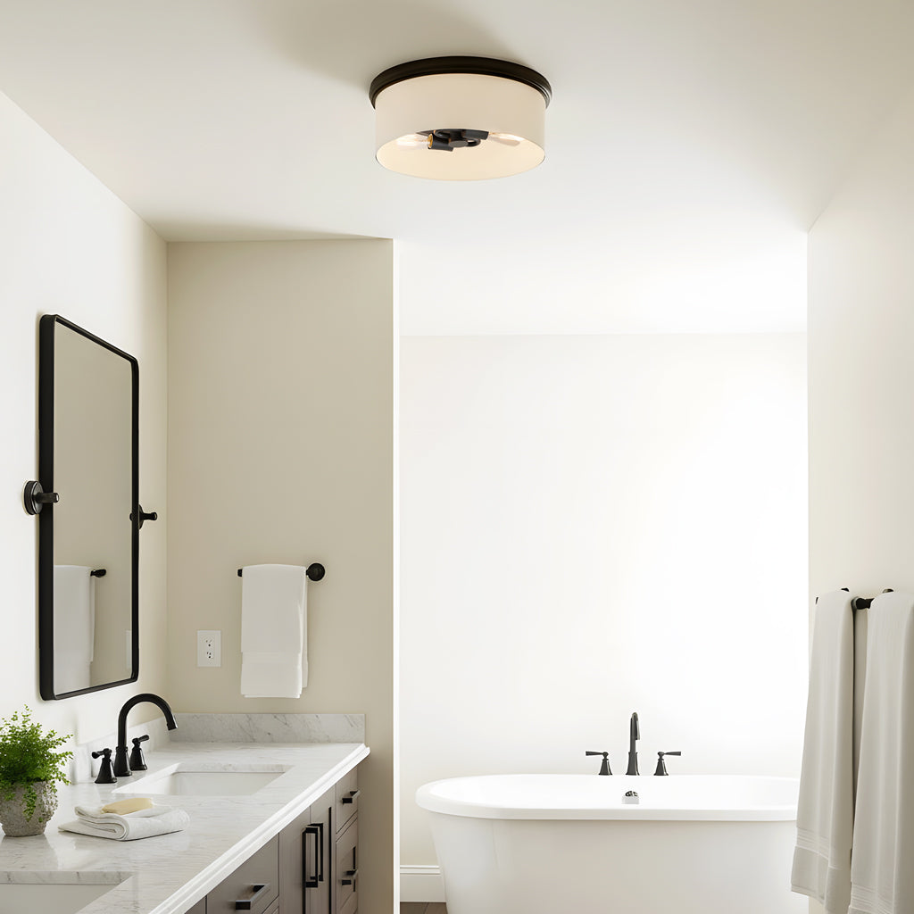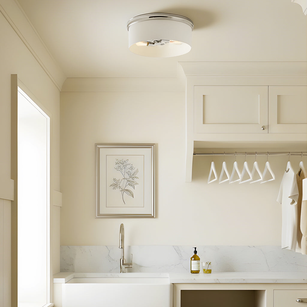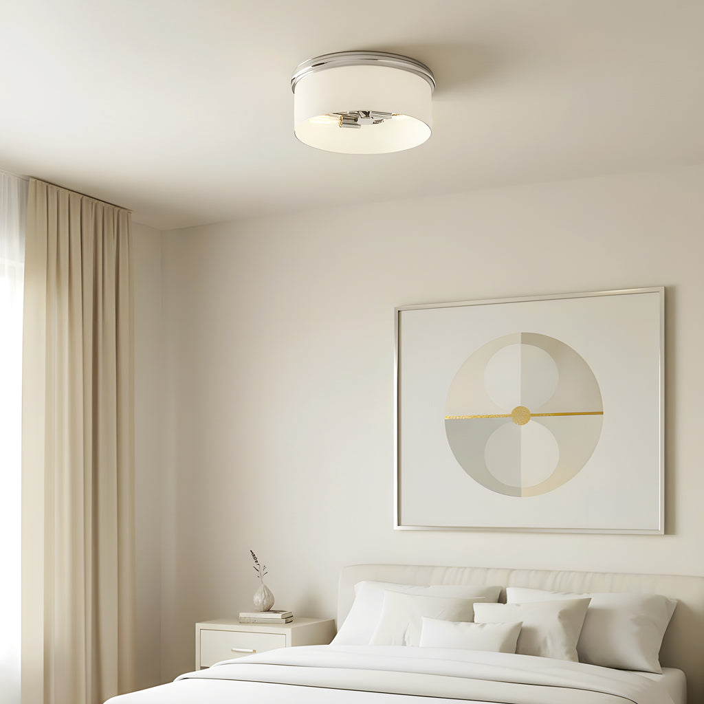 Bring a touch of modern glam to your ceiling with this sleek flush mount light. Featuring a glossy white drum shade paired with a milk glass rim and hardware, this fixture adds warmth and elegance to any room. The exposed bulbs create a soft ambient glow while keeping the look stylish and minimal.