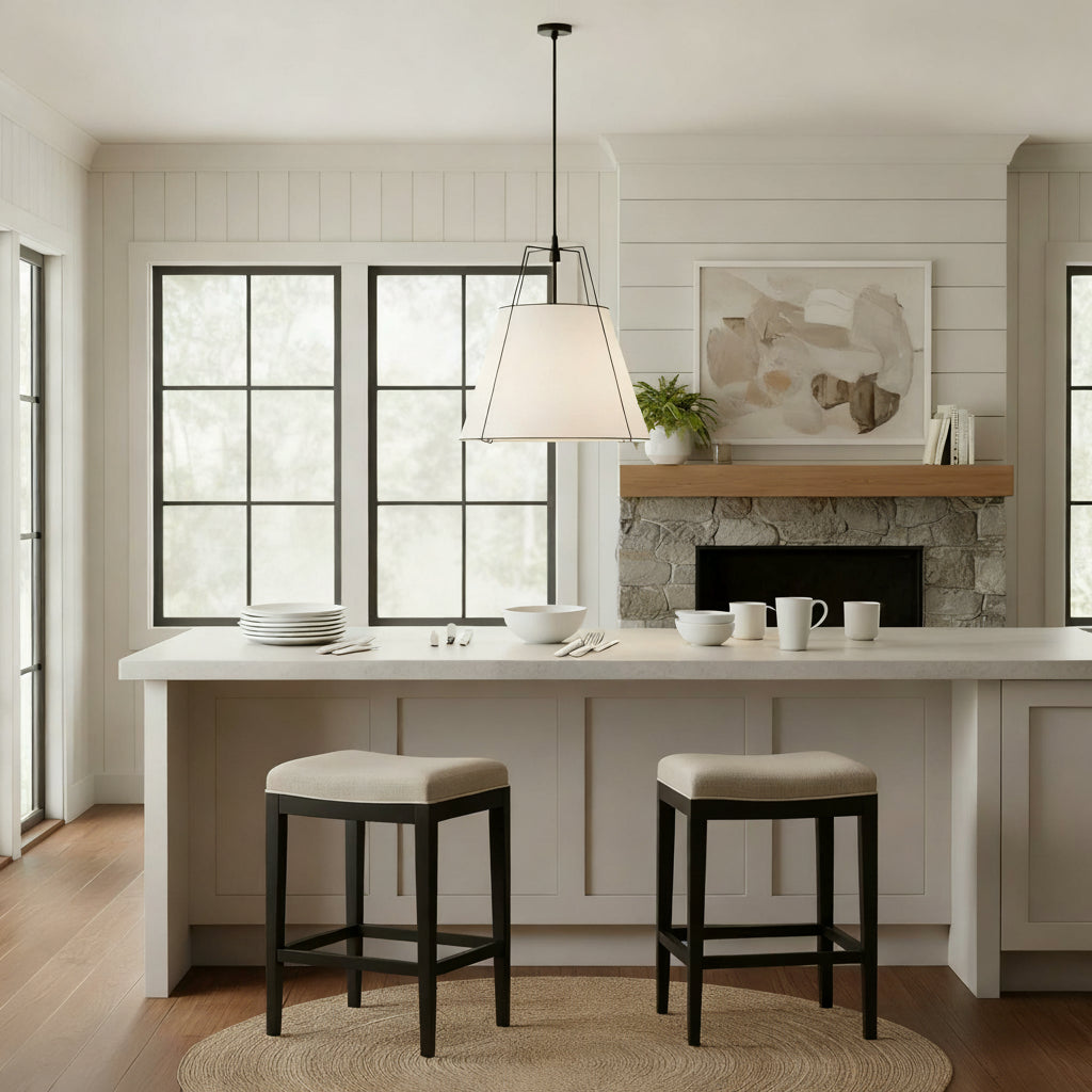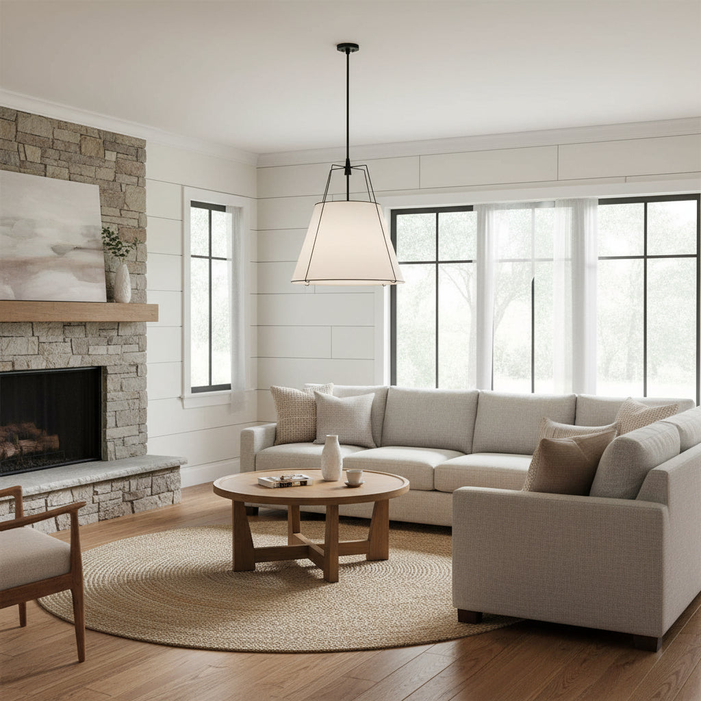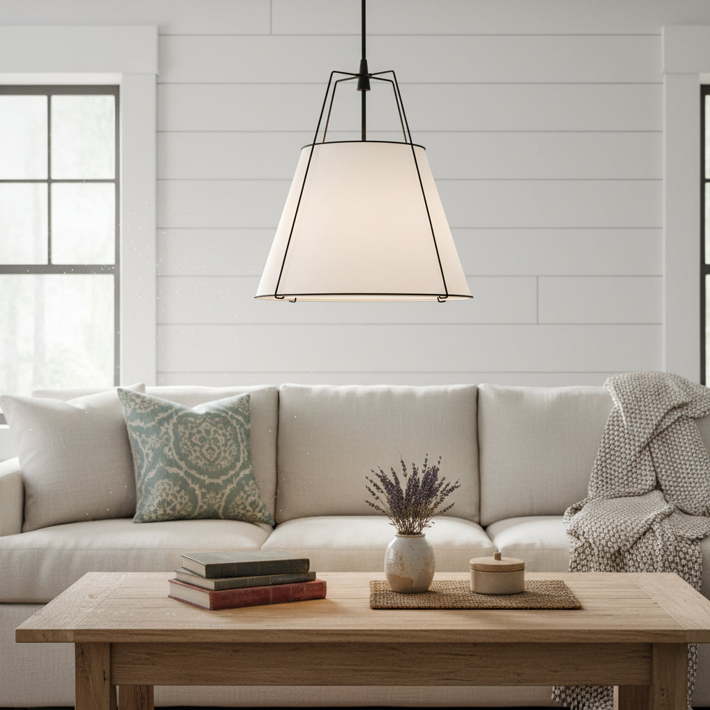 The Lethe Pendant Light combines a sleek drum silhouette with a soft fabric shade, casting a warm, inviting glow. Its versatile design with adjustable hanging height makes it ideal for dining rooms, living areas, or bedrooms.