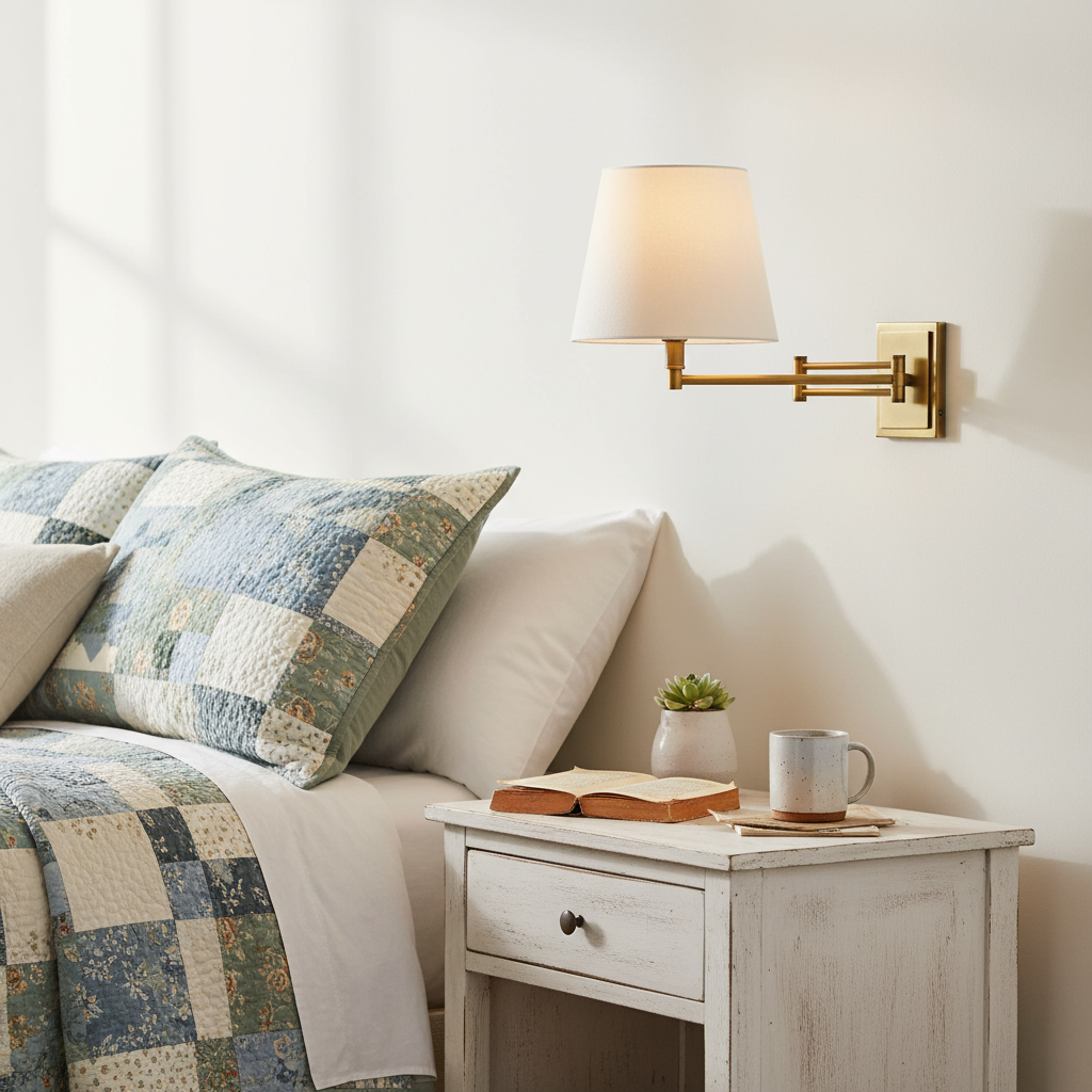 The Evarne Wall Sconce features a movable arm and crisp linen shade, blending style with functionality. Perfect for bedrooms, reading corners, or cozy living spaces.