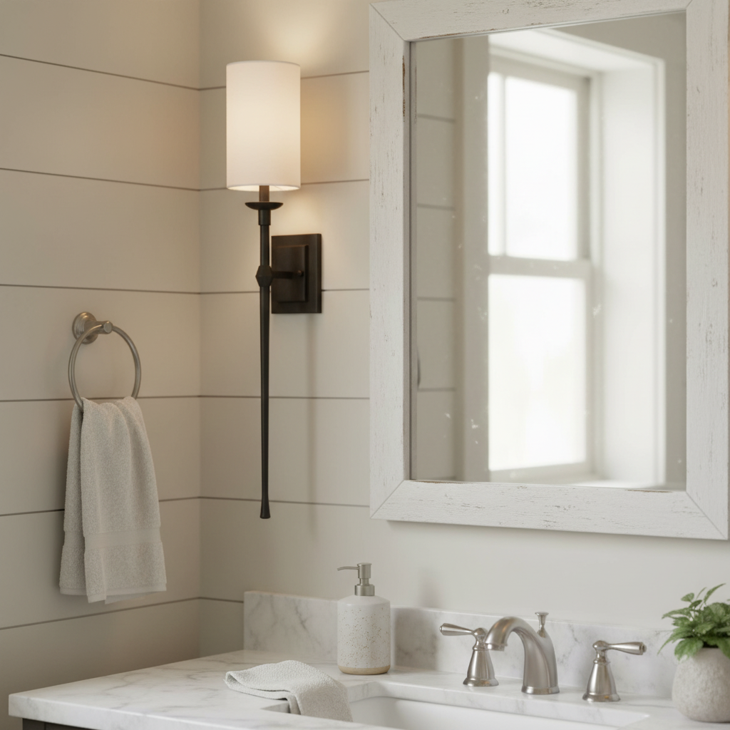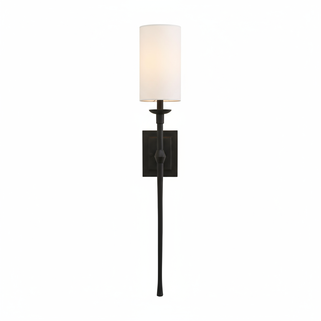 This wall sconce features a slim metal body paired with a soft fabric shade, offering timeless elegance and warm ambient lighting for any space.