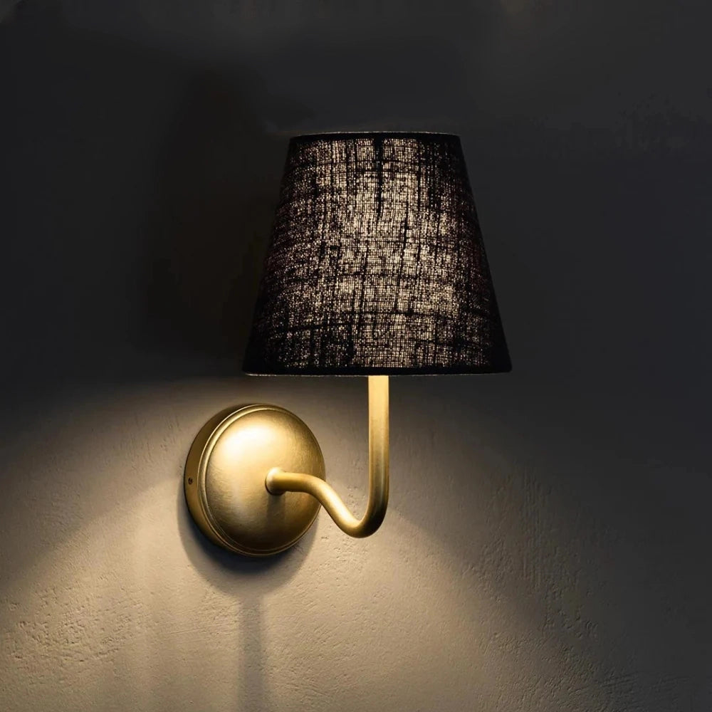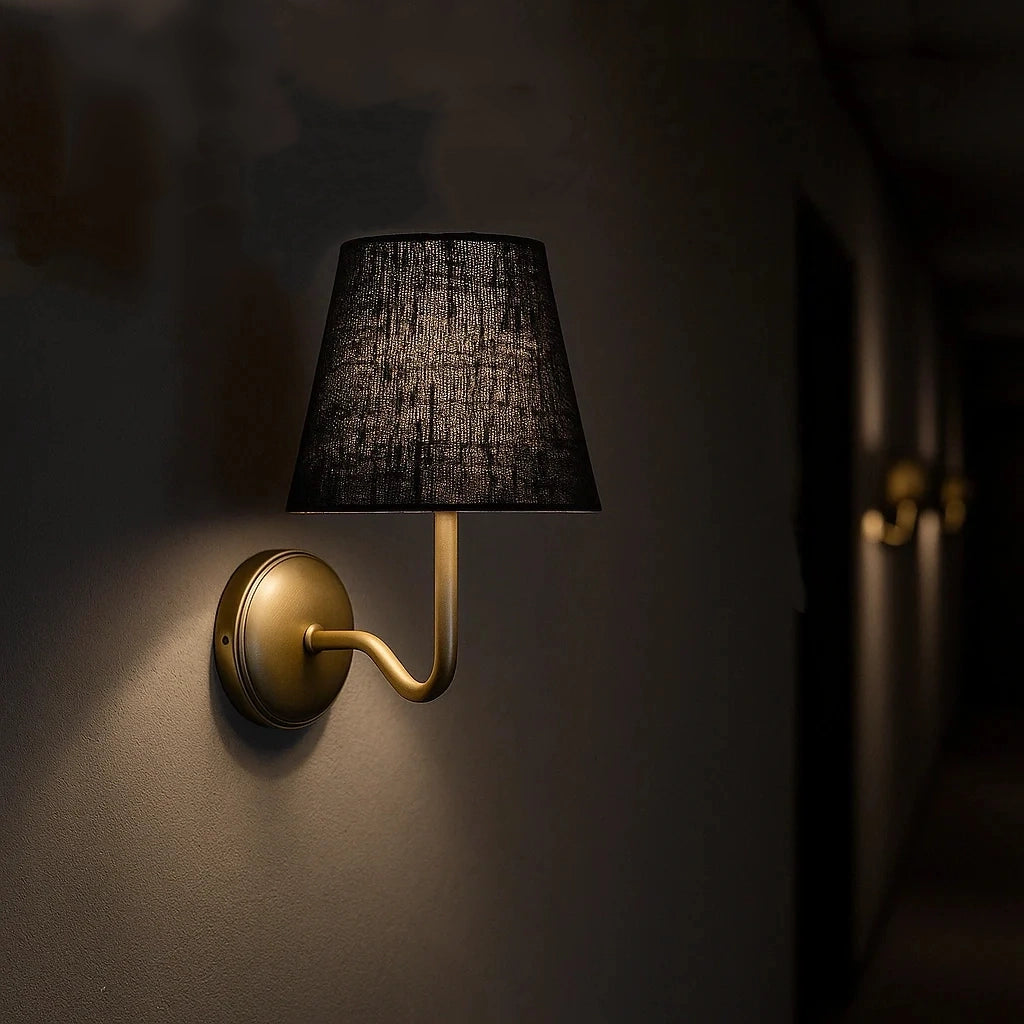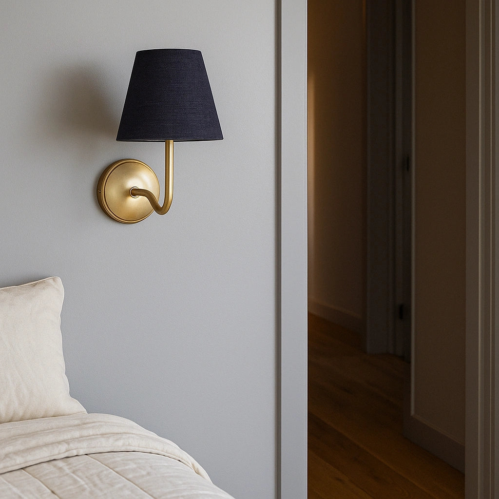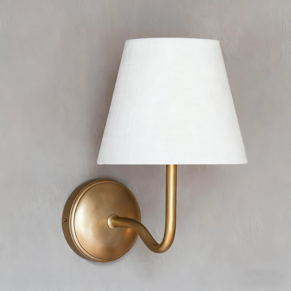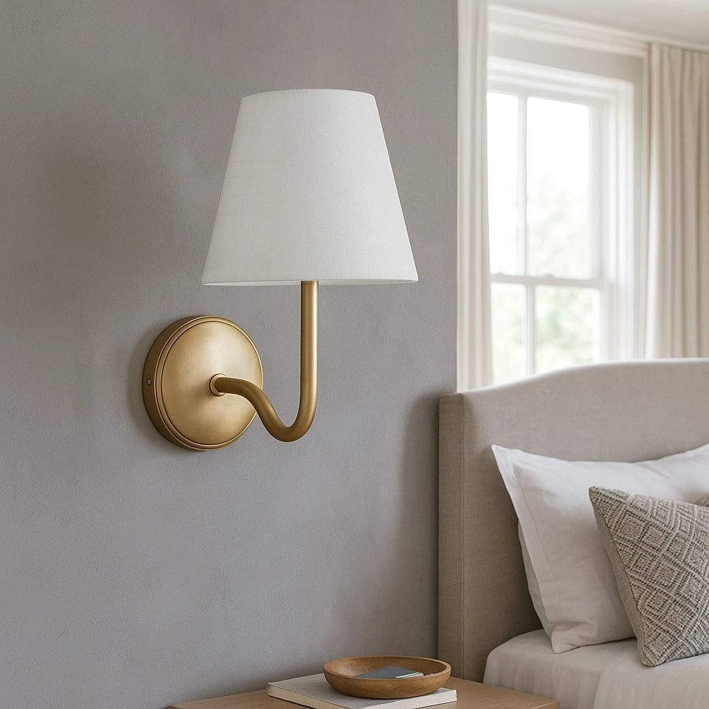 Lyra Classic Brass Arm Wall Sconce features a curved brass arm and a fabric lampshade. It emits warm light, blending classic charm with modern elegance.