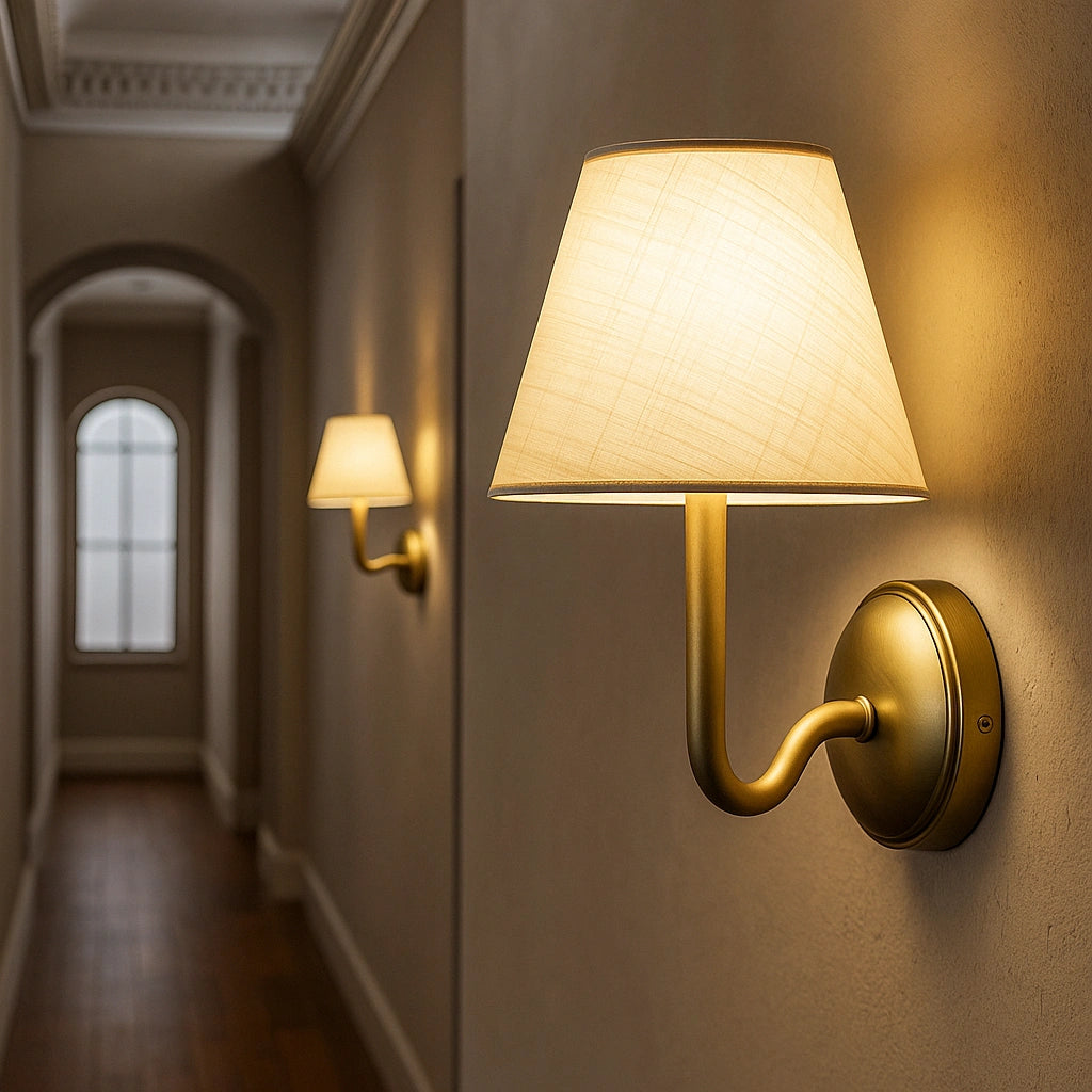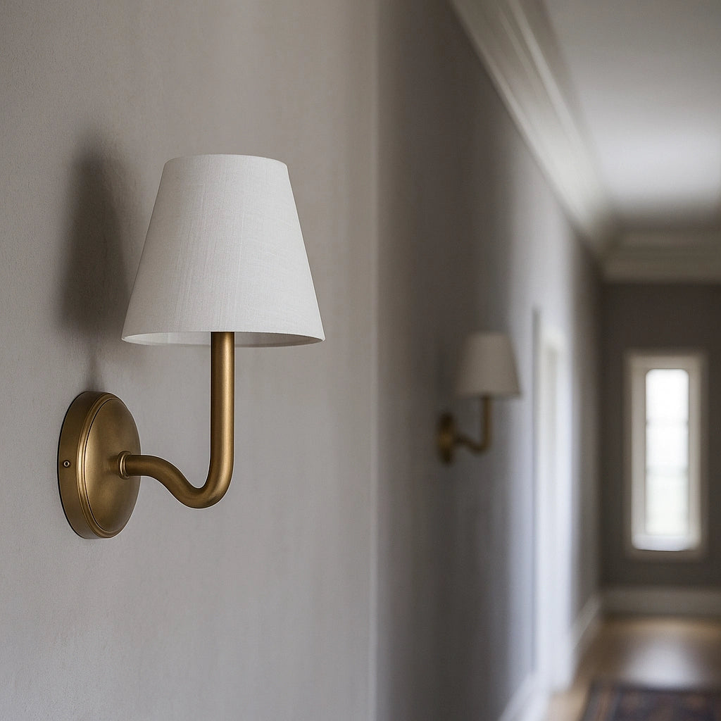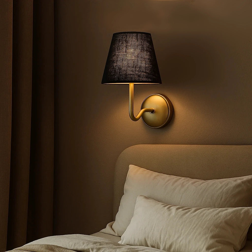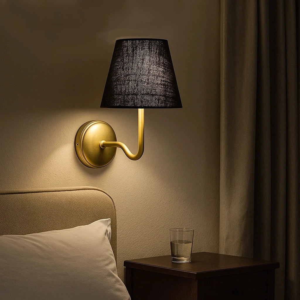 Lyra Classic Brass Arm Wall Sconce features a curved brass arm and a fabric lampshade. It emits warm light, blending classic charm with modern elegance.