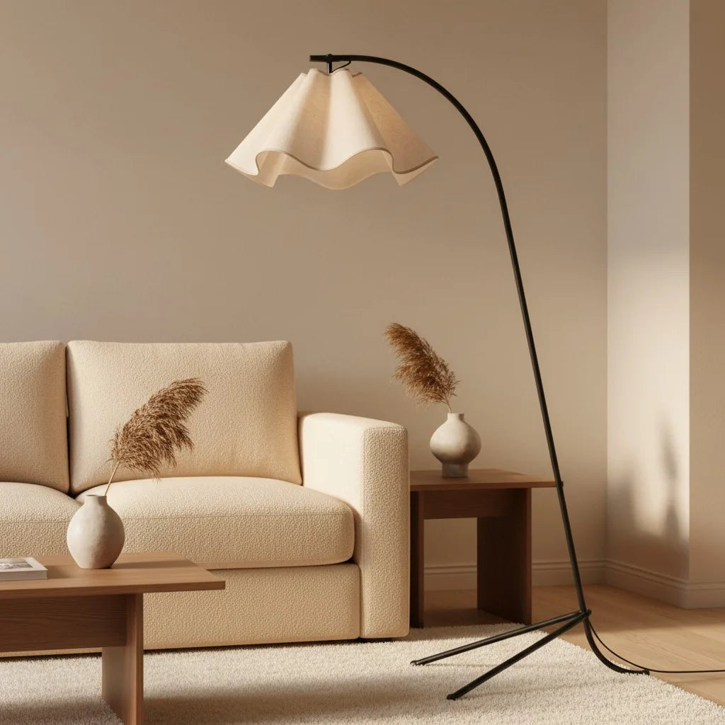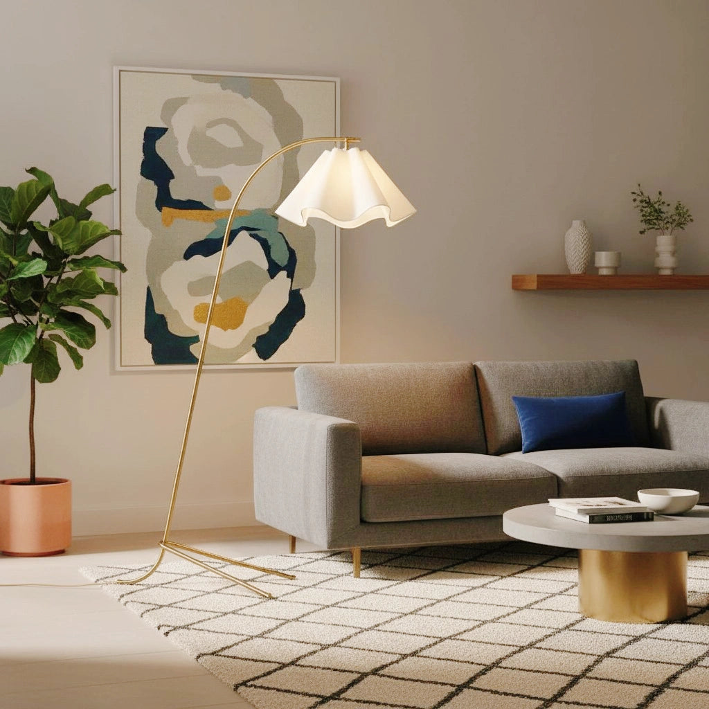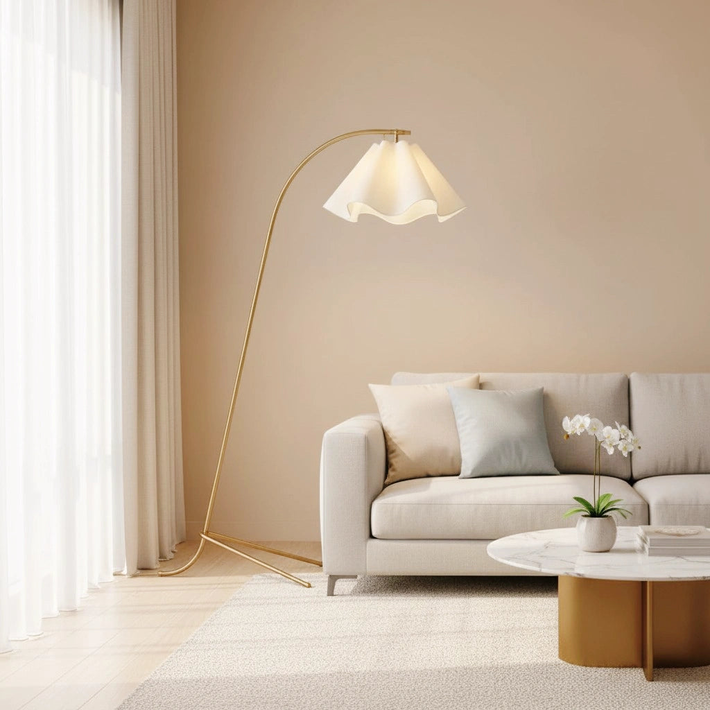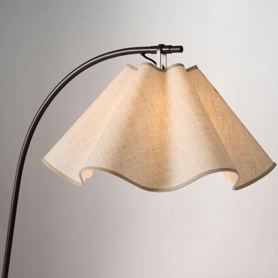 This floor lamp features a unique pleated fabric upholstery for a contemporary look. Its design adds a touch of understated elegance to any space.