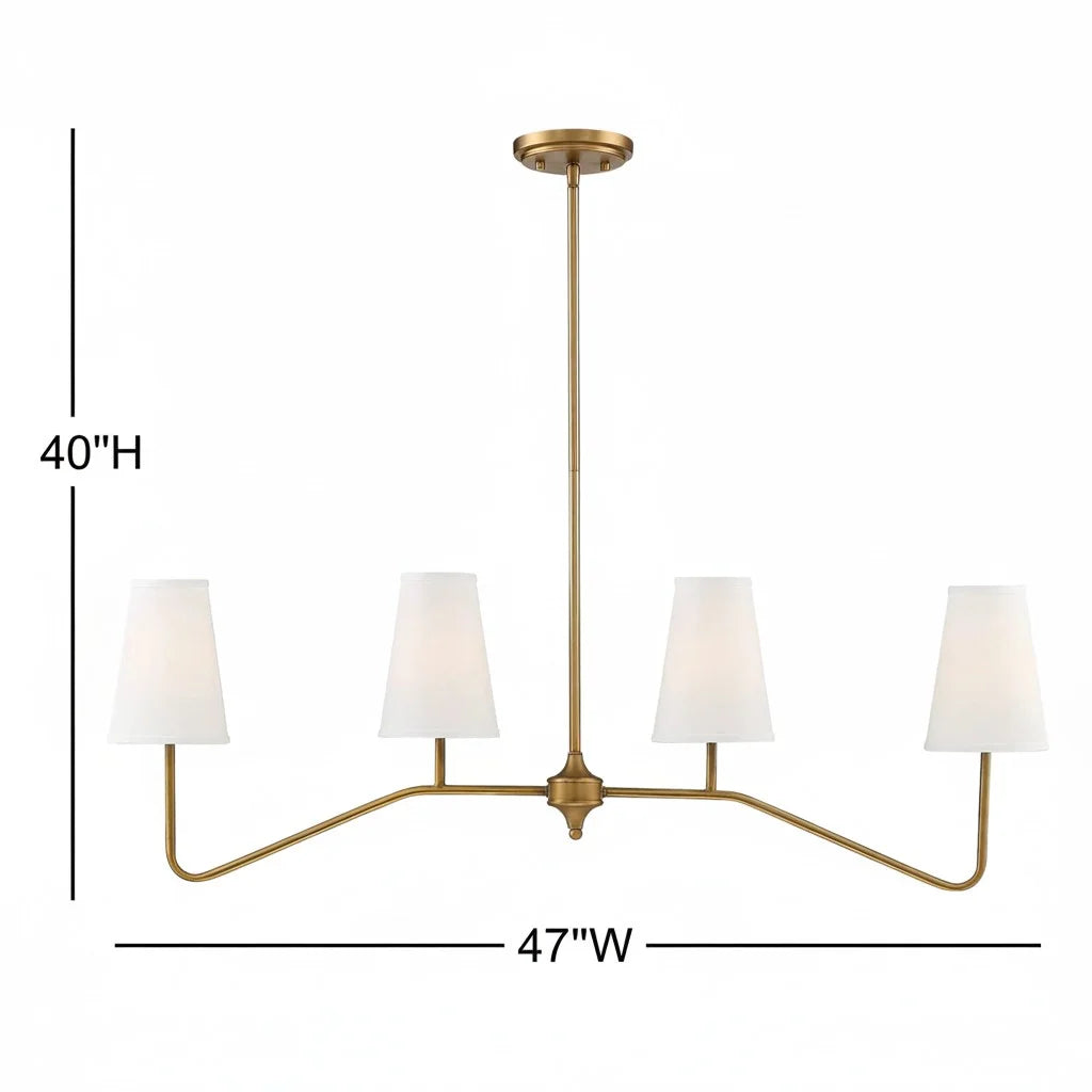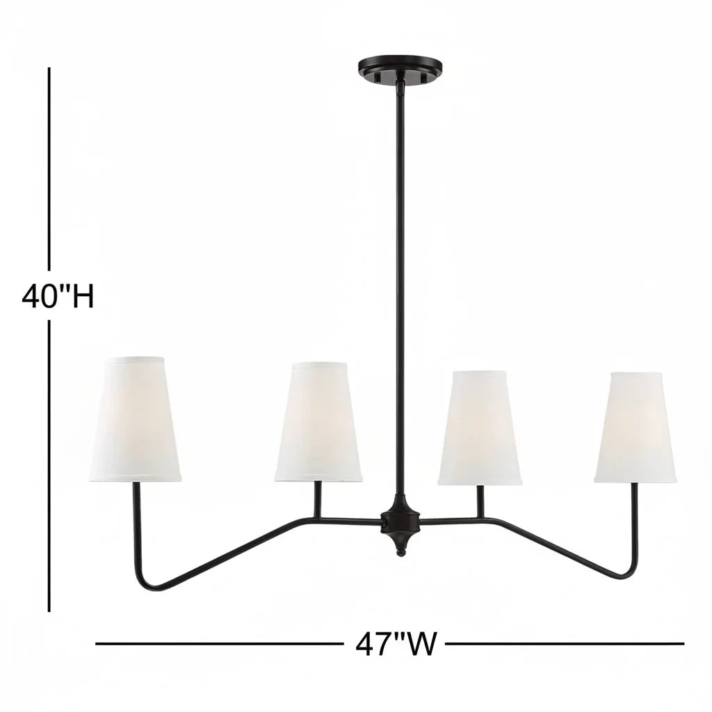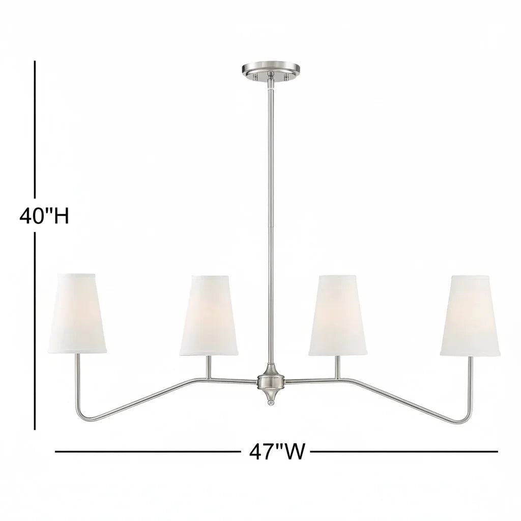 This 4-light kitchen island pendant reimagines the classic chandelier with a modern twist, perfect for elevating French country interiors. Crafted from sturdy metal, it features two gracefully curved arms, each holding a pair of candle-style lights. Soft white bell-shaped fabric shades gently diffuse the light, bringing warmth and elegance to your kitchen or dining space.