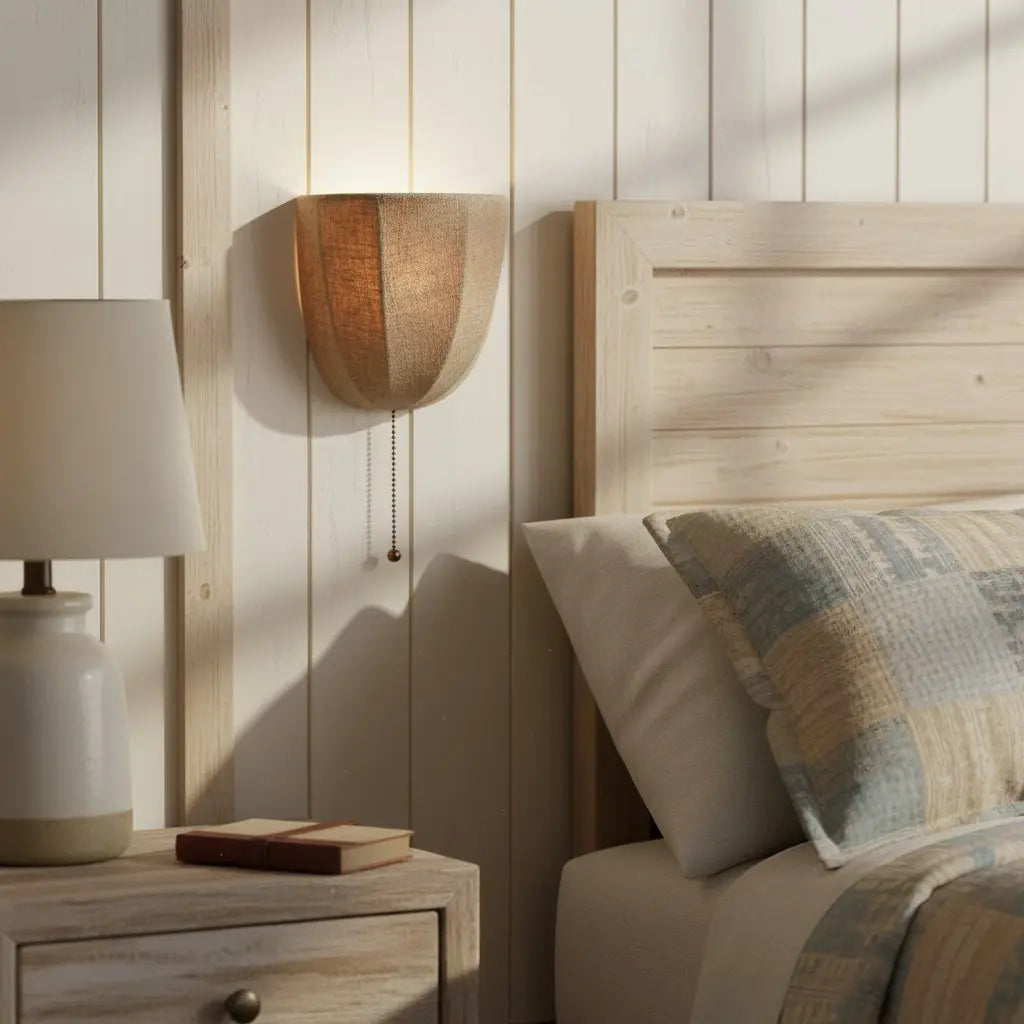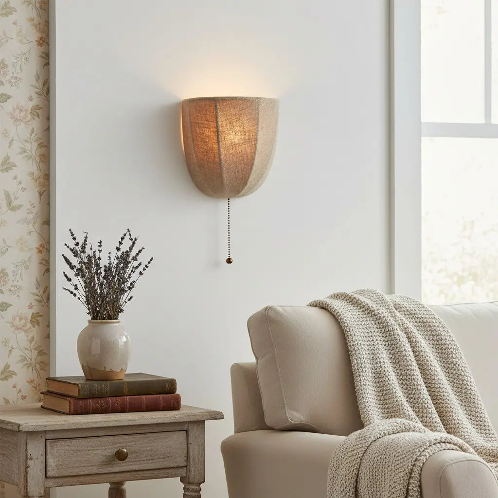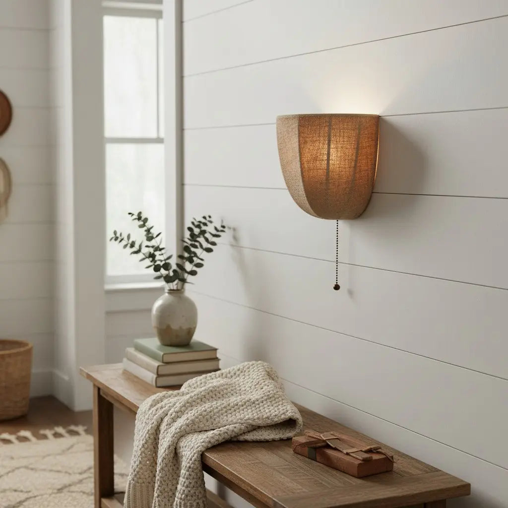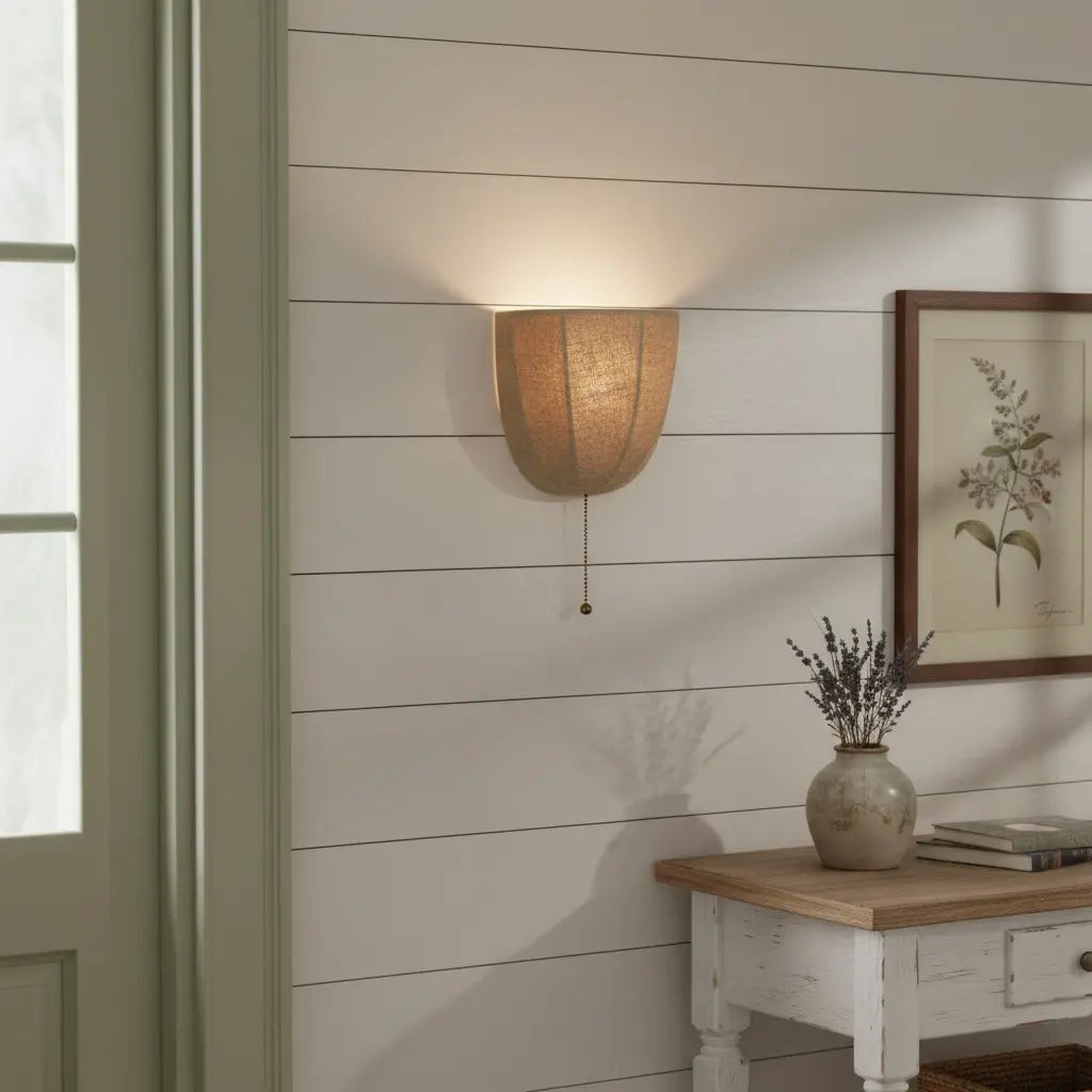 This rustic wall sconce features a natural linen shade and a dangling chain detail, blending organic texture with relaxed charm. Ideal for bedroom walls, entry corridors or living room nooks.