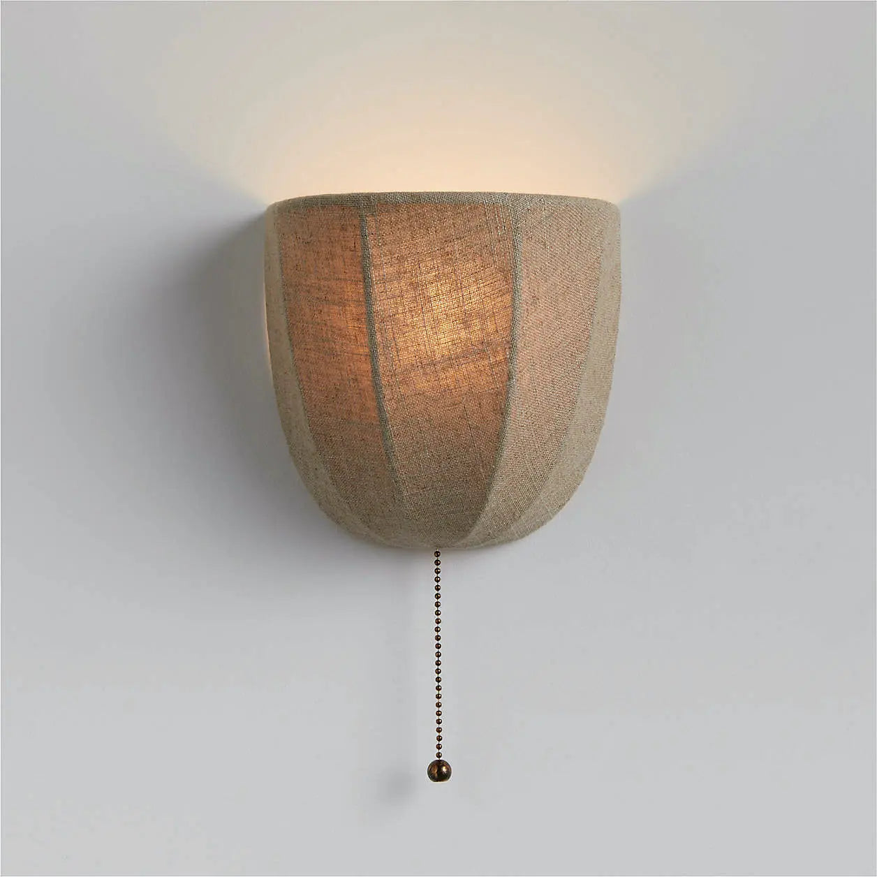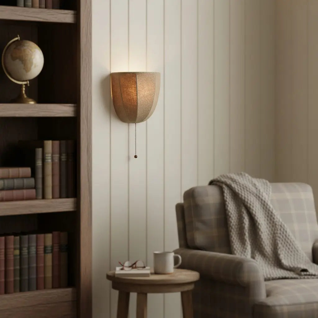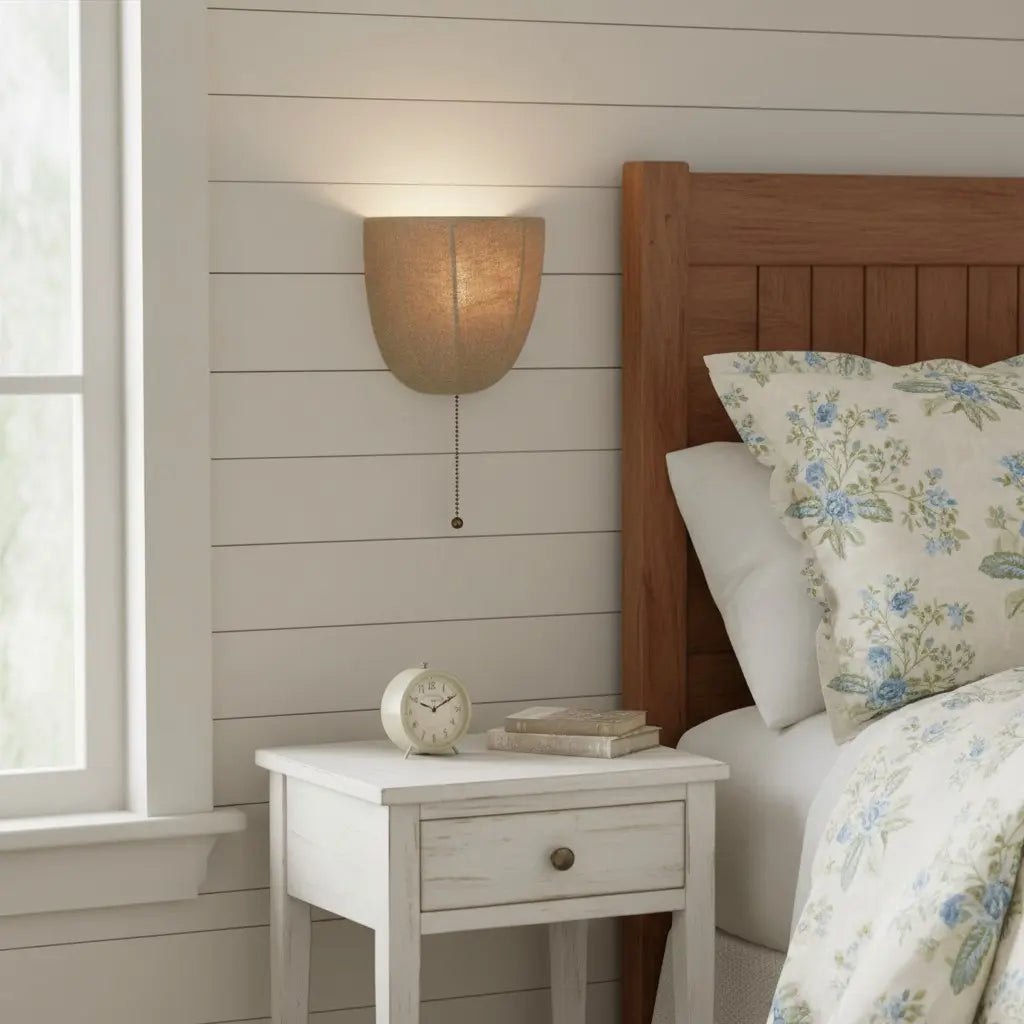 This rustic wall sconce features a natural linen shade and a dangling chain detail, blending organic texture with relaxed charm. Ideal for bedroom walls, entry corridors or living room nooks.