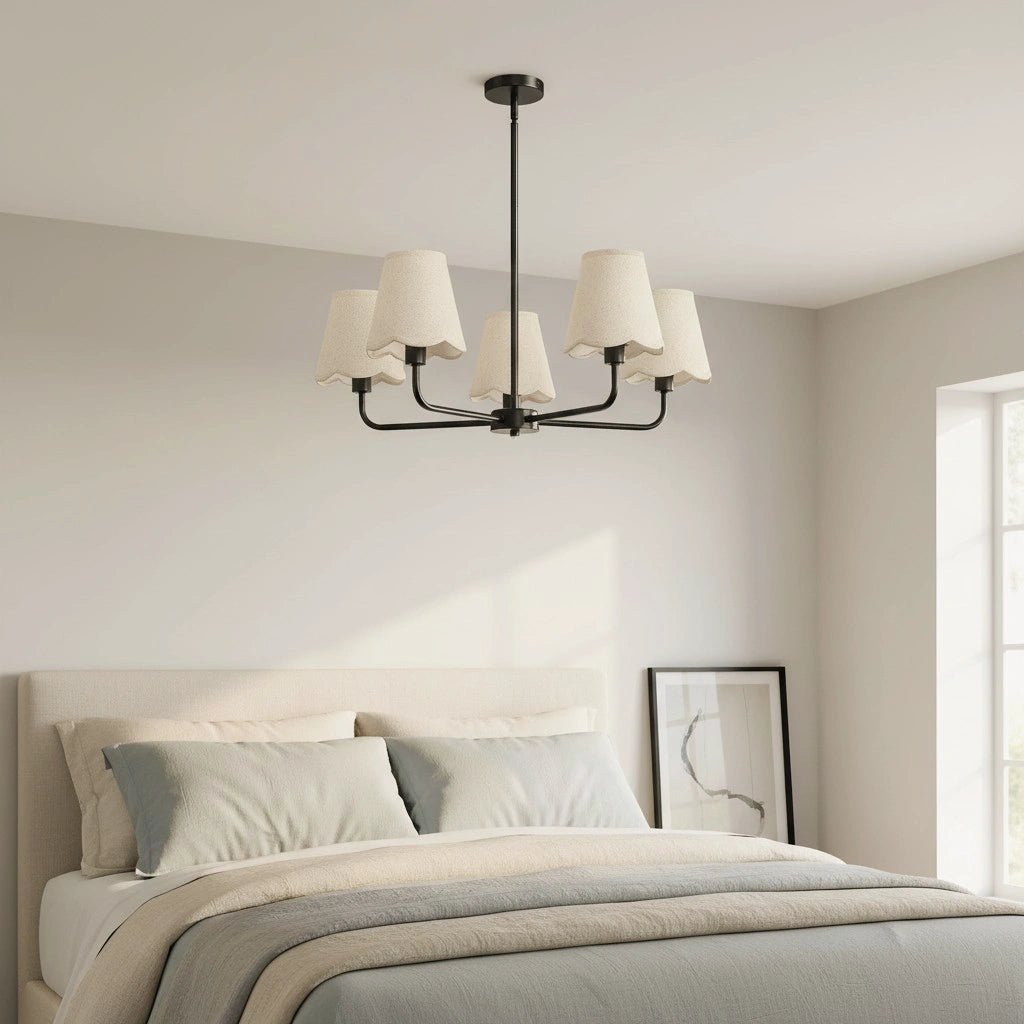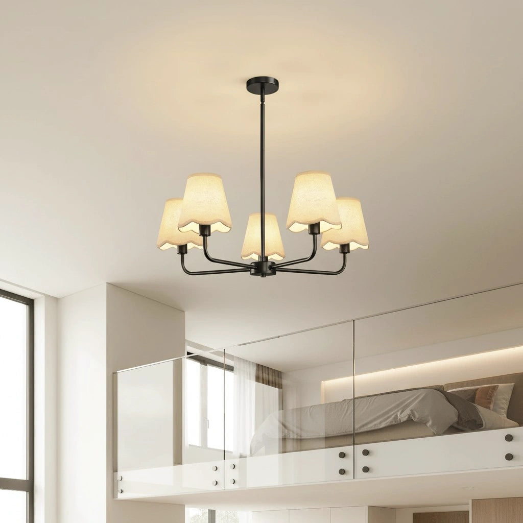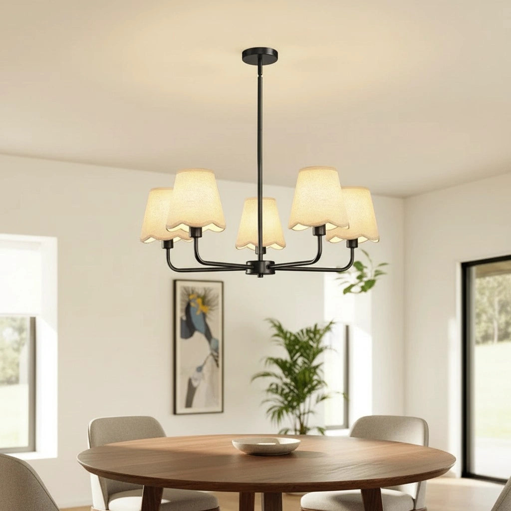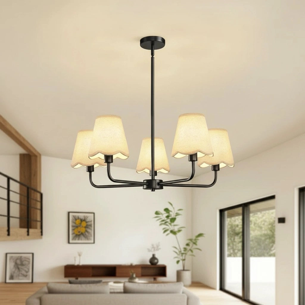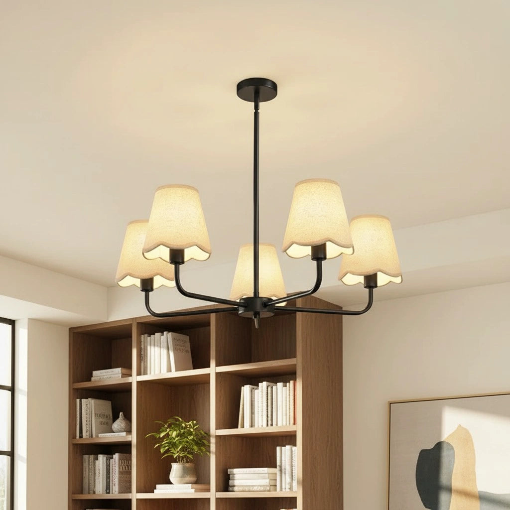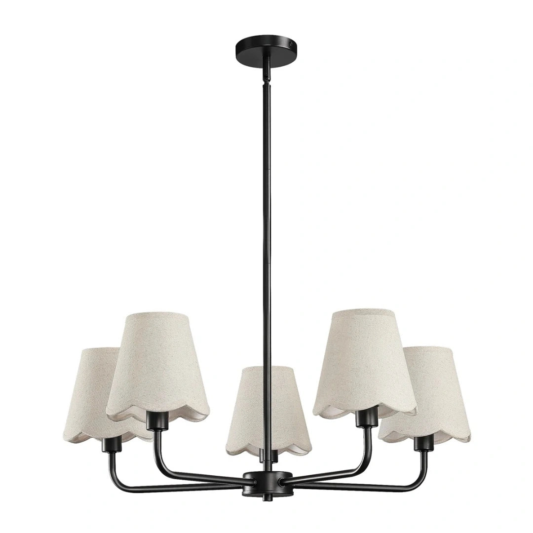 This multi-arm chandelier features a unique modern design, with the wavy edges of the white fabric lampshade adding a touch of dynamism and sophistication. Its robust and durable construction makes it suitable for dining rooms, bedrooms, or living rooms.