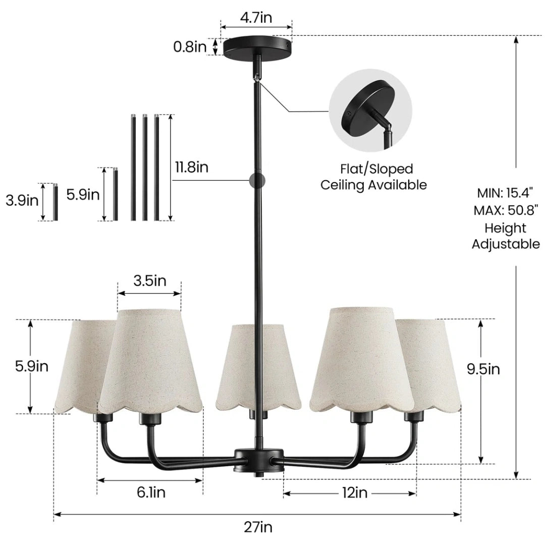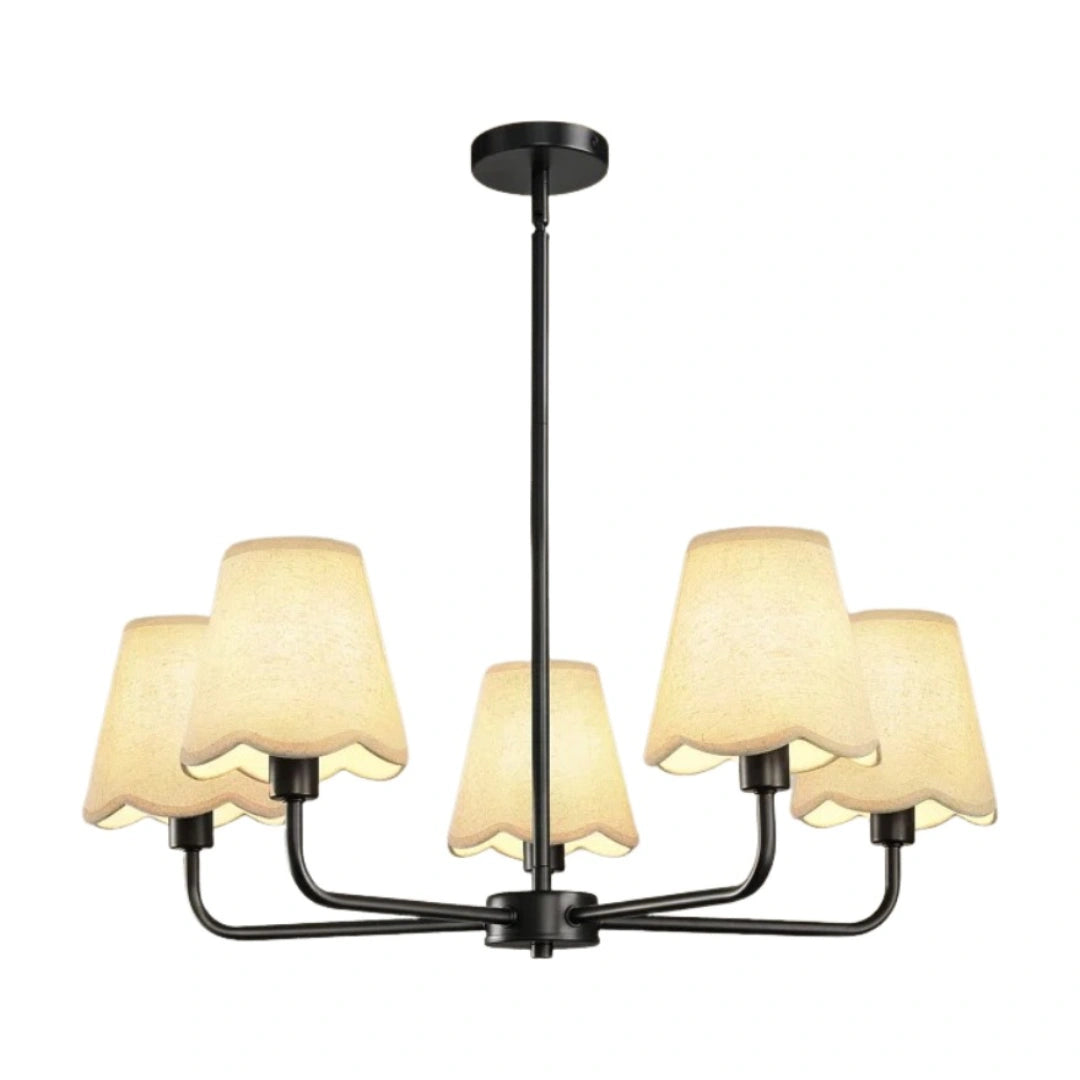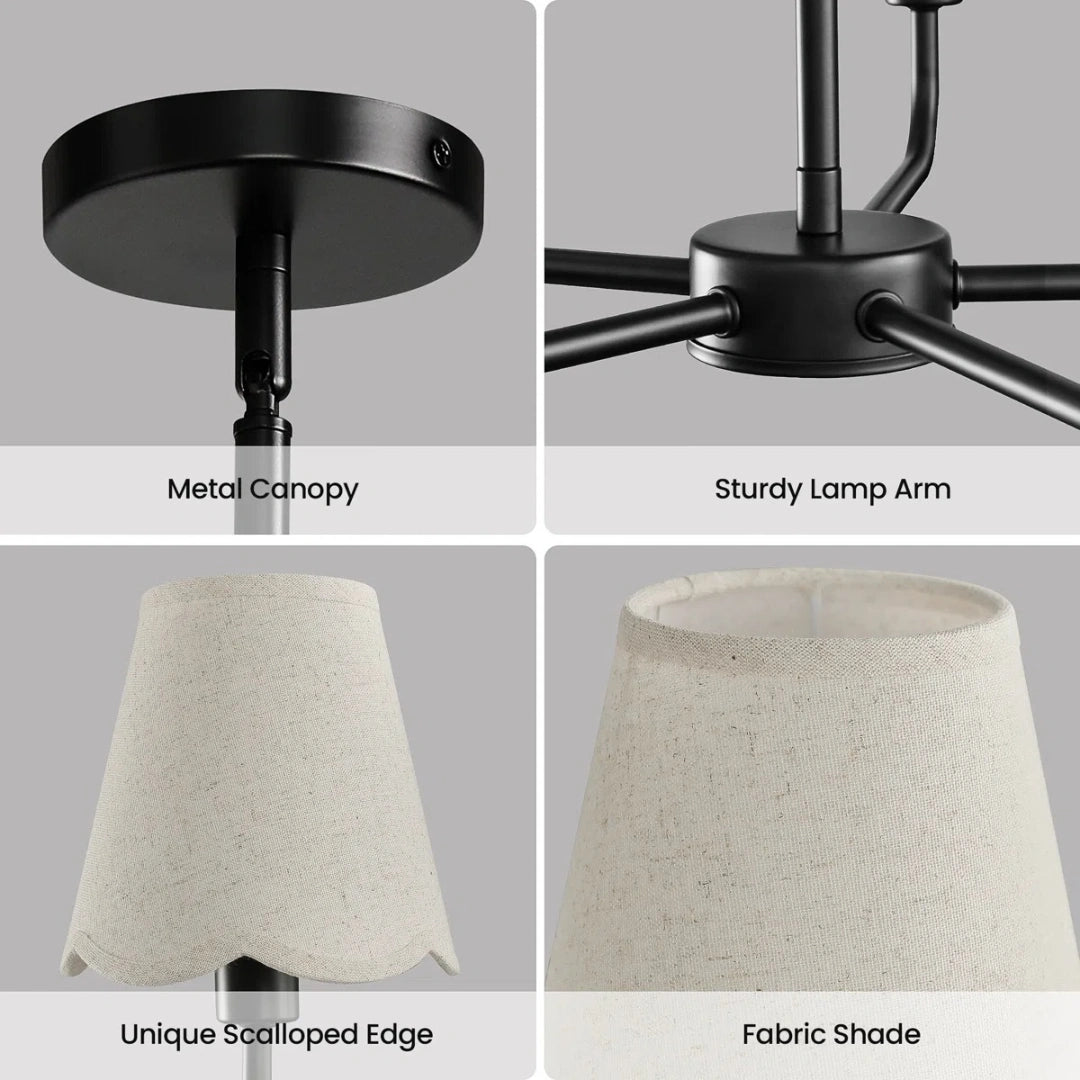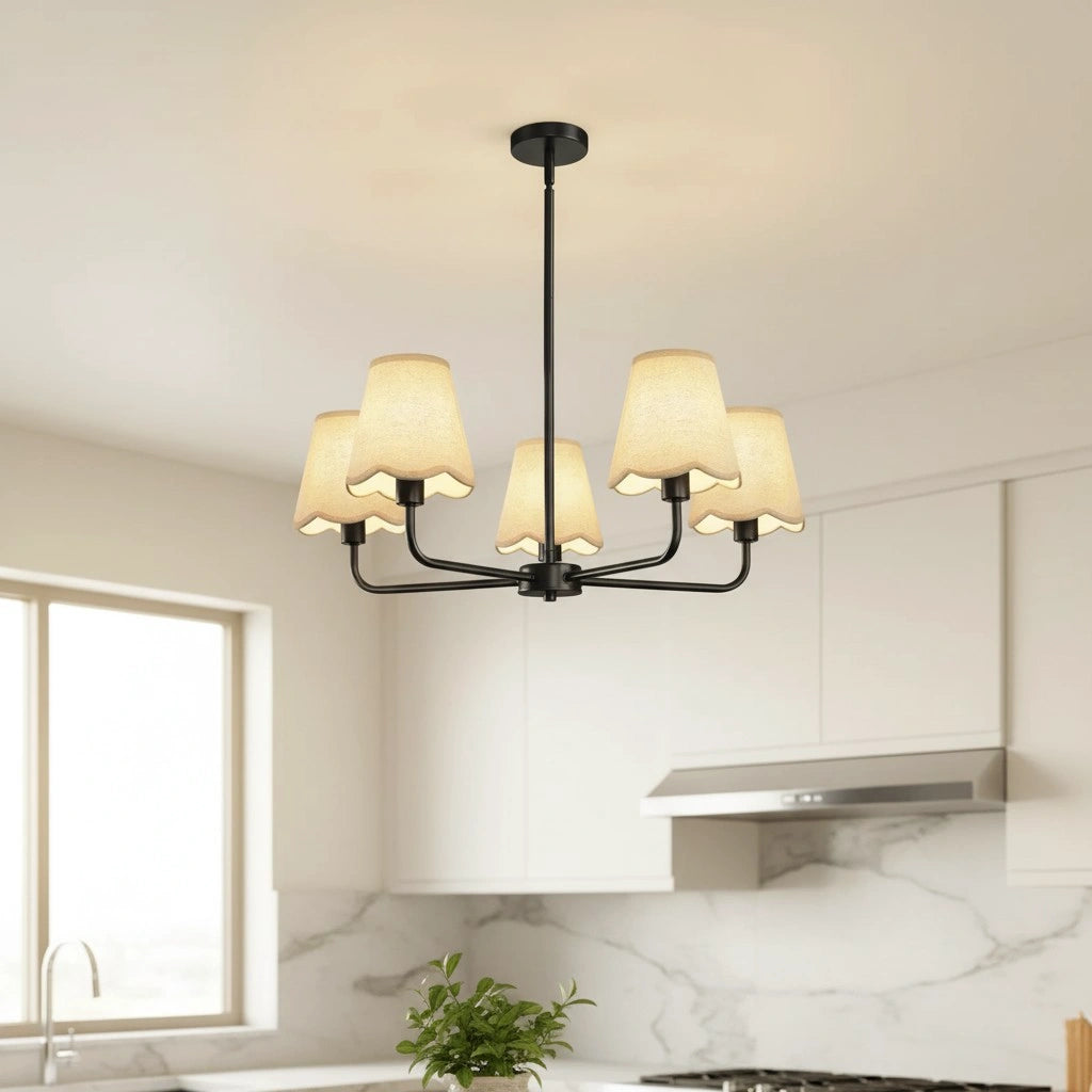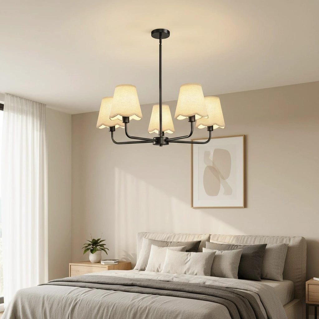This multi-arm chandelier features a unique modern design, with the wavy edges of the white fabric lampshade adding a touch of dynamism and sophistication. Its robust and durable construction makes it suitable for dining rooms, bedrooms, or living rooms.