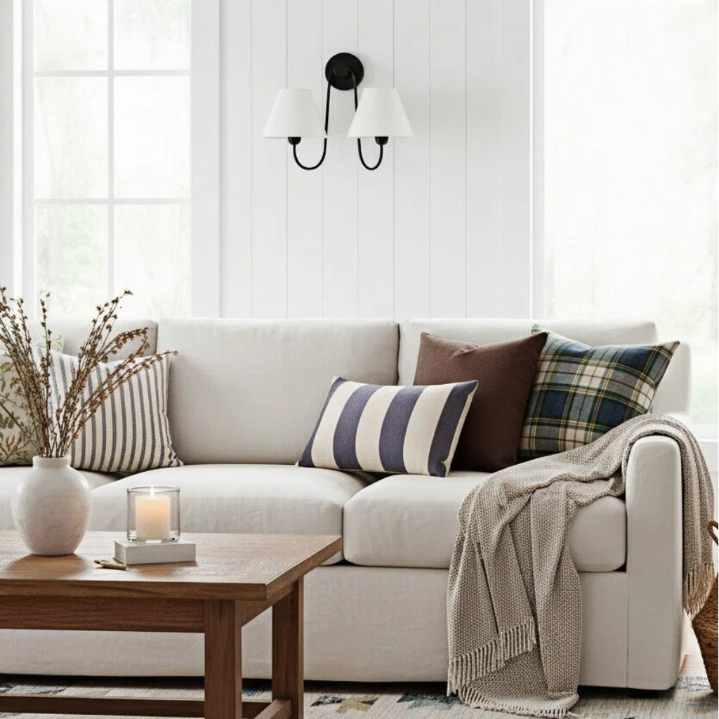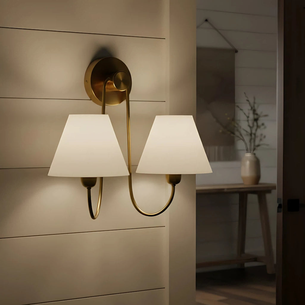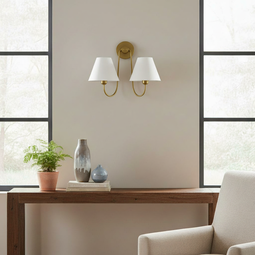 Bring modern elegance to your space with this swoop arm wall sconce, featuring a crisp linen shade and sleek metal frame. Offered in single or double light versions and two finishes, perfect for living rooms, bedrooms, or hallways.