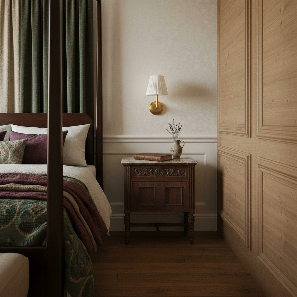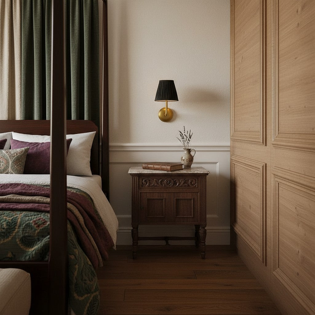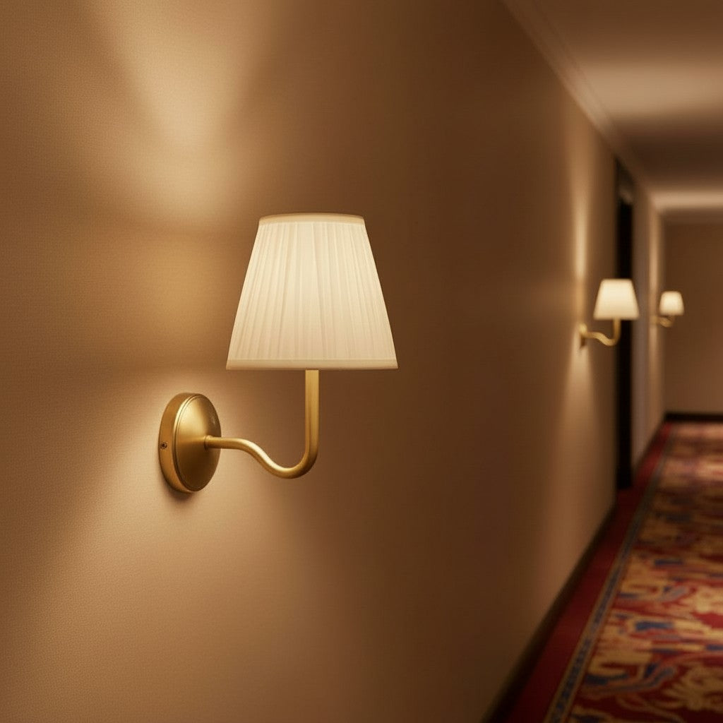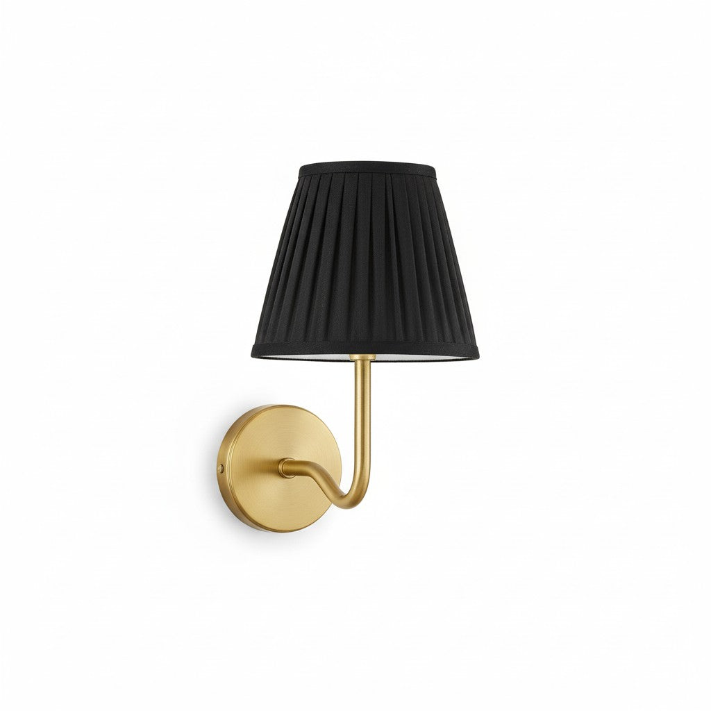 Finn Pleated Shade Brass Arm Wall Sconce showcases a curved brass arm and a pleated fabric shade, blending vintage charm with modern elegance, ideal for enhancing room ambiance.