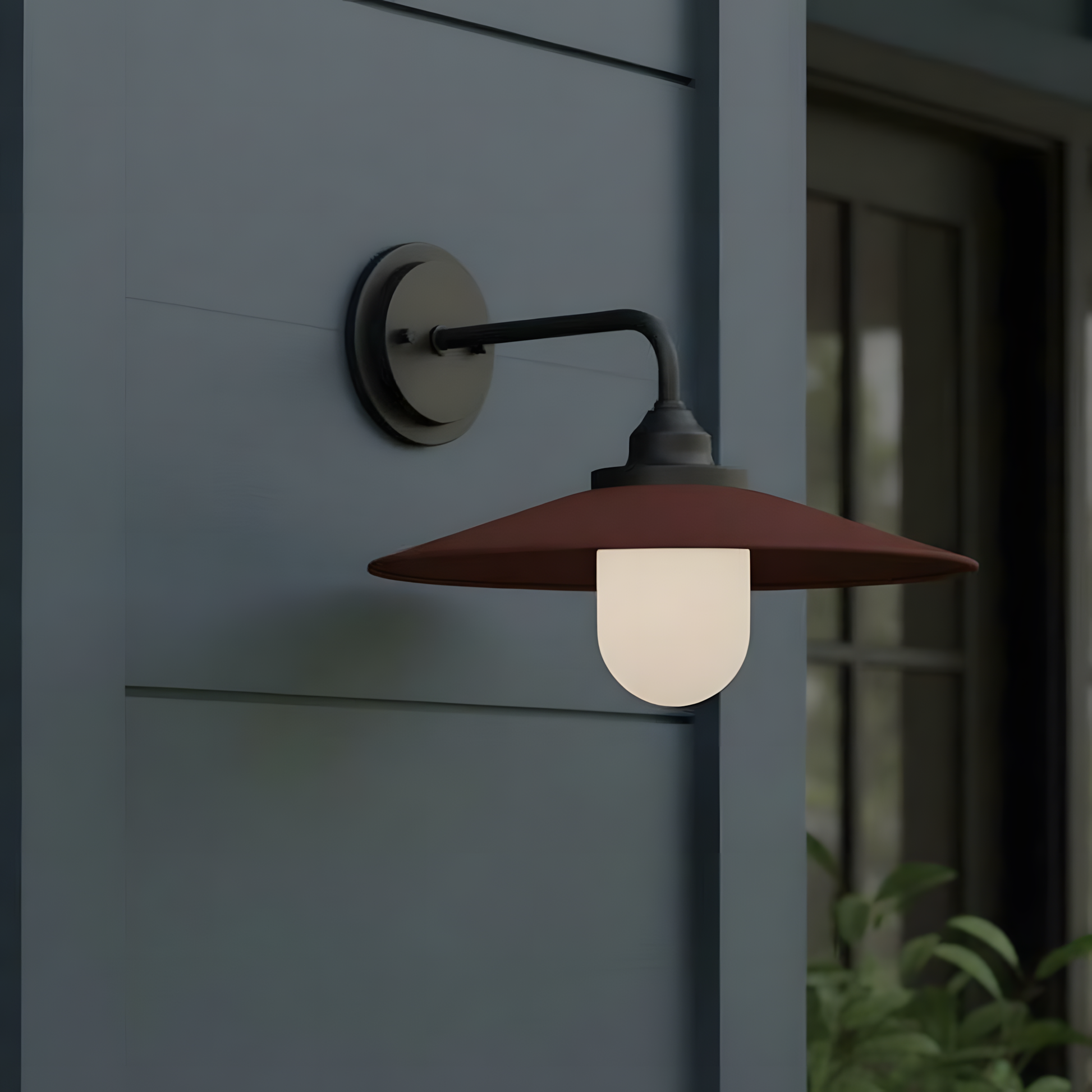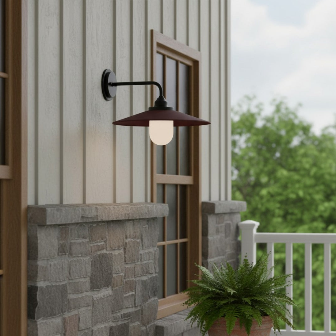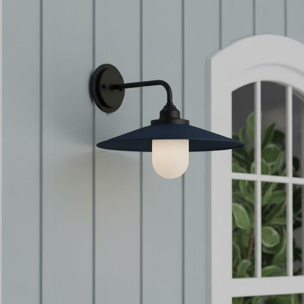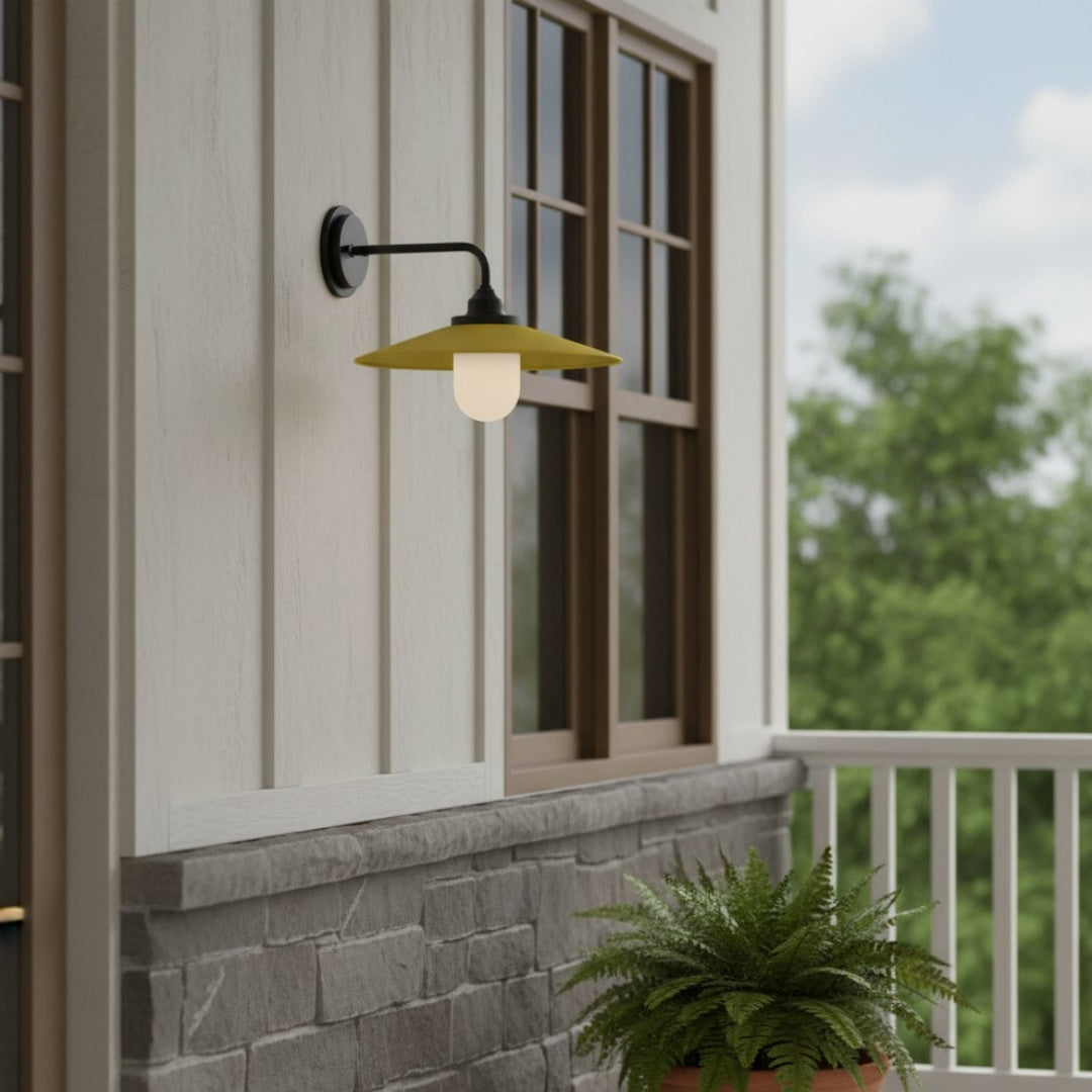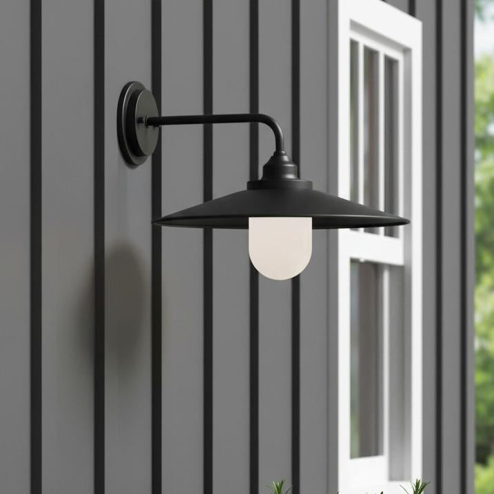 Featuring a wide, flared metal shade and gently curved arm, this fixture is available in multiple shade and finish combinations to suit any exterior decor. Whether mounted on porches, patios, or entryways, it combines classic design with durable construction for lasting performance in all weather conditions.