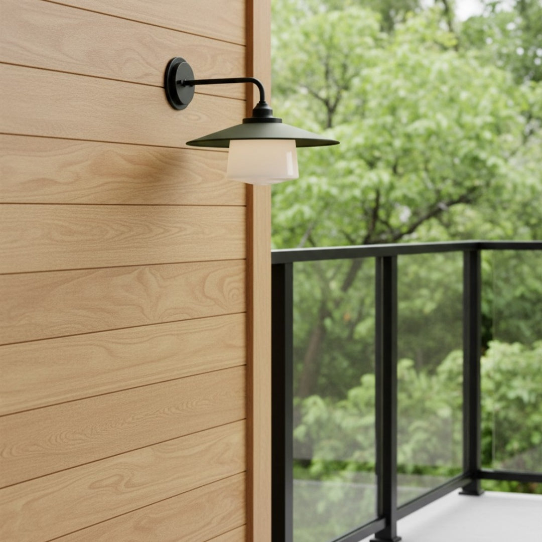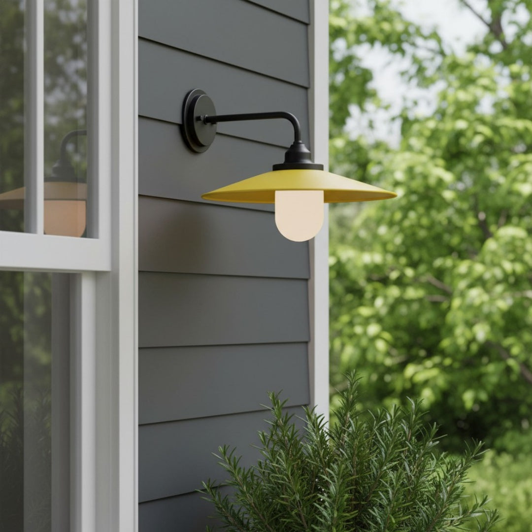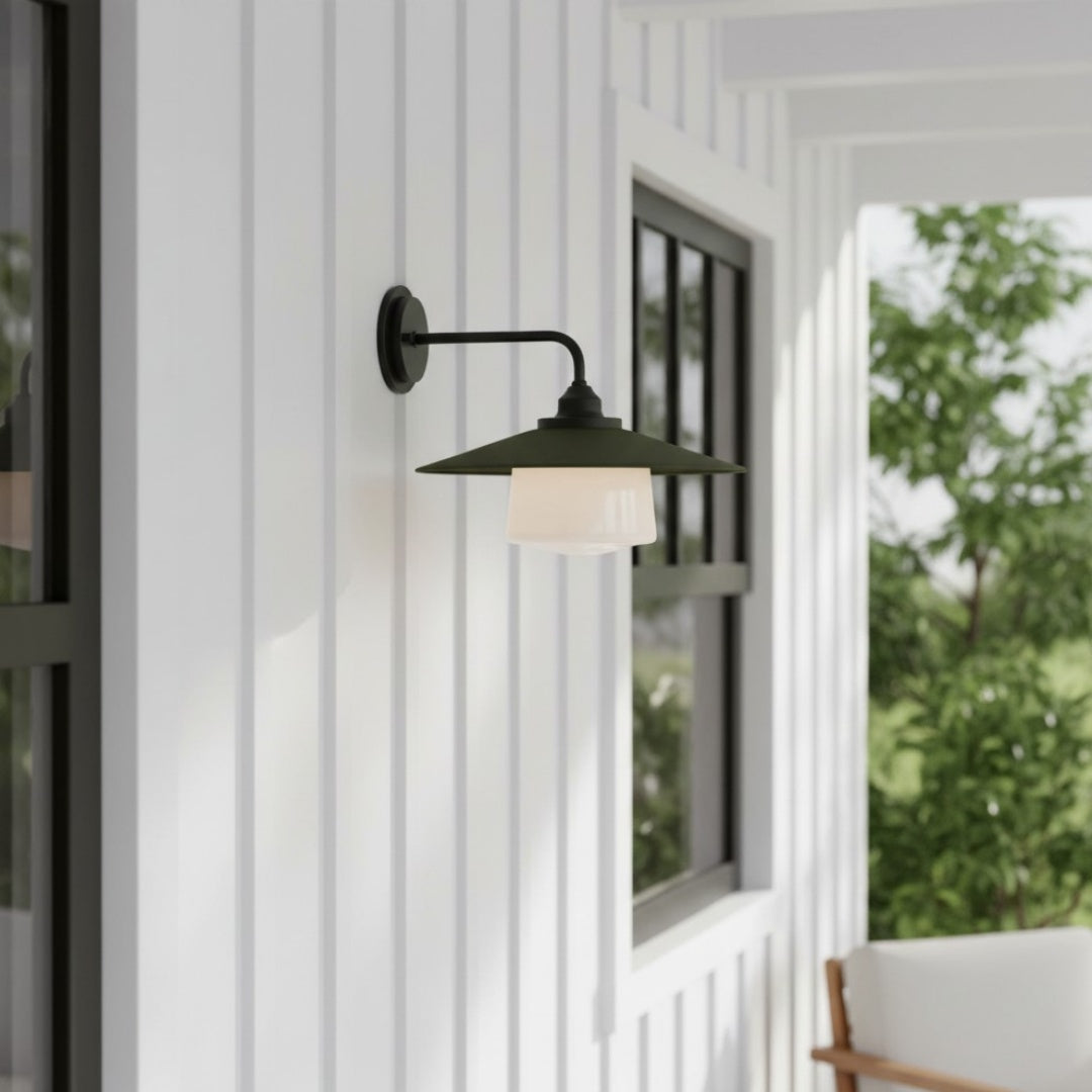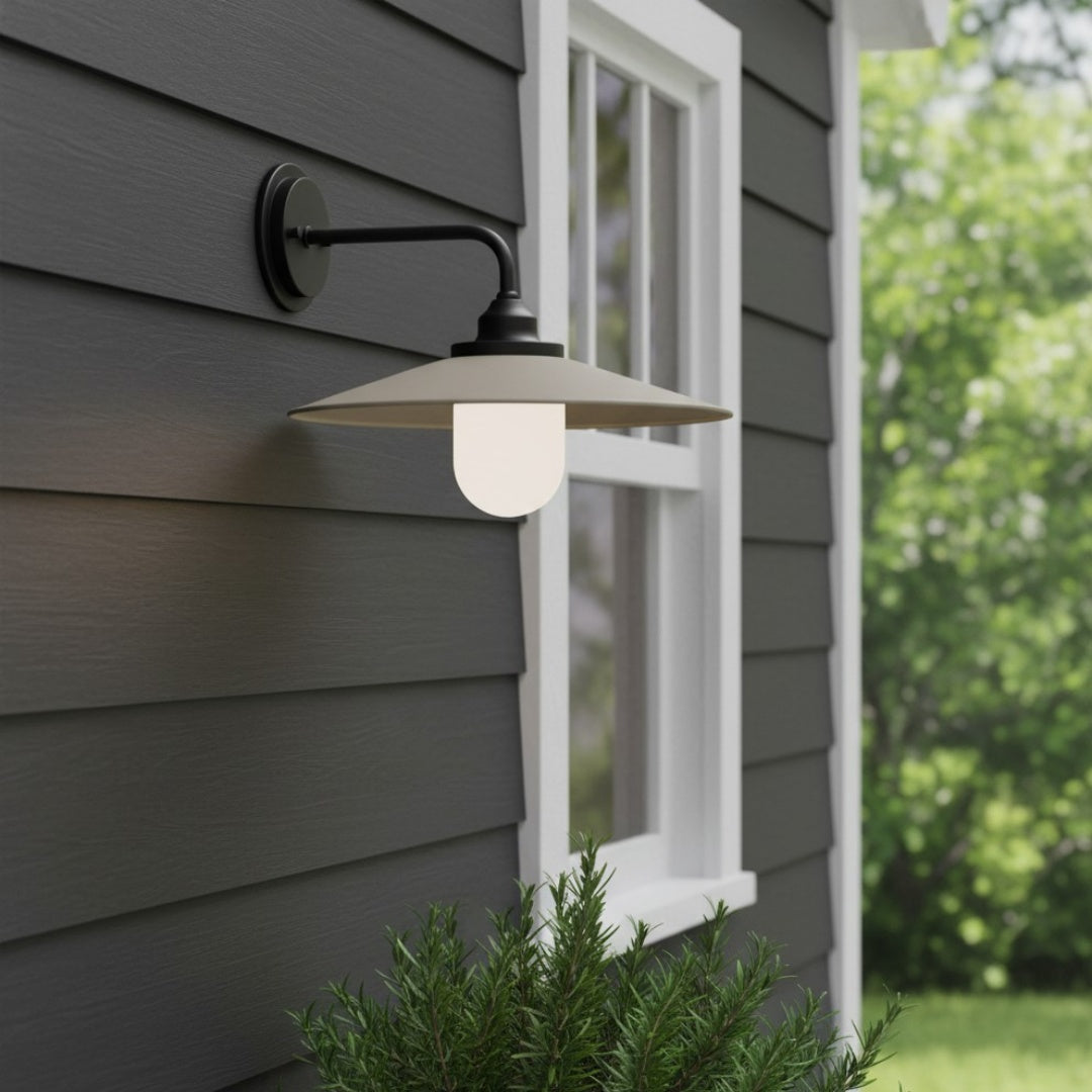 Featuring a wide, flared metal shade and gently curved arm, this fixture is available in multiple shade and finish combinations to suit any exterior decor. Whether mounted on porches, patios, or entryways, it combines classic design with durable construction for lasting performance in all weather conditions.
