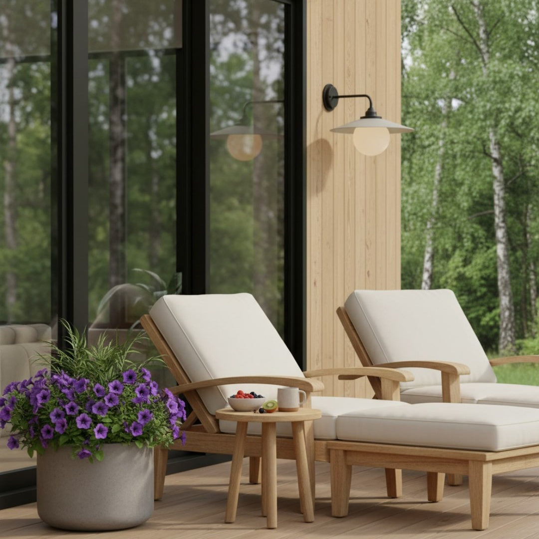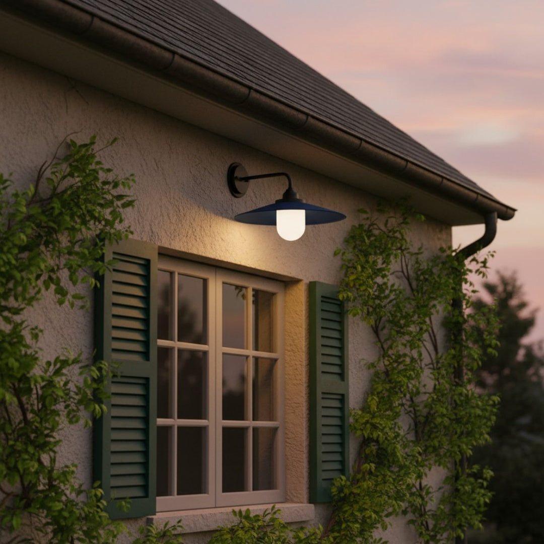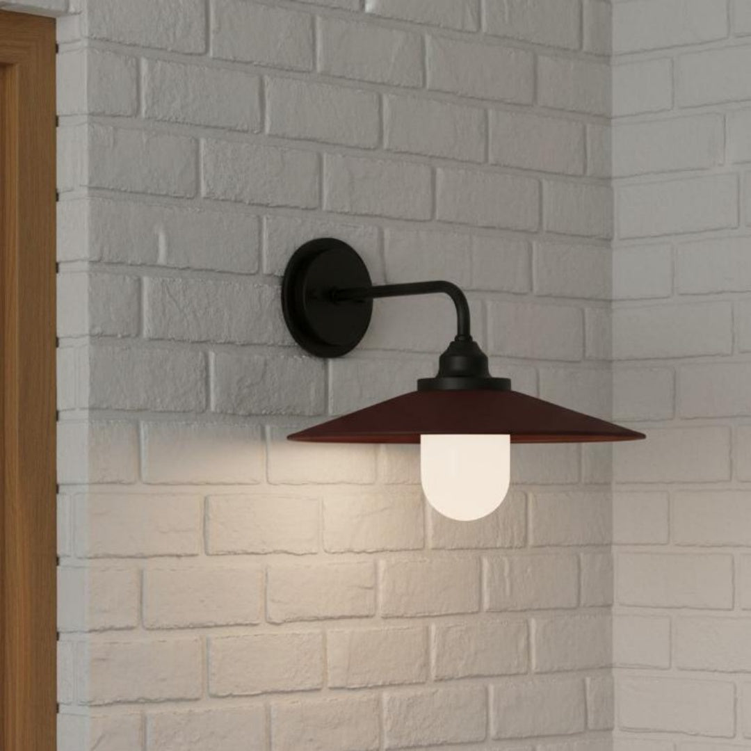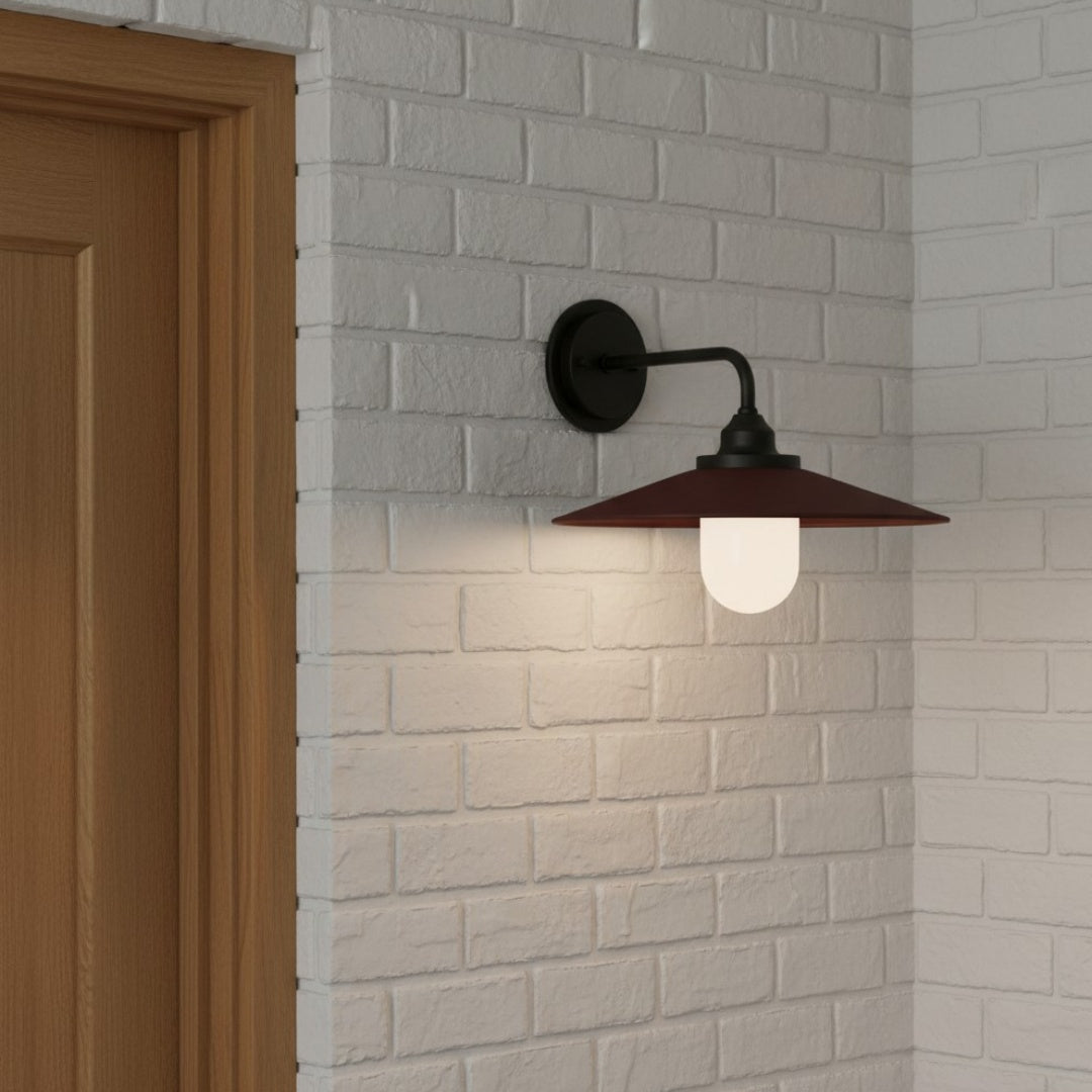 Featuring a wide, flared metal shade and gently curved arm, this fixture is available in multiple shade and finish combinations to suit any exterior decor. Whether mounted on porches, patios, or entryways, it combines classic design with durable construction for lasting performance in all weather conditions.
