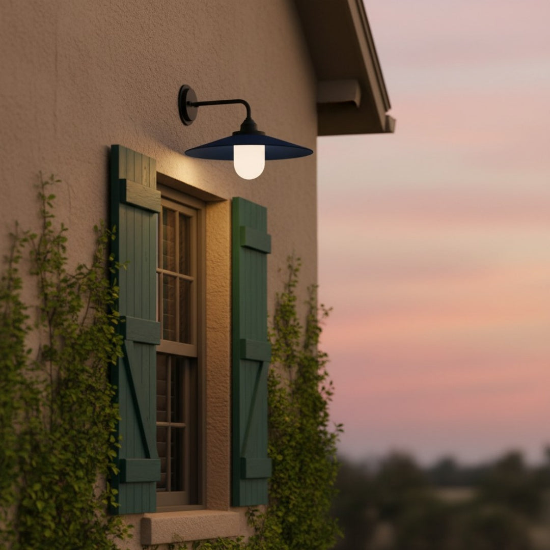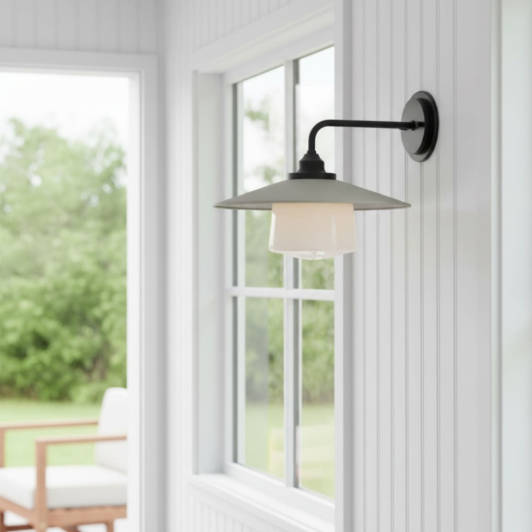 • Classic Farmhouse Appeal: Inspired by vintage barn lights with a wide, flared shade and curved arm for a timeless aesthetic.