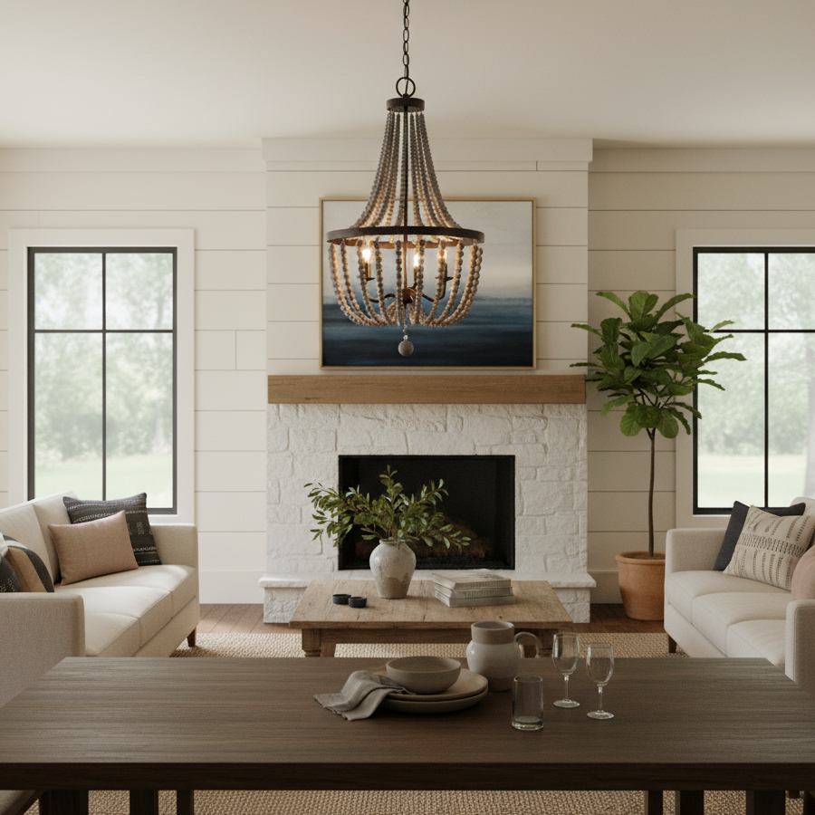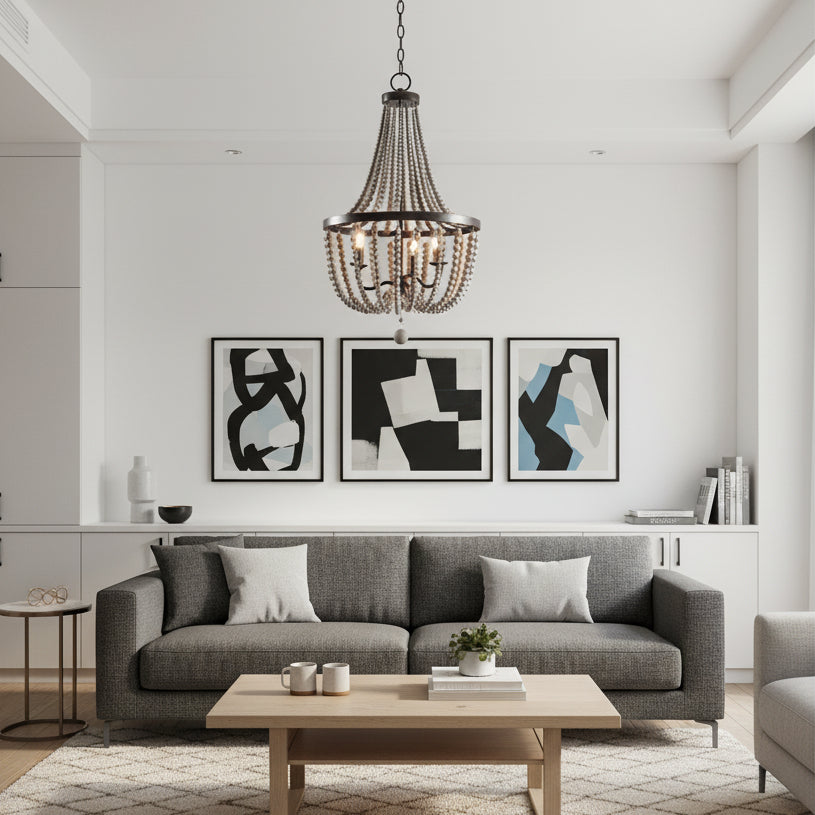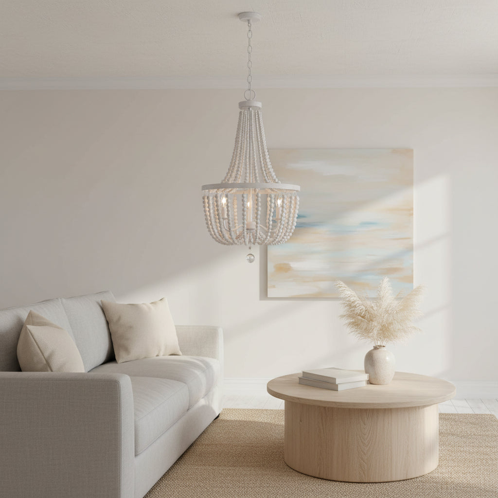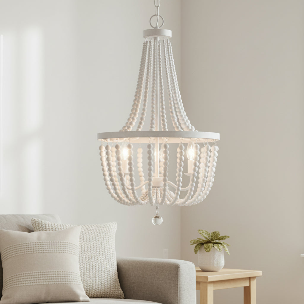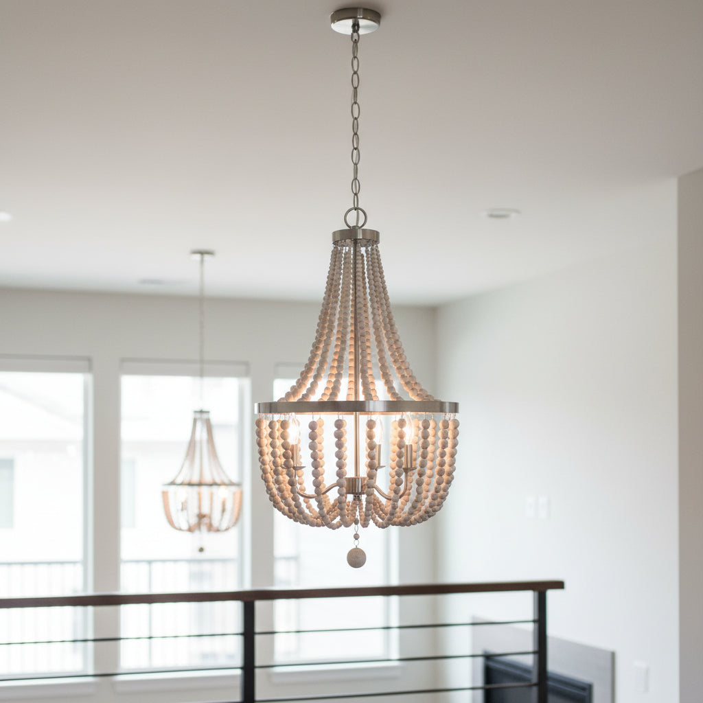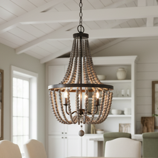 The Selara Chandelier blends Bohemian charm with distressed wood, rich finishes, and draped wooden beads. A warm, airy 3-light design perfect for dining rooms, bedrooms, entryways, or living rooms.