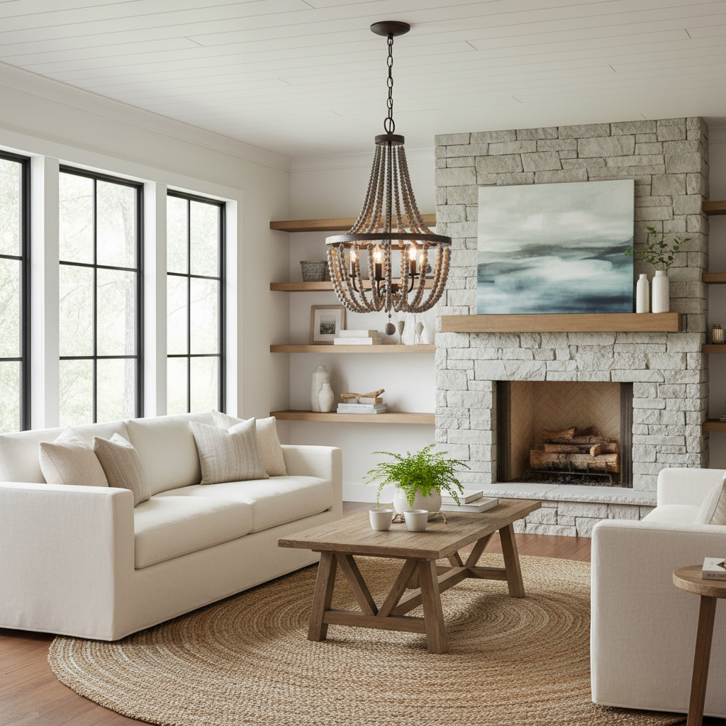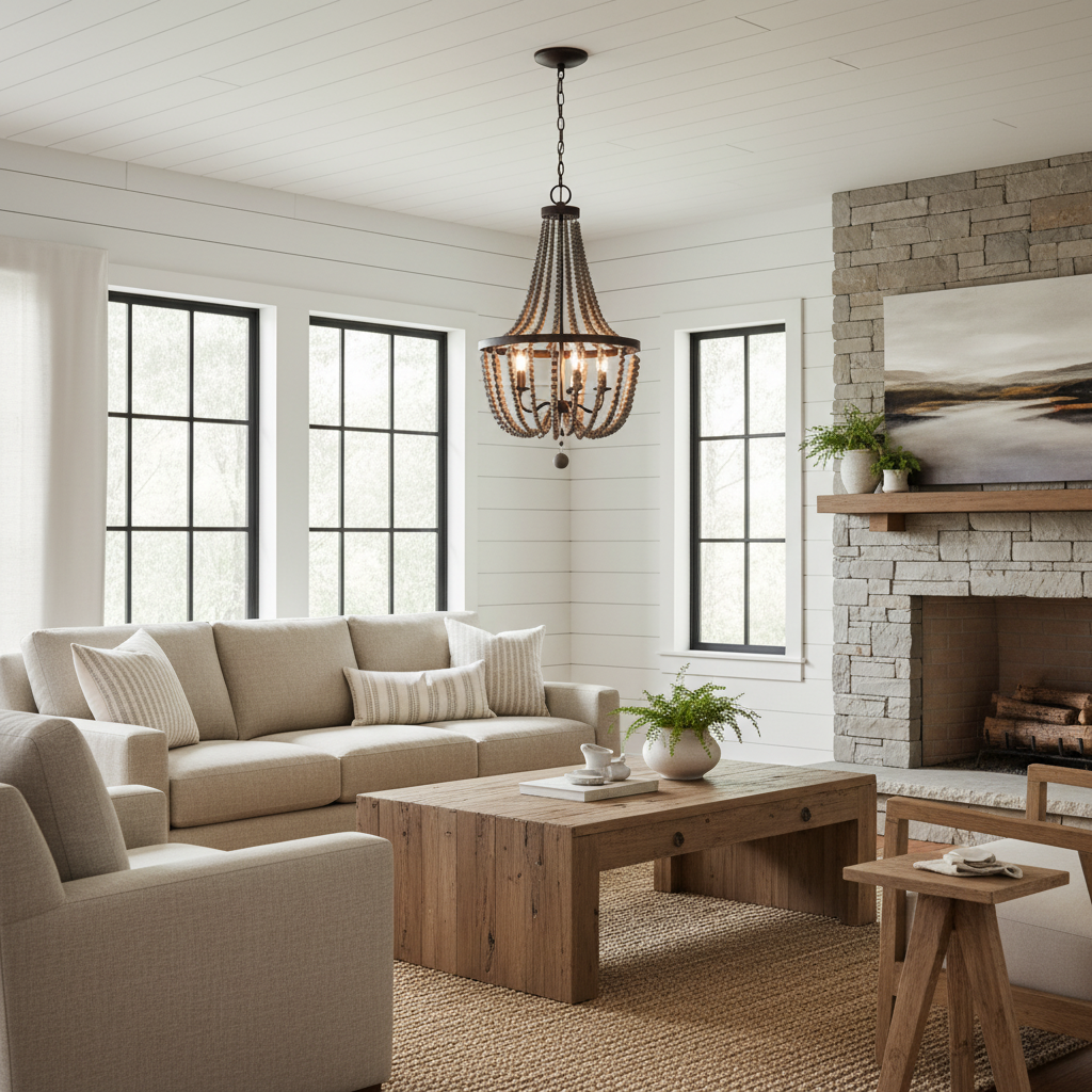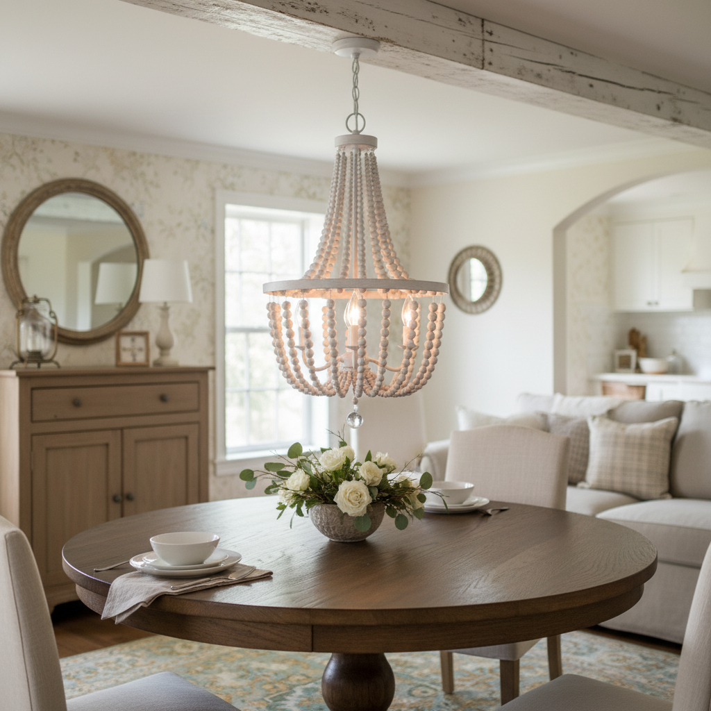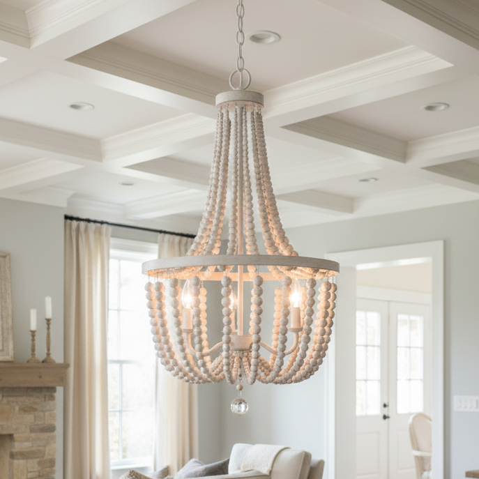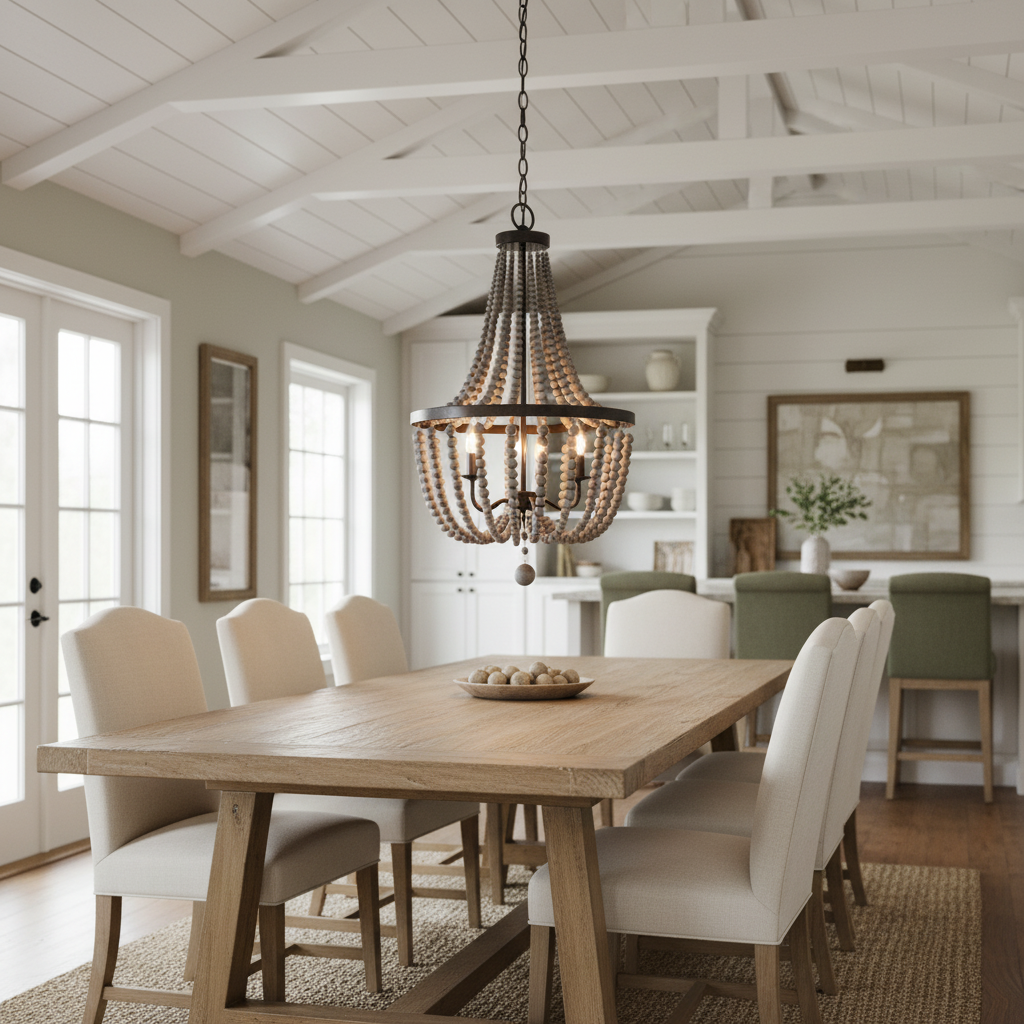 The Selara Chandelier blends Bohemian charm with distressed wood, rich finishes, and draped wooden beads. A warm, airy 3-light design perfect for dining rooms, bedrooms, entryways, or living rooms.