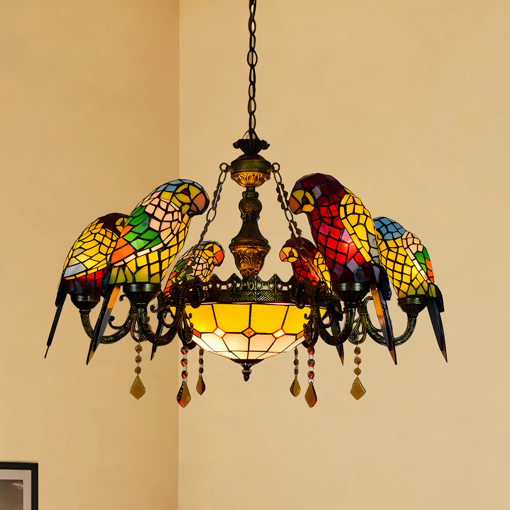 Tiffany Style Vintage Stained Glass 7-Light Parrot Chandelier