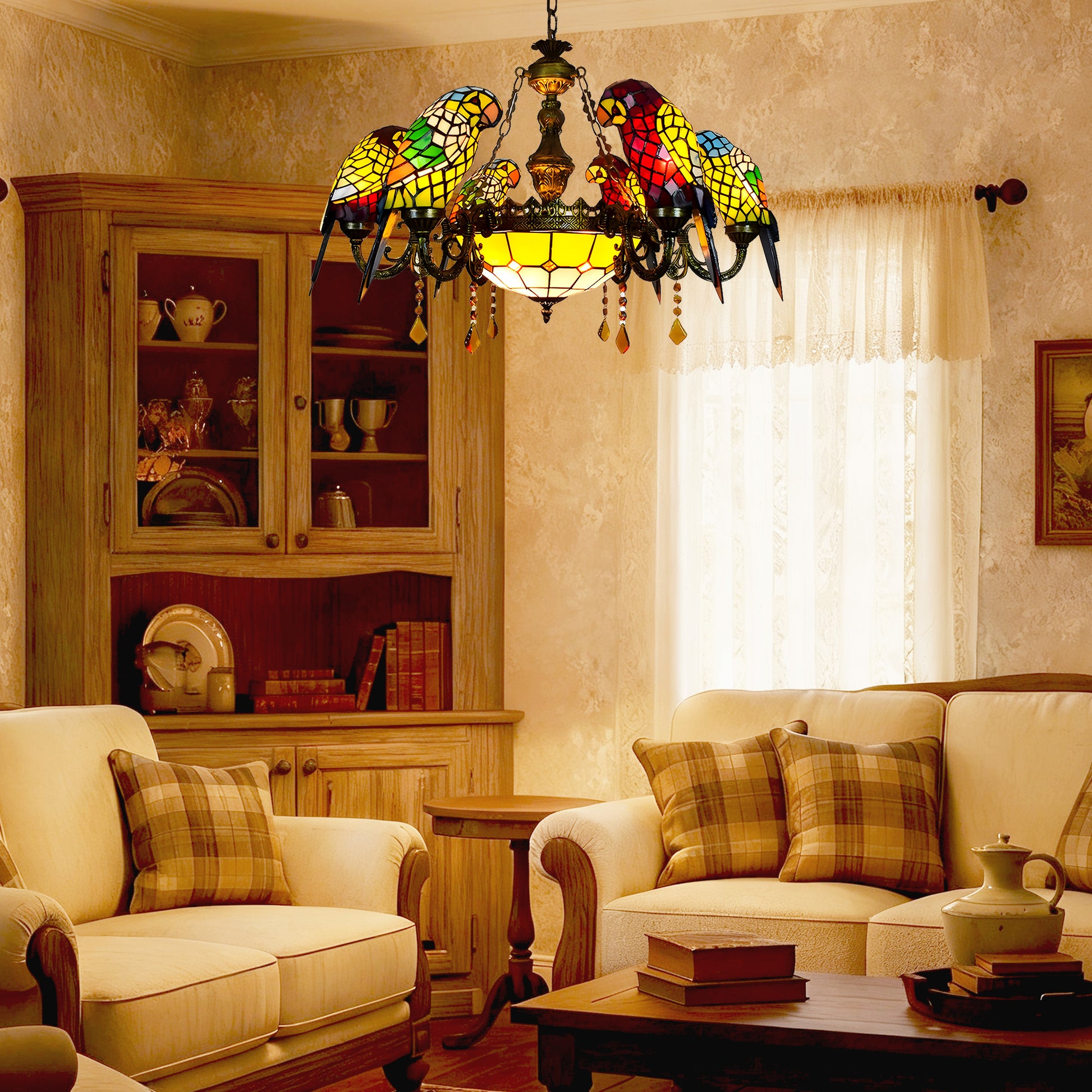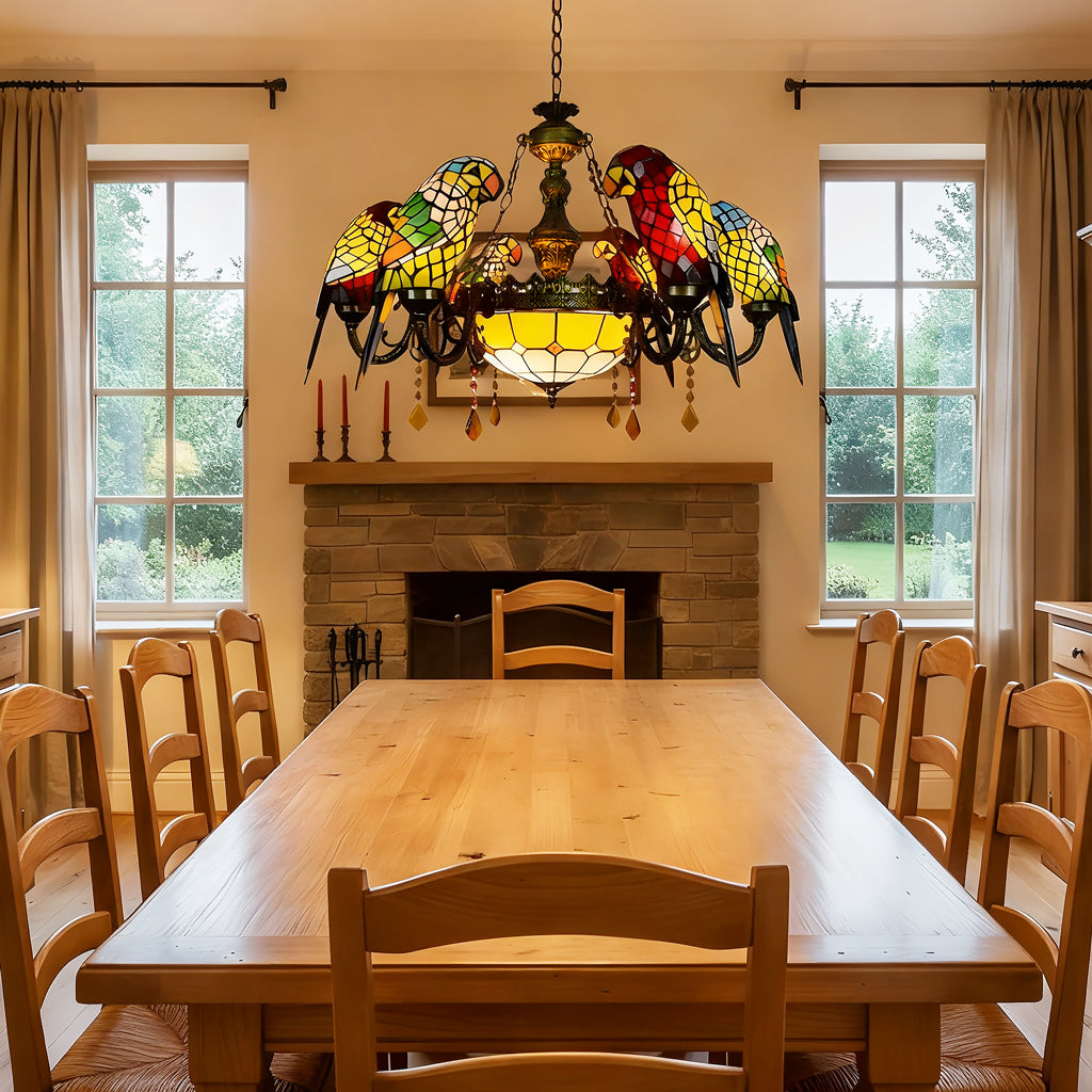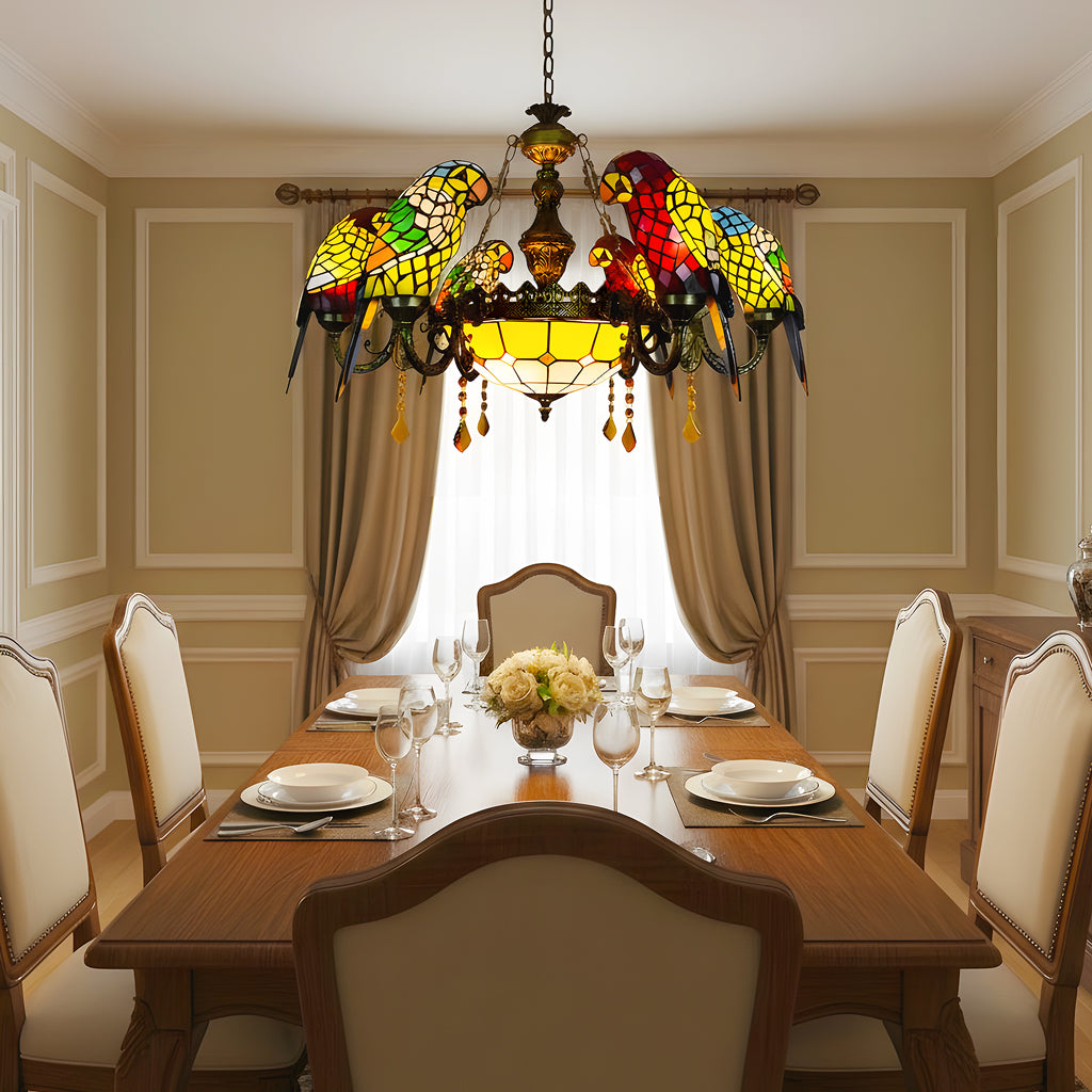 Featuring six vibrant glass parrots perched on a gracefully curved metal frame, this 7-light pendant radiates warmth and color through its handcrafted stained glass shades. Perfect for dining rooms, living areas, bars, or cafés, it adds a tropical touch of elegance and whimsy to both classic and eclectic interiors.