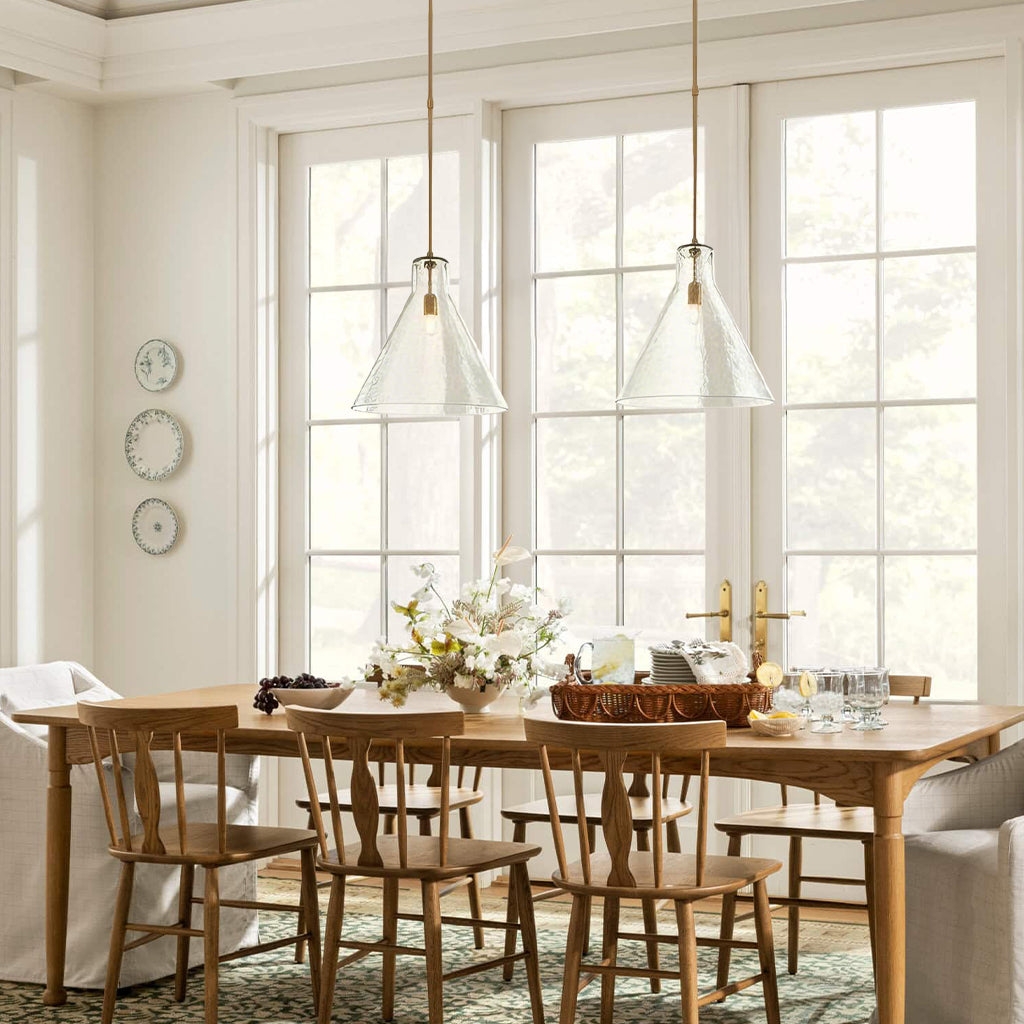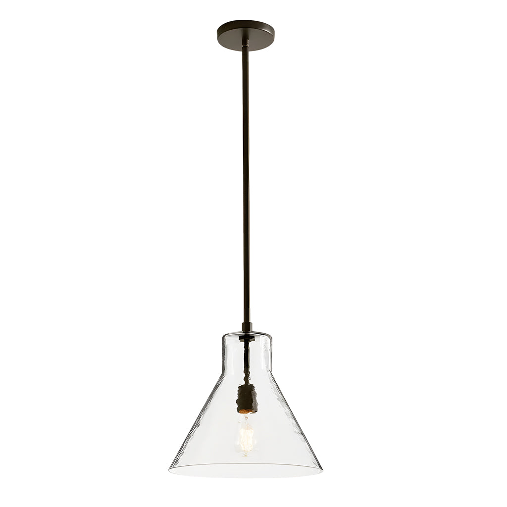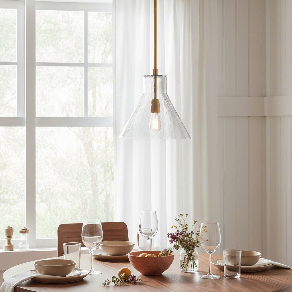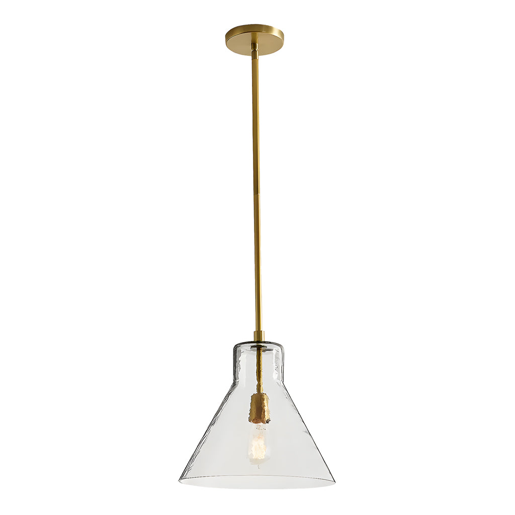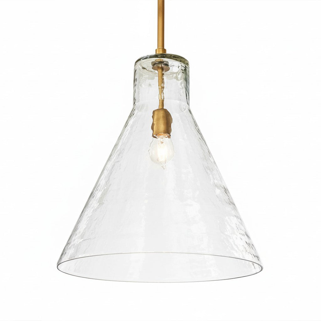 This pendant pairs minimalist form with artisanal texture. The hand-blown hammered glass shade features a clean cone silhouette that diffuses light beautifully, while the slim brass rod adds a warm, modern touch. Perfect for kitchens, dining areas, or over countertops, it brings understated elegance and subtle character to any space.