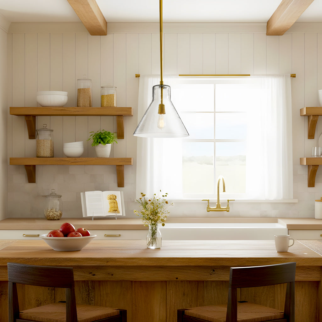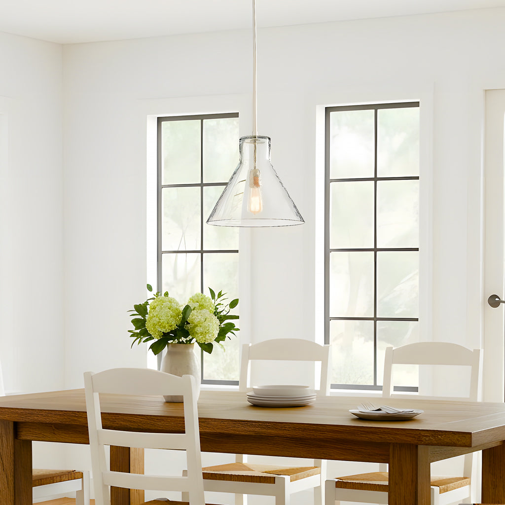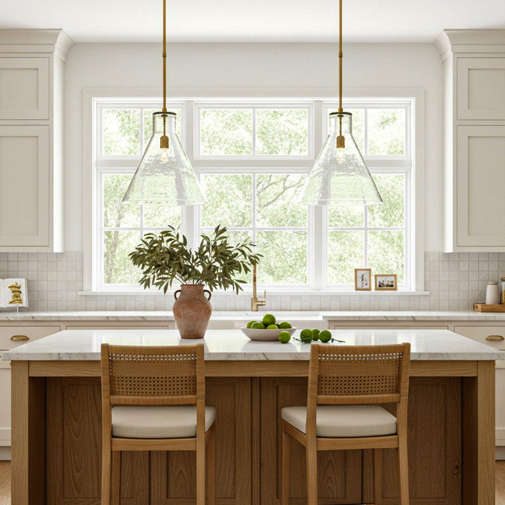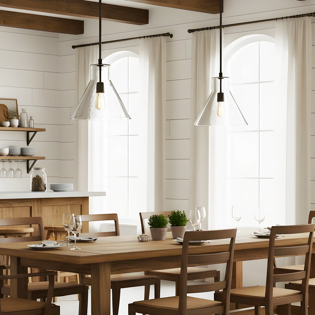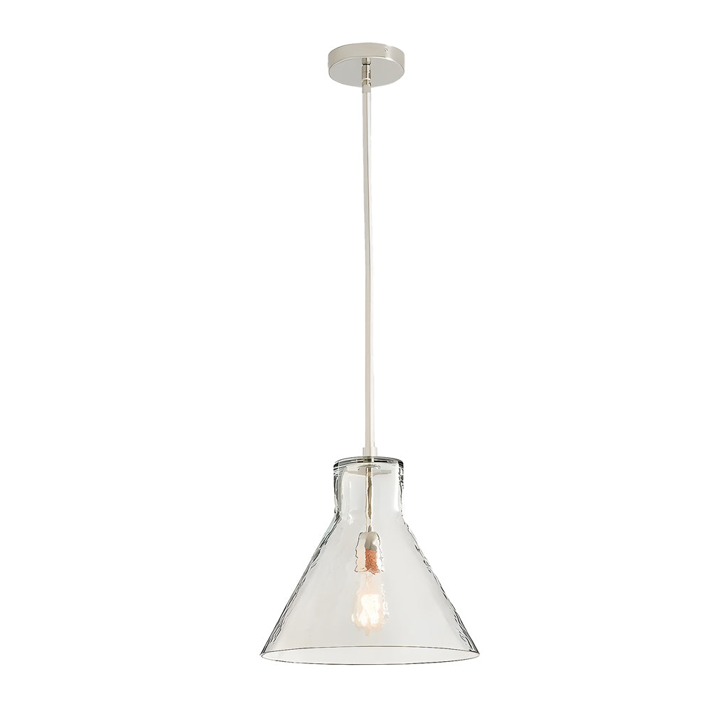 This pendant pairs minimalist form with artisanal texture. The hand-blown hammered glass shade features a clean cone silhouette that diffuses light beautifully, while the slim brass rod adds a warm, modern touch. Perfect for kitchens, dining areas, or over countertops, it brings understated elegance and subtle character to any space.
