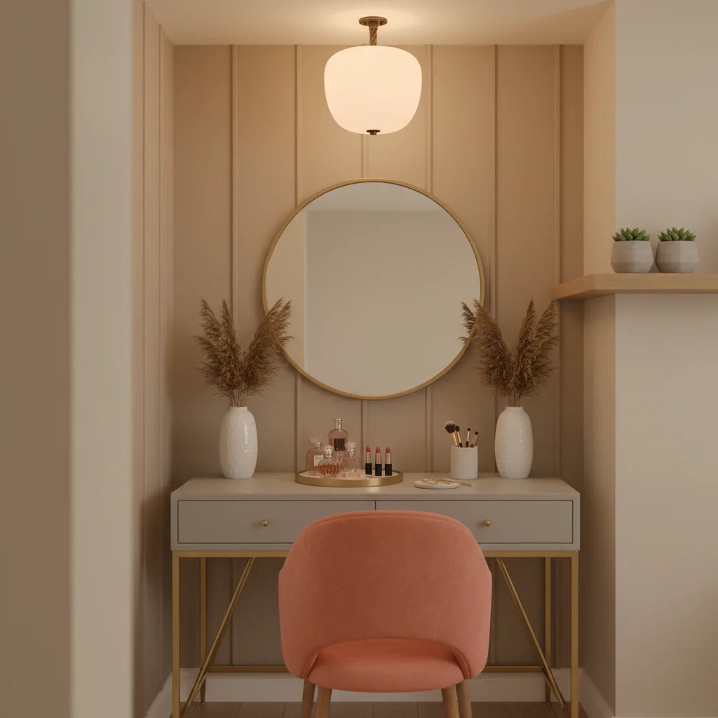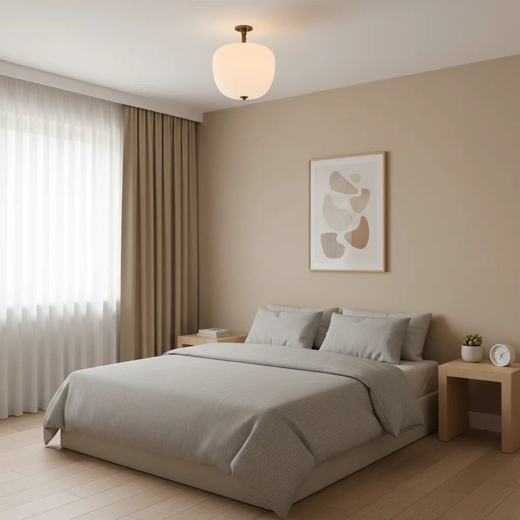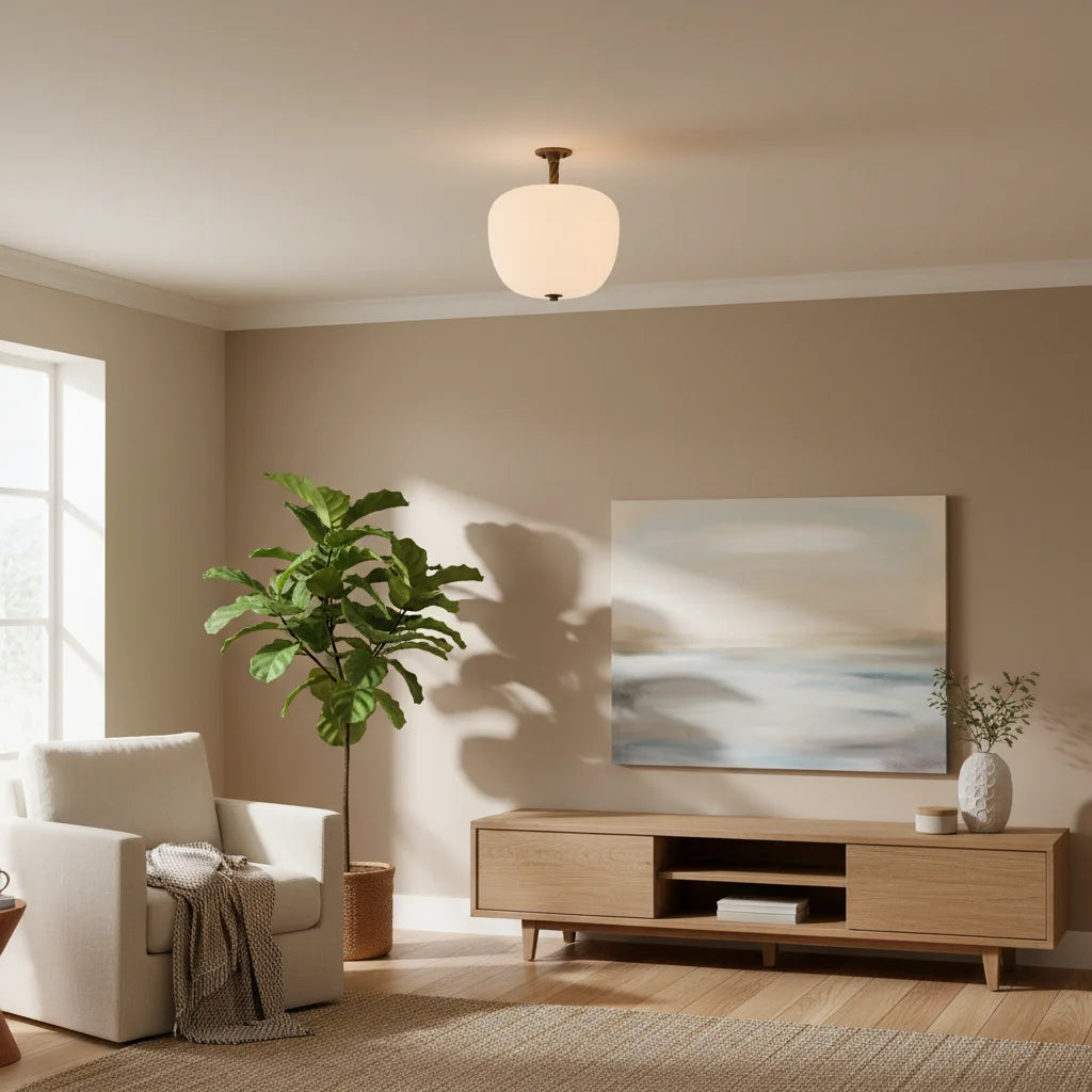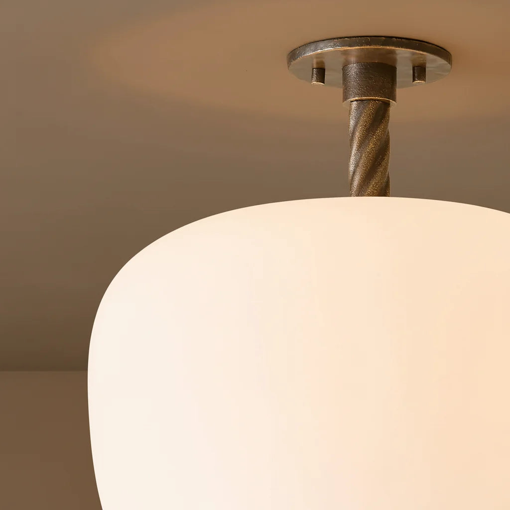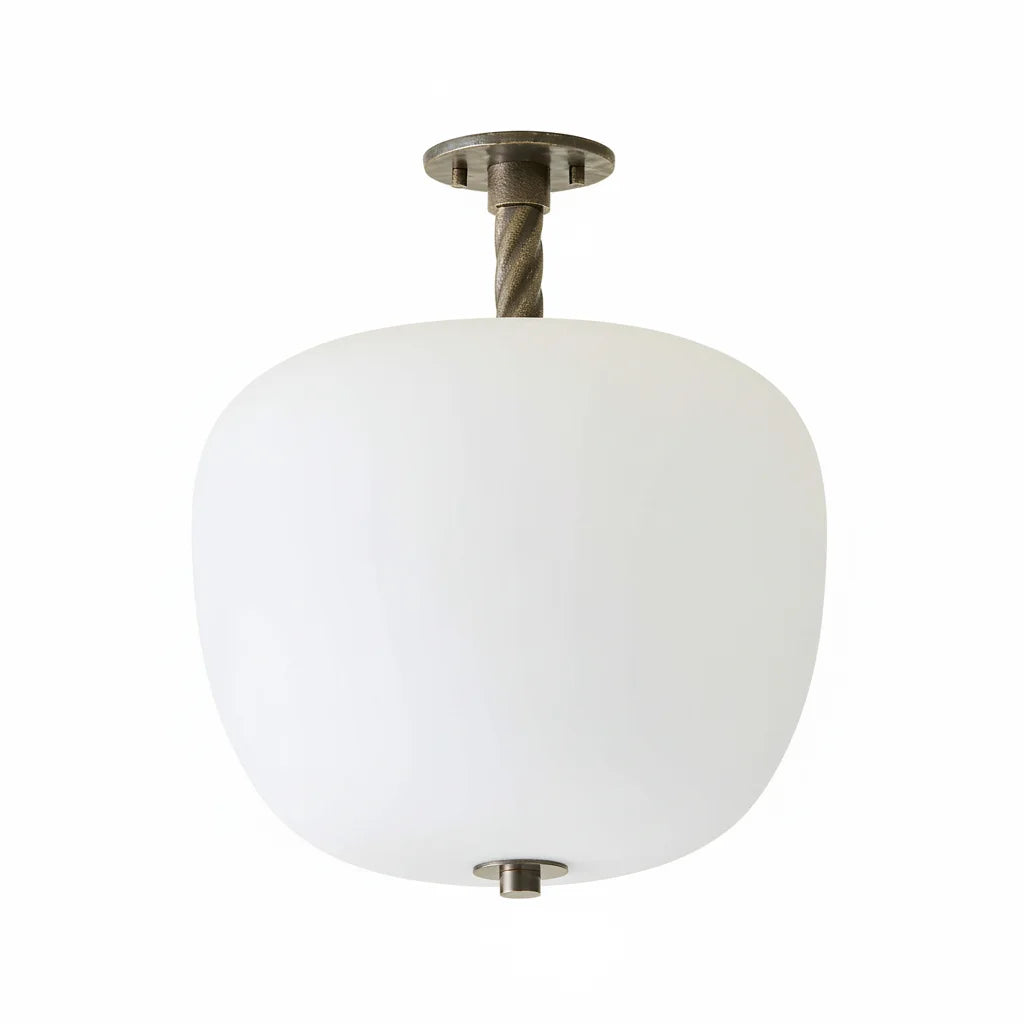 The Dark Bronze Flush Mount Light with Opaline Glass Shade embodies understated elegance with handblown matte opaline glass. Its unlacquered twisted brass canopy develops vintage patina; polish to restore luster. Each piece features unique tonal variations, showcasing artisanal quality.