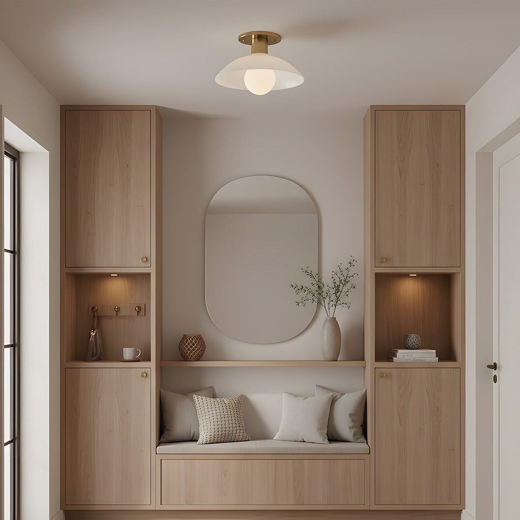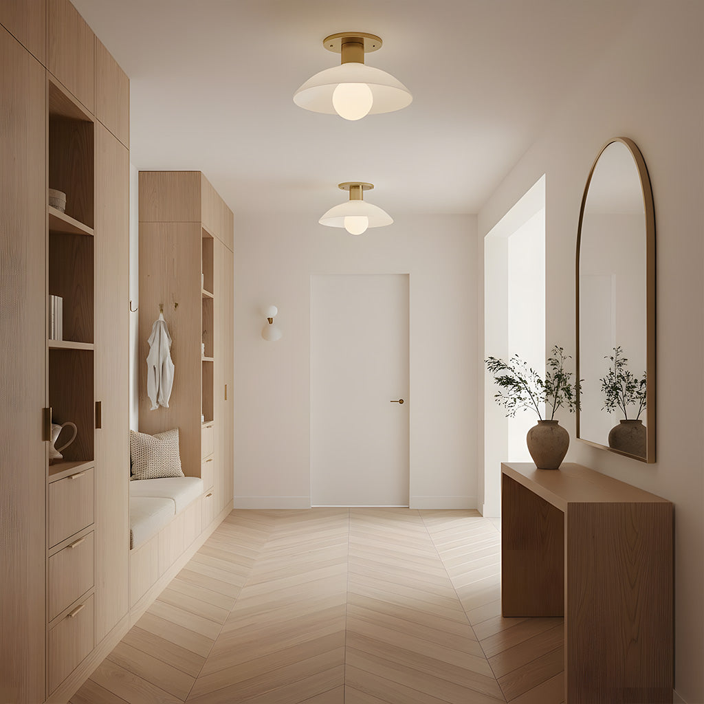 The Celestine Flush Mount Light channels mid-century Scandinavian style through a streamlined form and solid brass build. The glass detailing brings refined elegance. Ideal for bedrooms, hallways, or entryways.
