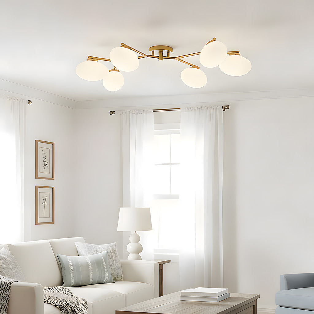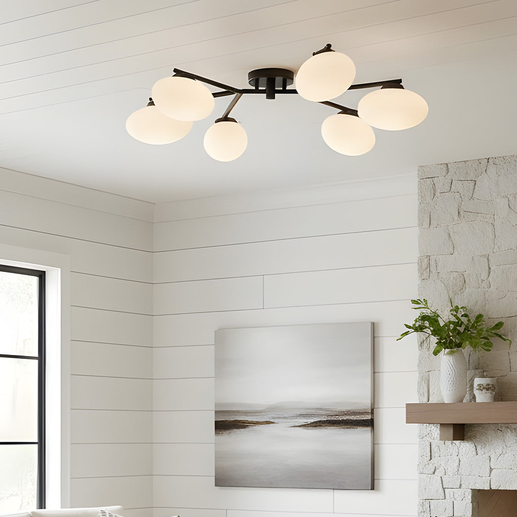 Meet our stunning 6-light elliptical glass globe linear semi-flush mount, a fusion of modern grace and timeless style. Featuring six frosted elliptical shades, it casts a warm, inviting glow. Inspired by the sputnik design, this sleek ceiling light boasts durable metal arms and a sophisticated linear arrangement. Perfect for lower ceilings, it's a standout addition to any home or office.