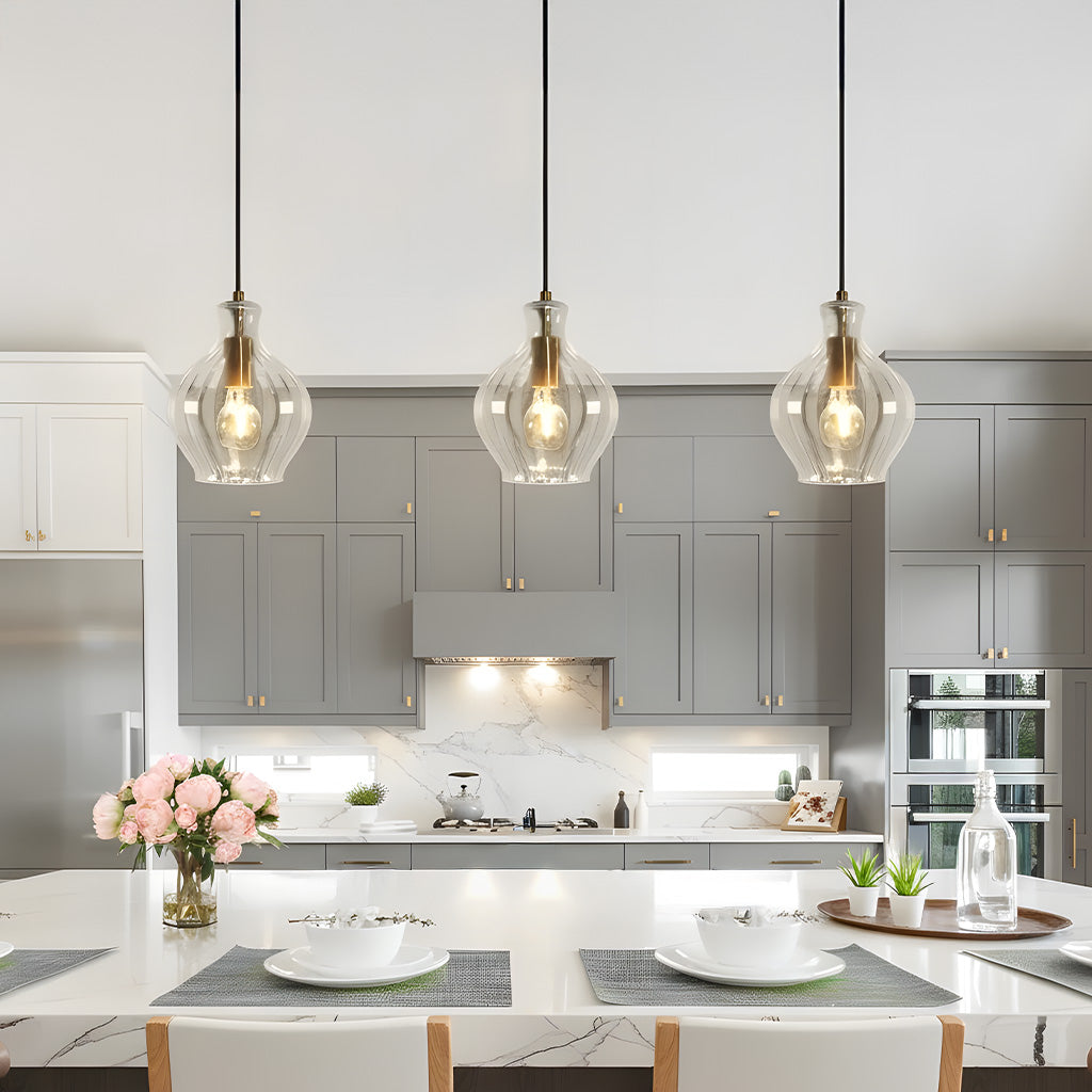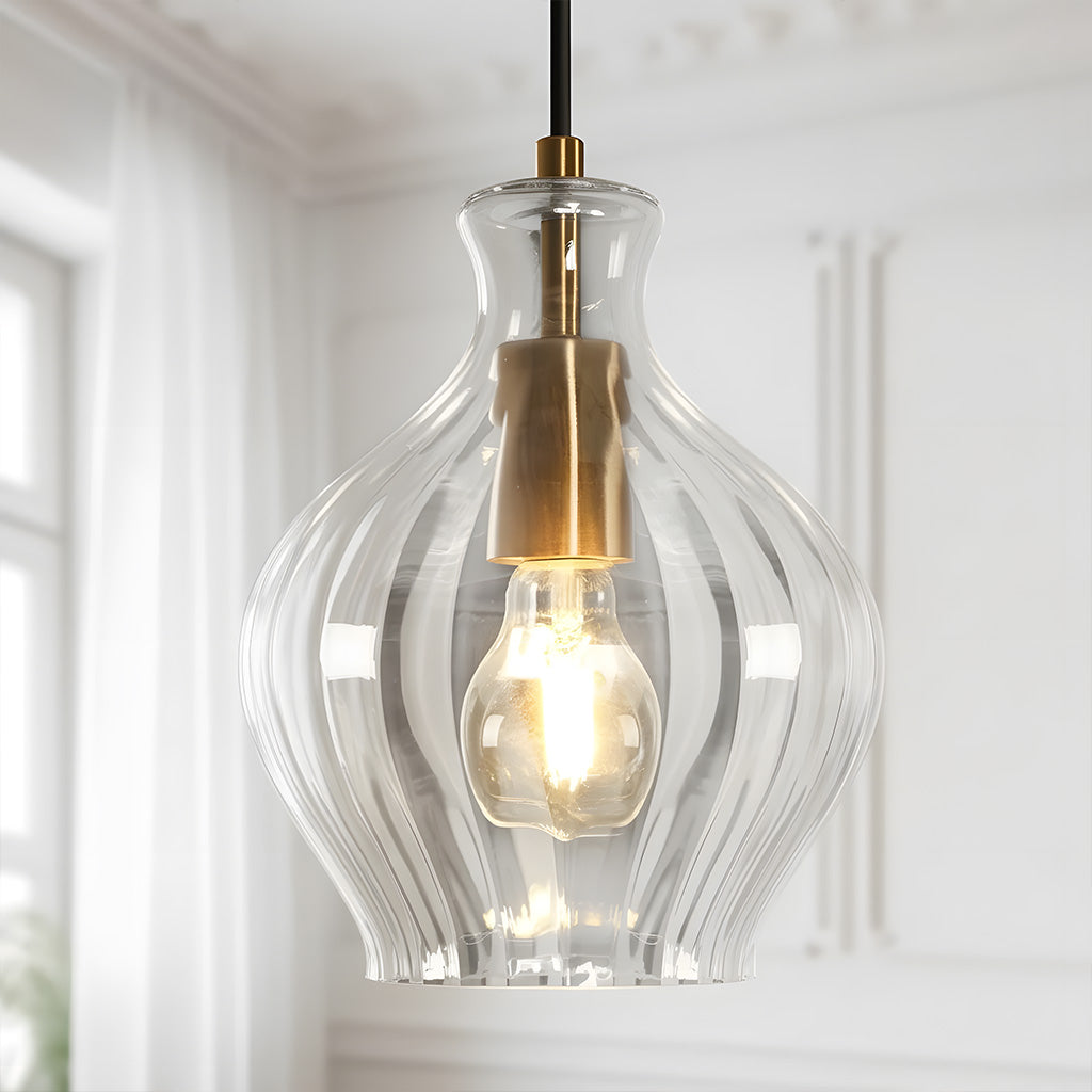 The Vase-Shaped Glass Pendant Light fluted glass shade offers a warm glow, while the polished brass finish adds subtle luxury. Perfect for kitchens, bedrooms, and powder rooms, it complements modern and mid-century styles effortlessly.