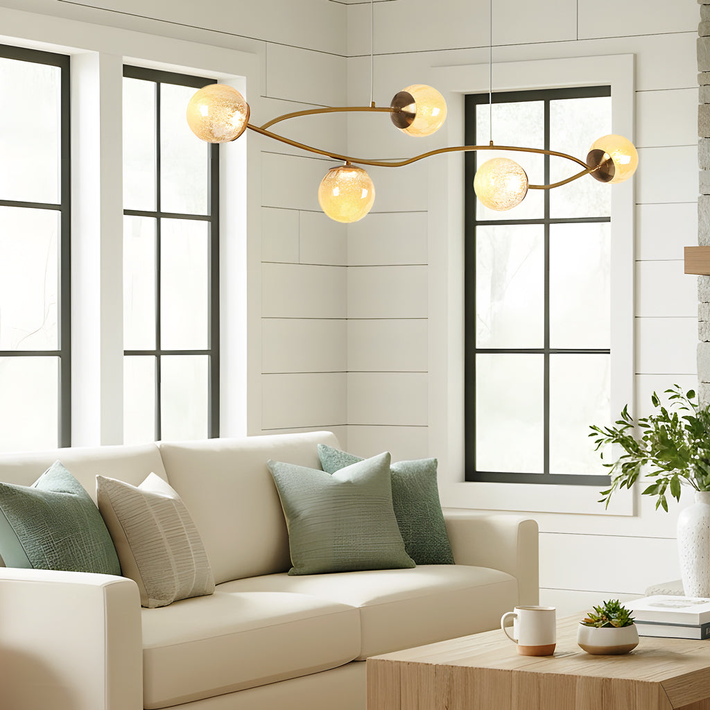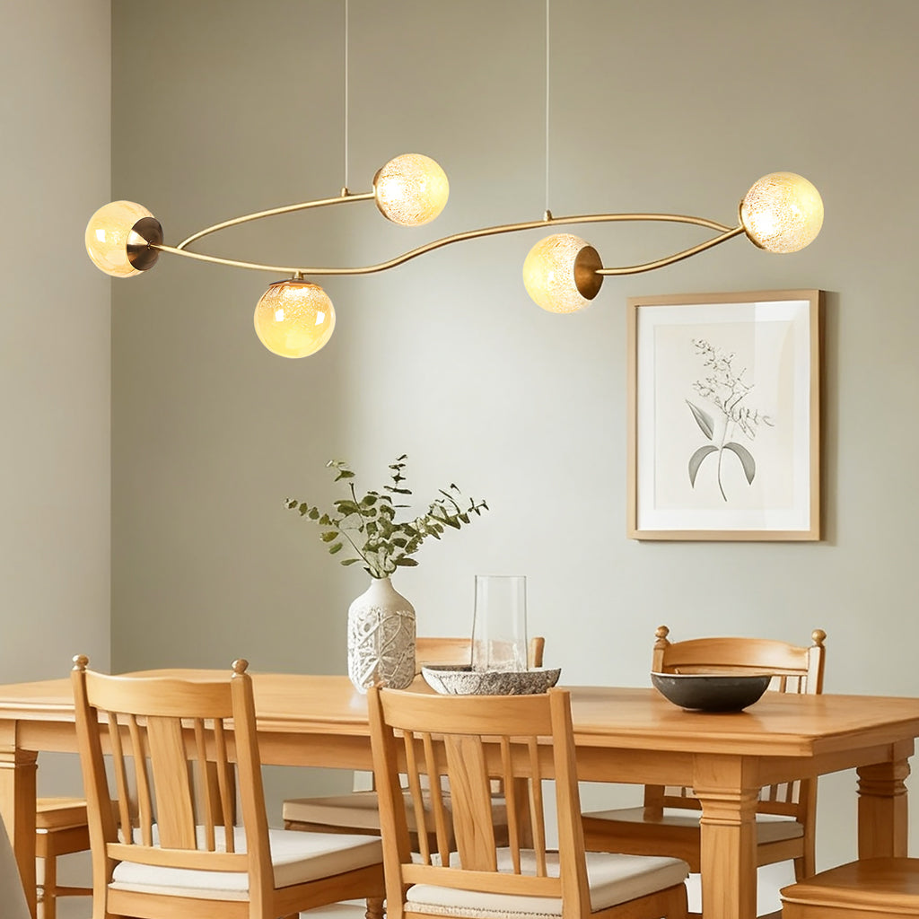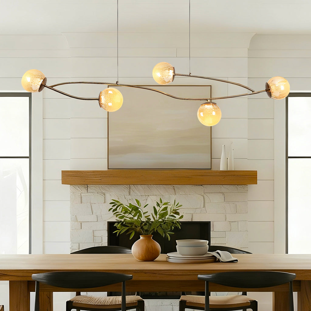 Featuring a fluid, organic metal frame and five warm amber glass globes, this fixture brings a perfect balance of elegance and creativity to dining rooms, kitchens, or open-concept living spaces. The asymmetrical design adds a dynamic, gallery-like presence while delivering soft, ambient lighting that enhances the room’s atmosphere.