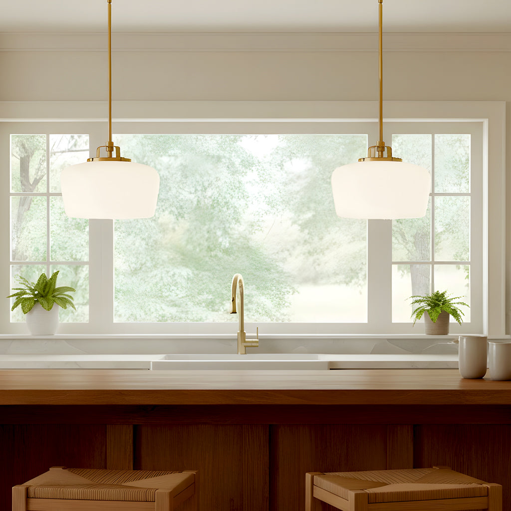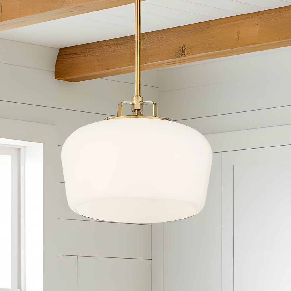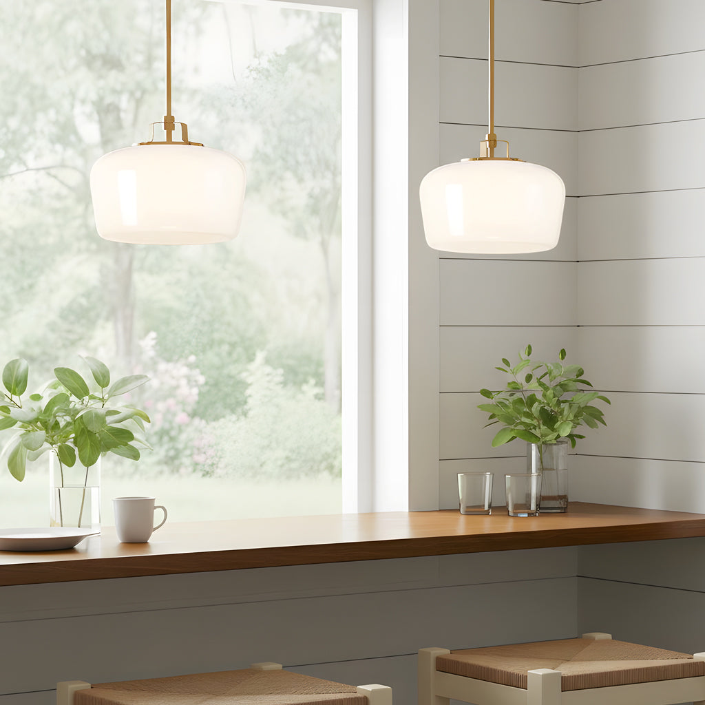 The smooth opal glass shade paired with antique brass detailing creates a timeless yet modern aesthetic.