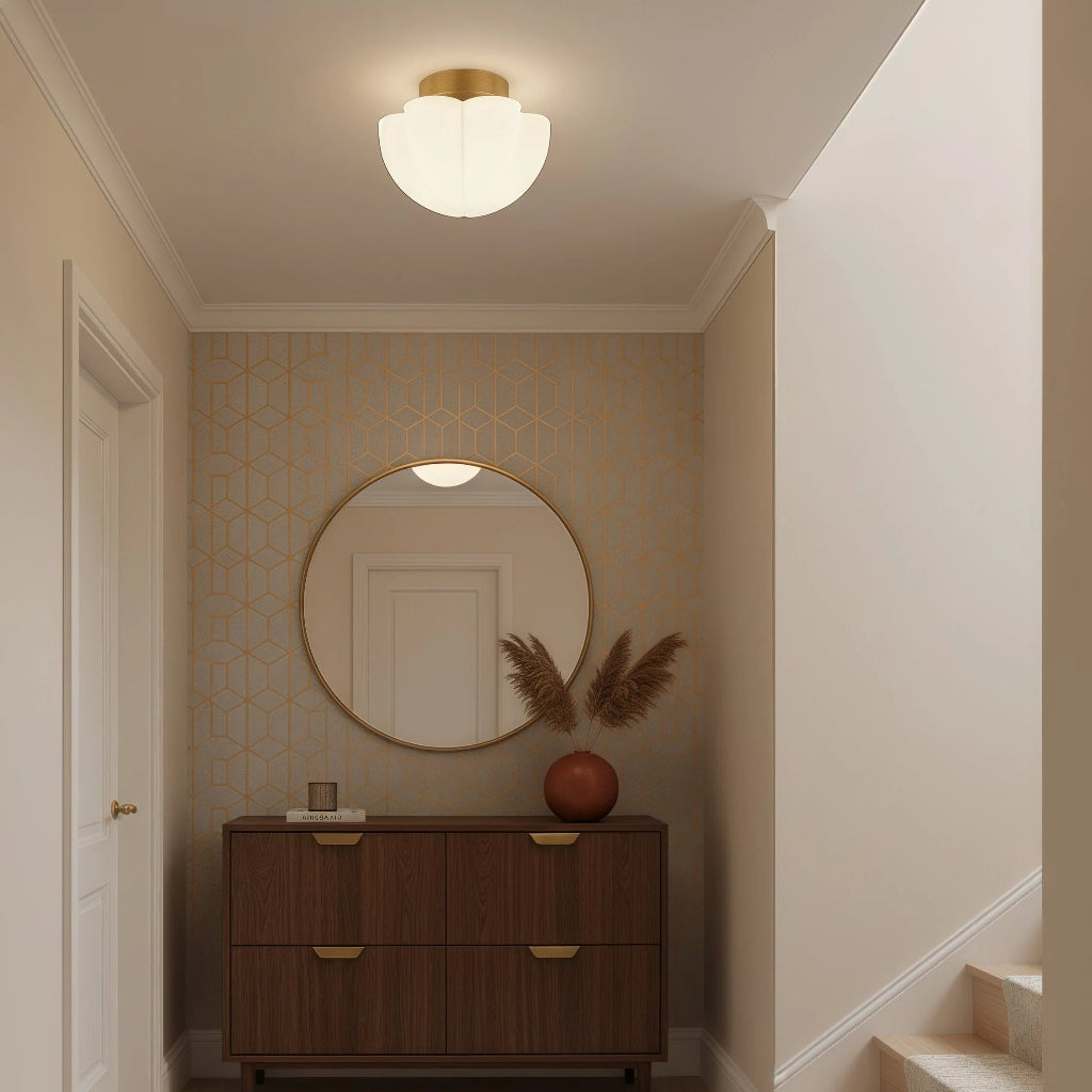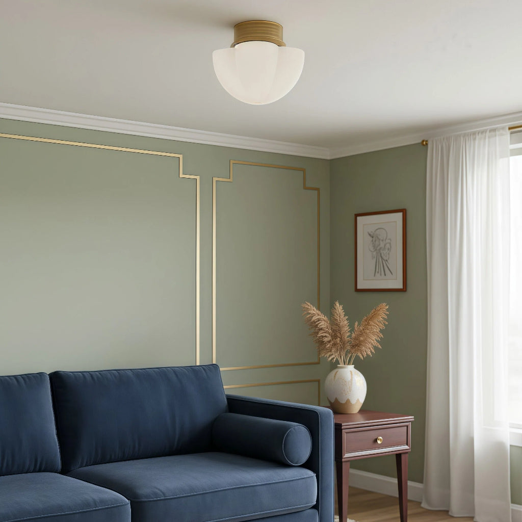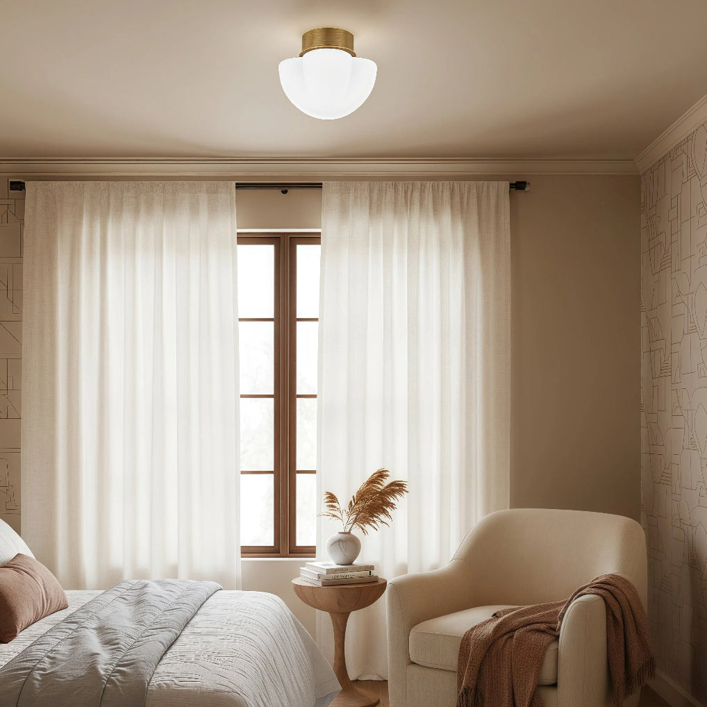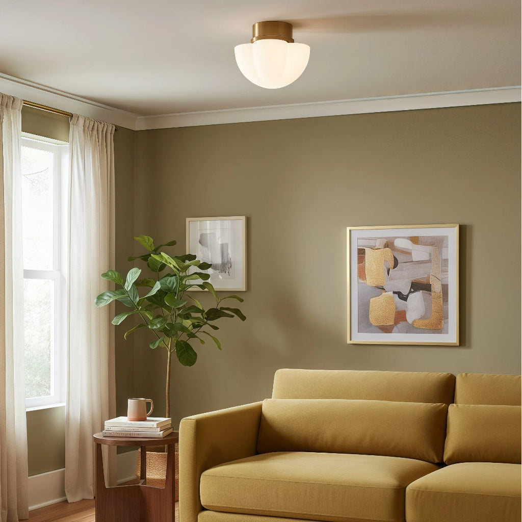Scalloped glass shade diffuses gentle glow to soften room atmosphere for relaxation.