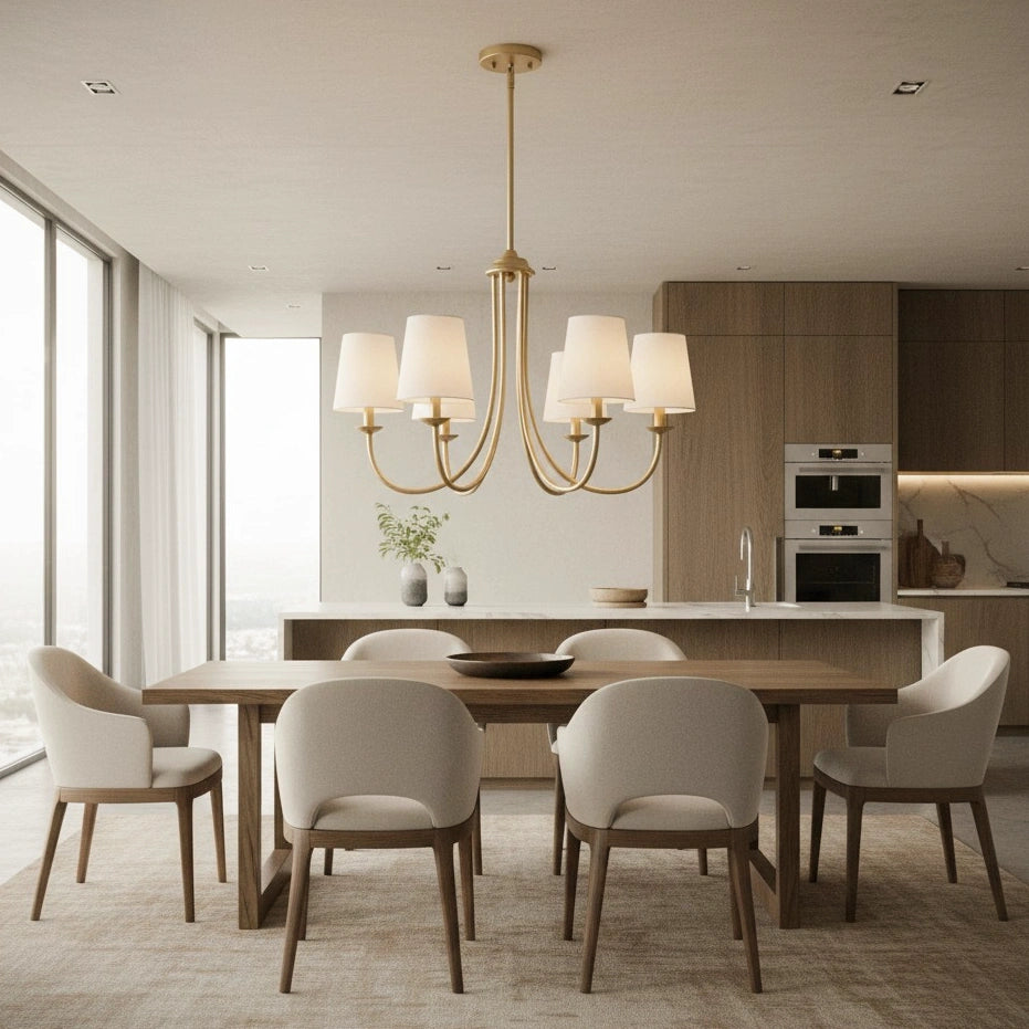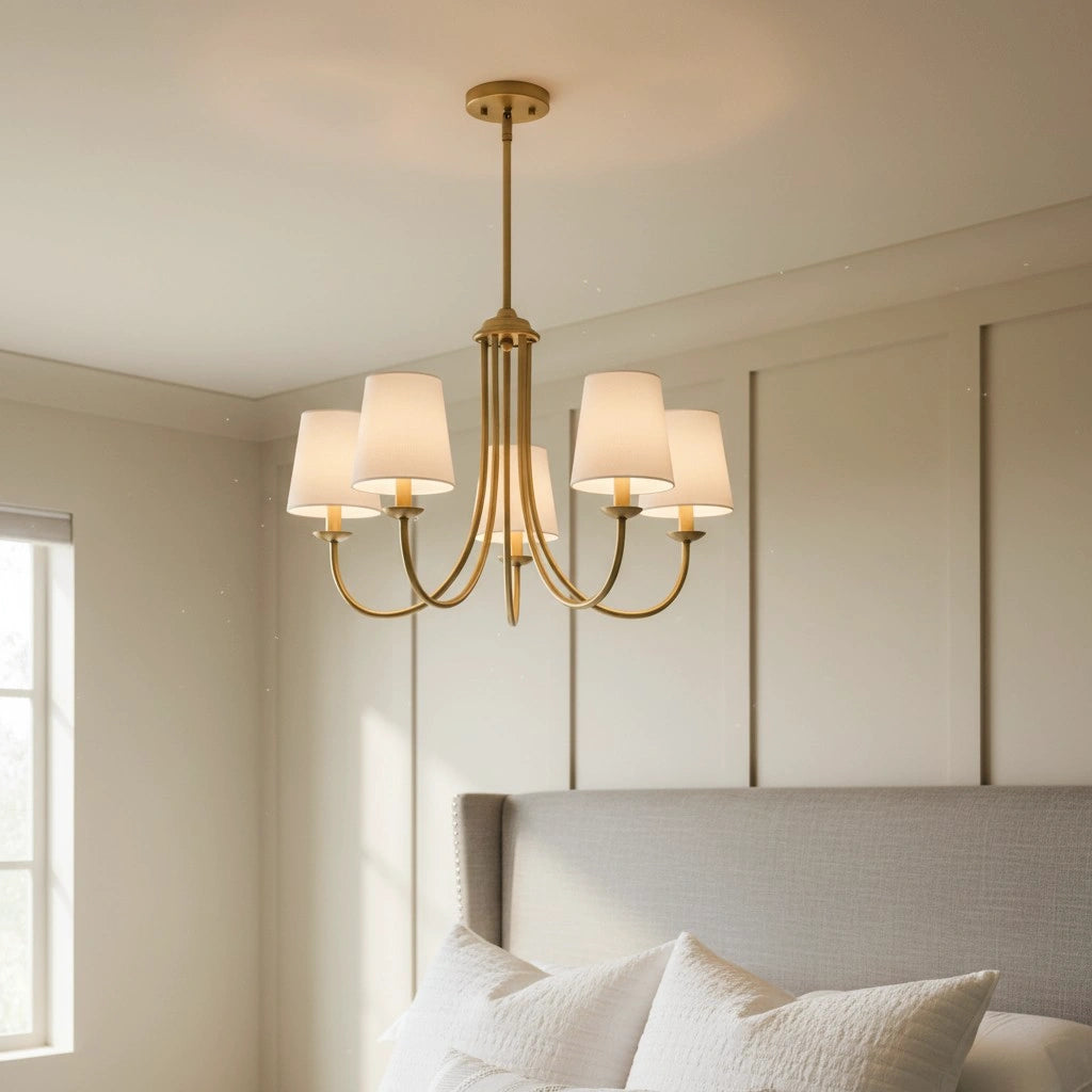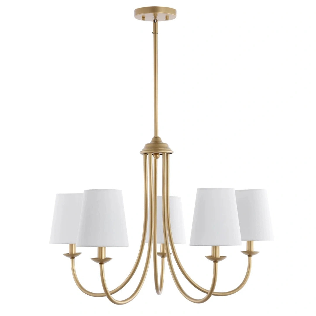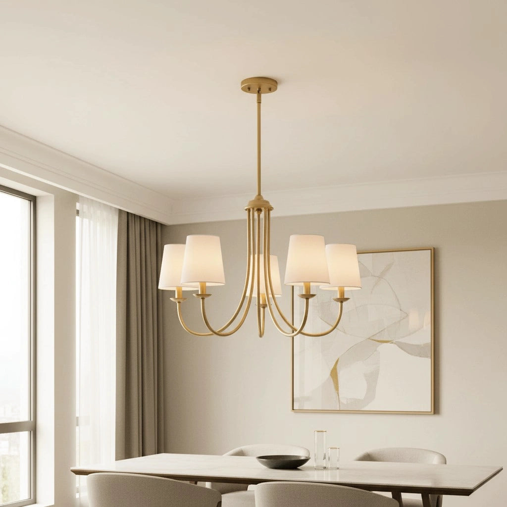 This modern 5-light chandelier features a PC cotton lampshade paired with a multi-arm metal body, effortlessly adding a touch of warmth to your home. Its softly diffused light makes it an ideal choice for adorning the living room, dining area, and bedroom.