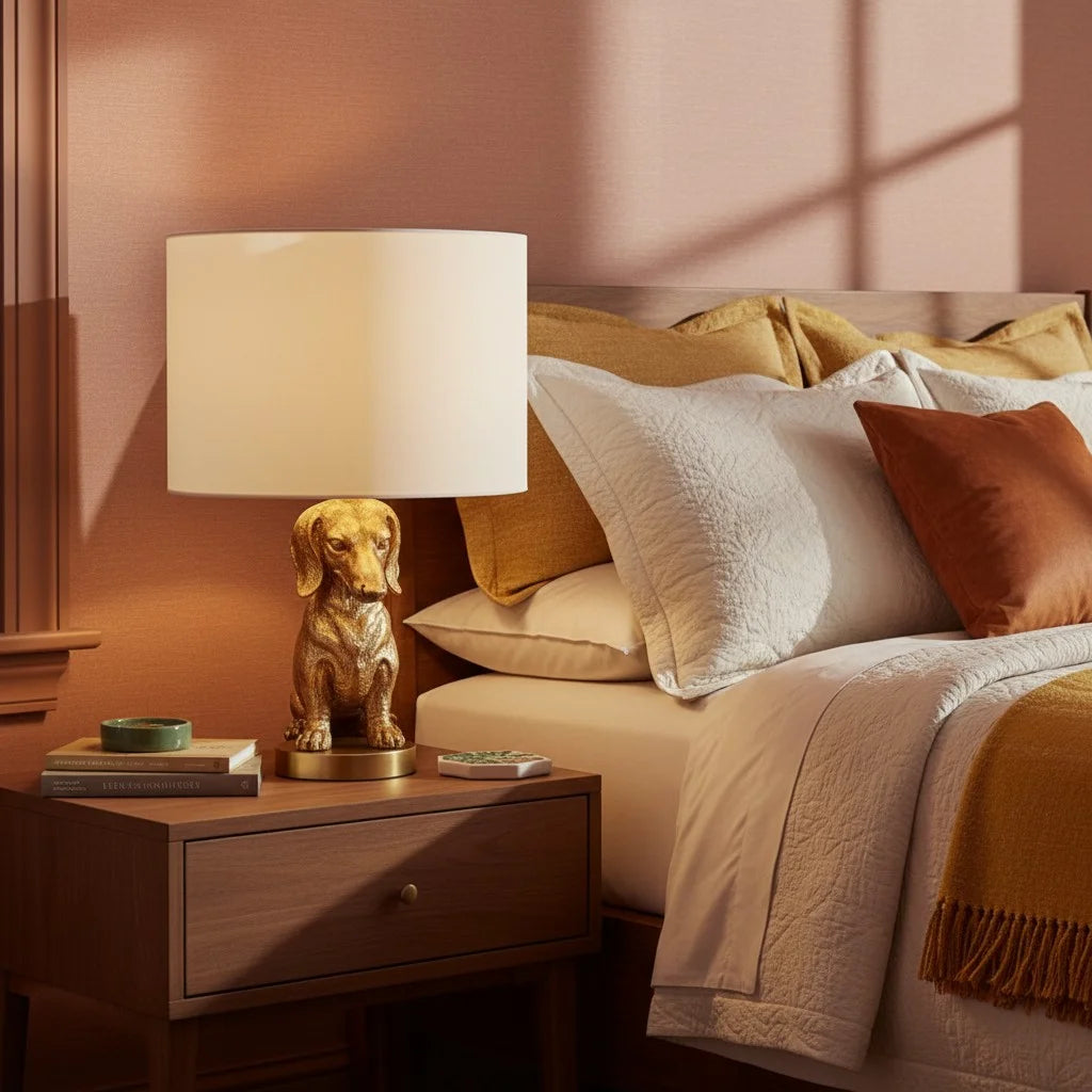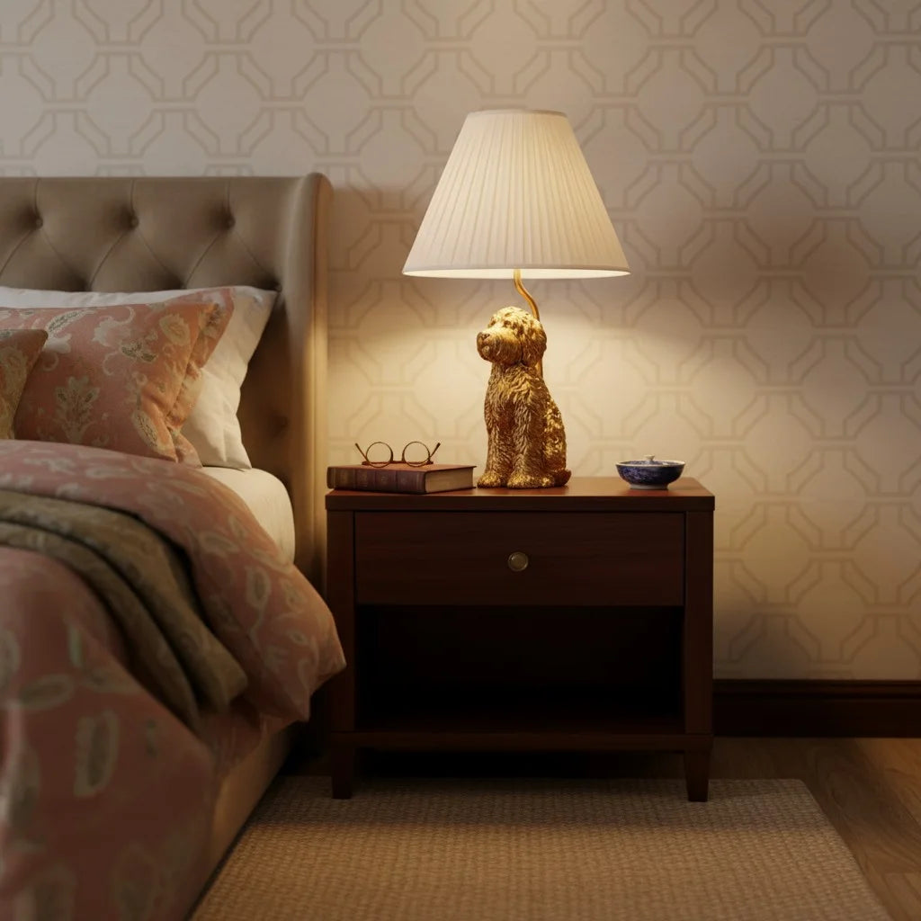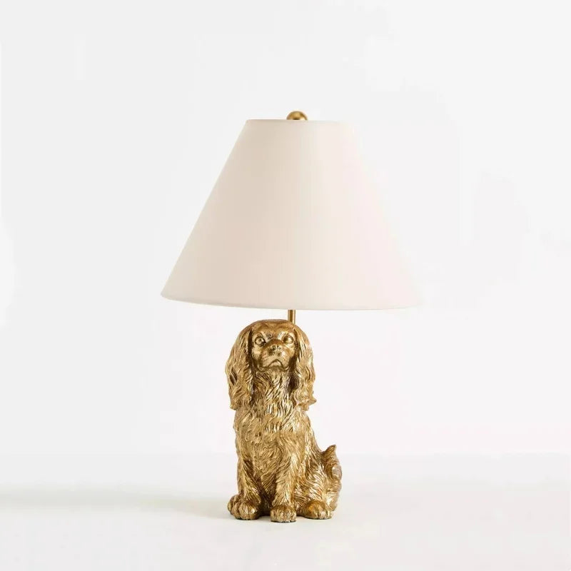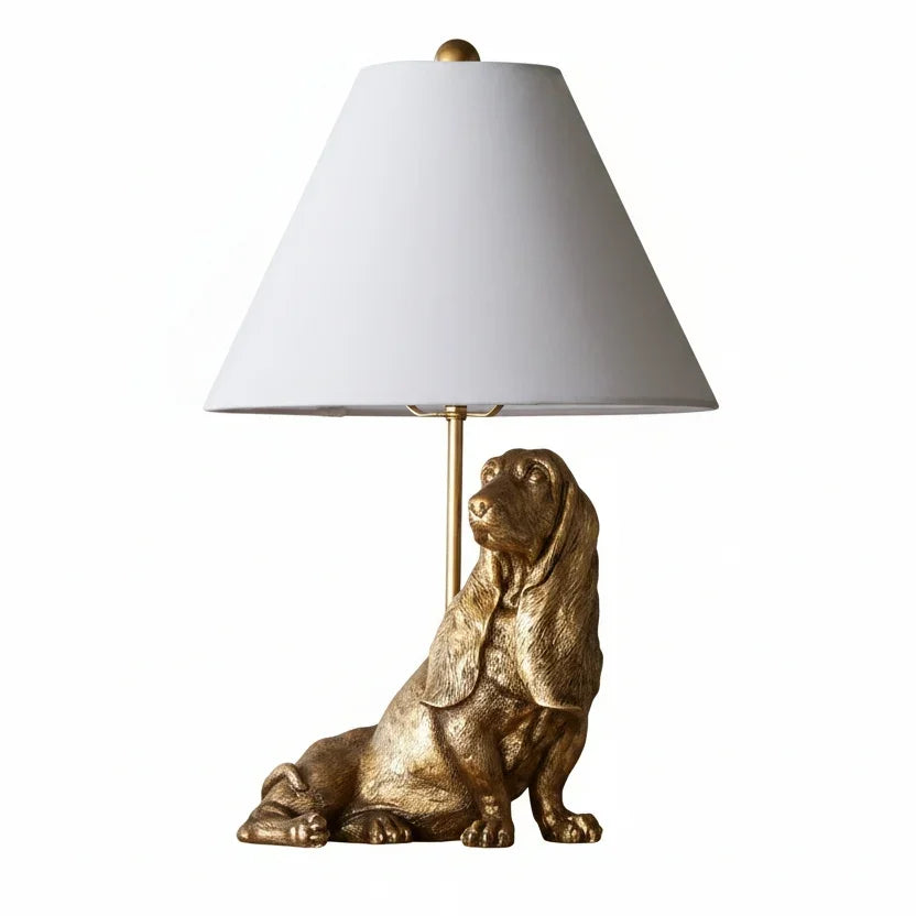 Crafted with a sculpted me'ta dog base and soft fabric shade, this lamp blends vintage allure with playful personality, adding warmth to bedside nooks or cozy corners.
