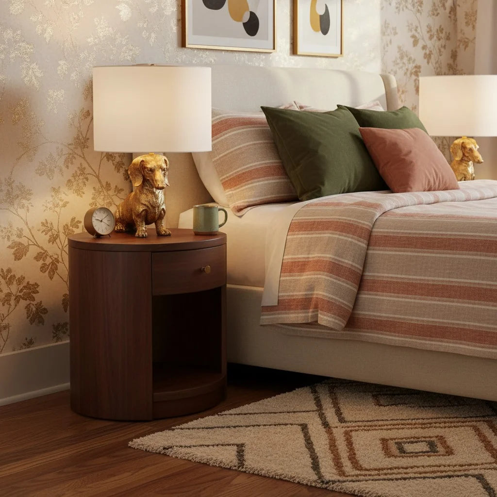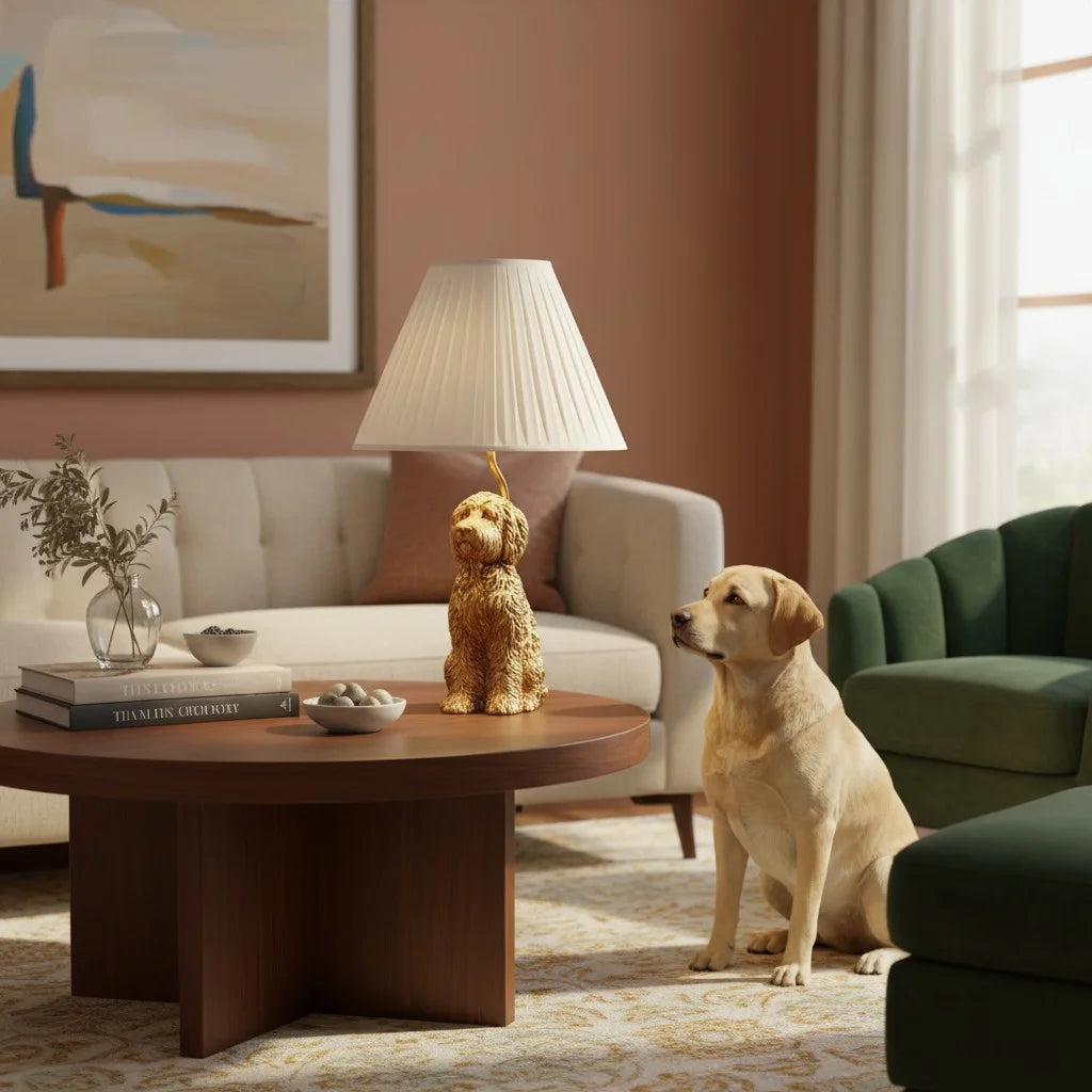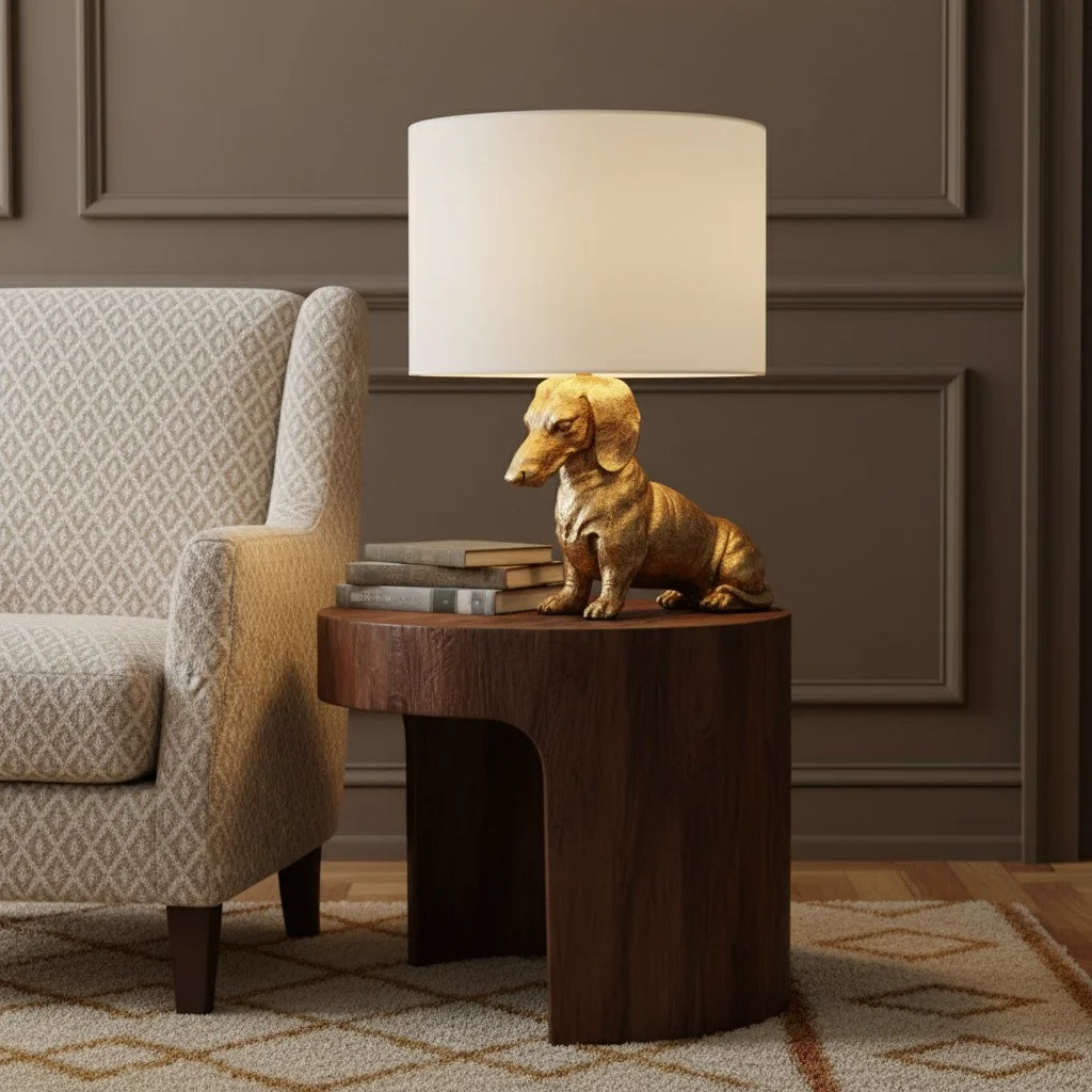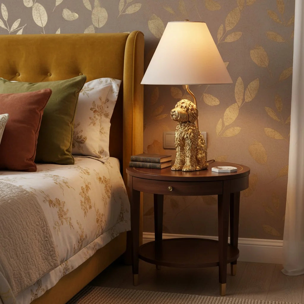 Crafted with a sculpted me'ta dog base and soft fabric shade, this lamp blends vintage allure with playful personality, adding warmth to bedside nooks or cozy corners.