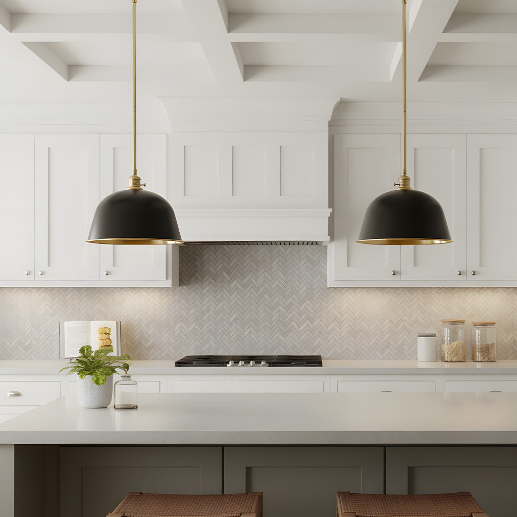 A bell-shaped hood finished in powder-coated enamel infuses any space with striking industrial lighting aesthetics.