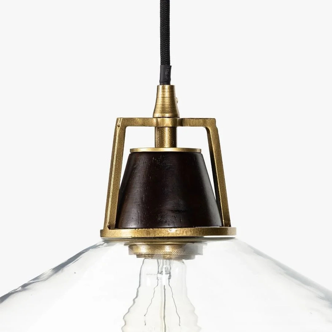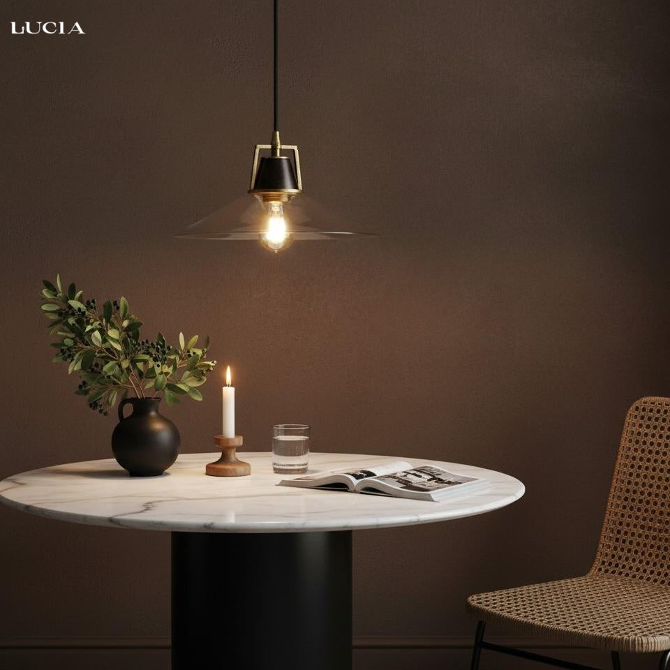 The Nephelai Pendant Light blends pure minimalism with mid-century charm. Suspended from a sleek cord, its clear glass cone shade and subtle metallic accents add elegance to dining tables, kitchen islands, or entryways.