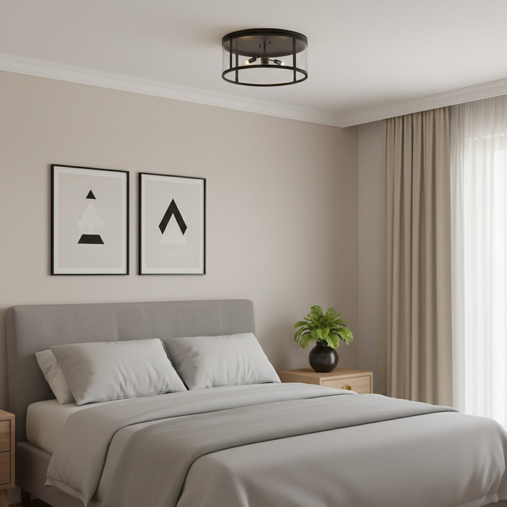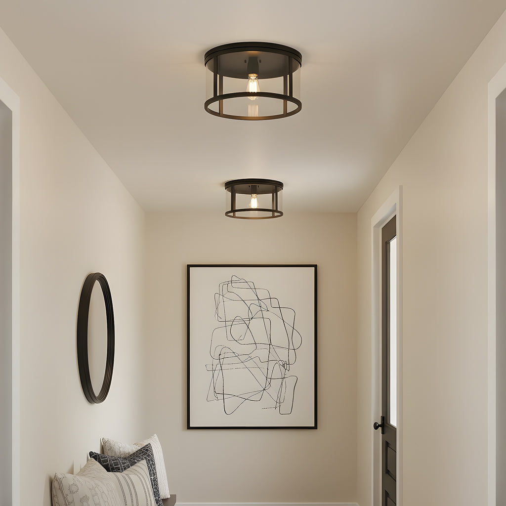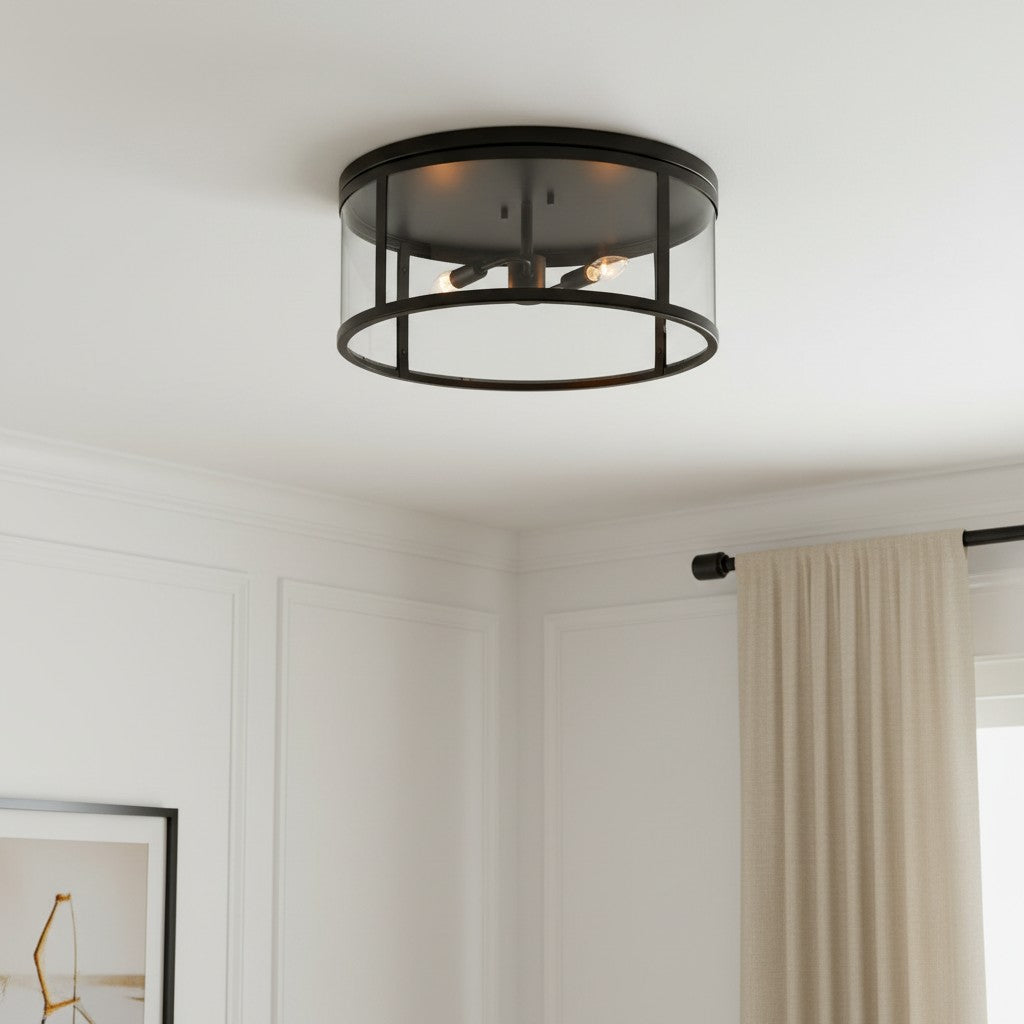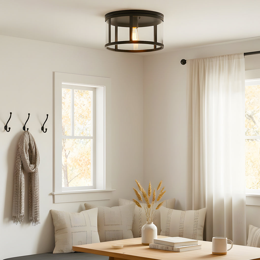 Combining industrial character with timeless elegance, the Nolan ceiling light features a clean-lined metal frame and clear glass that diffuses a warm, inviting glow. The round flush-mount design offers space-saving versatility for hallways, bedrooms, or covered outdoor spaces.