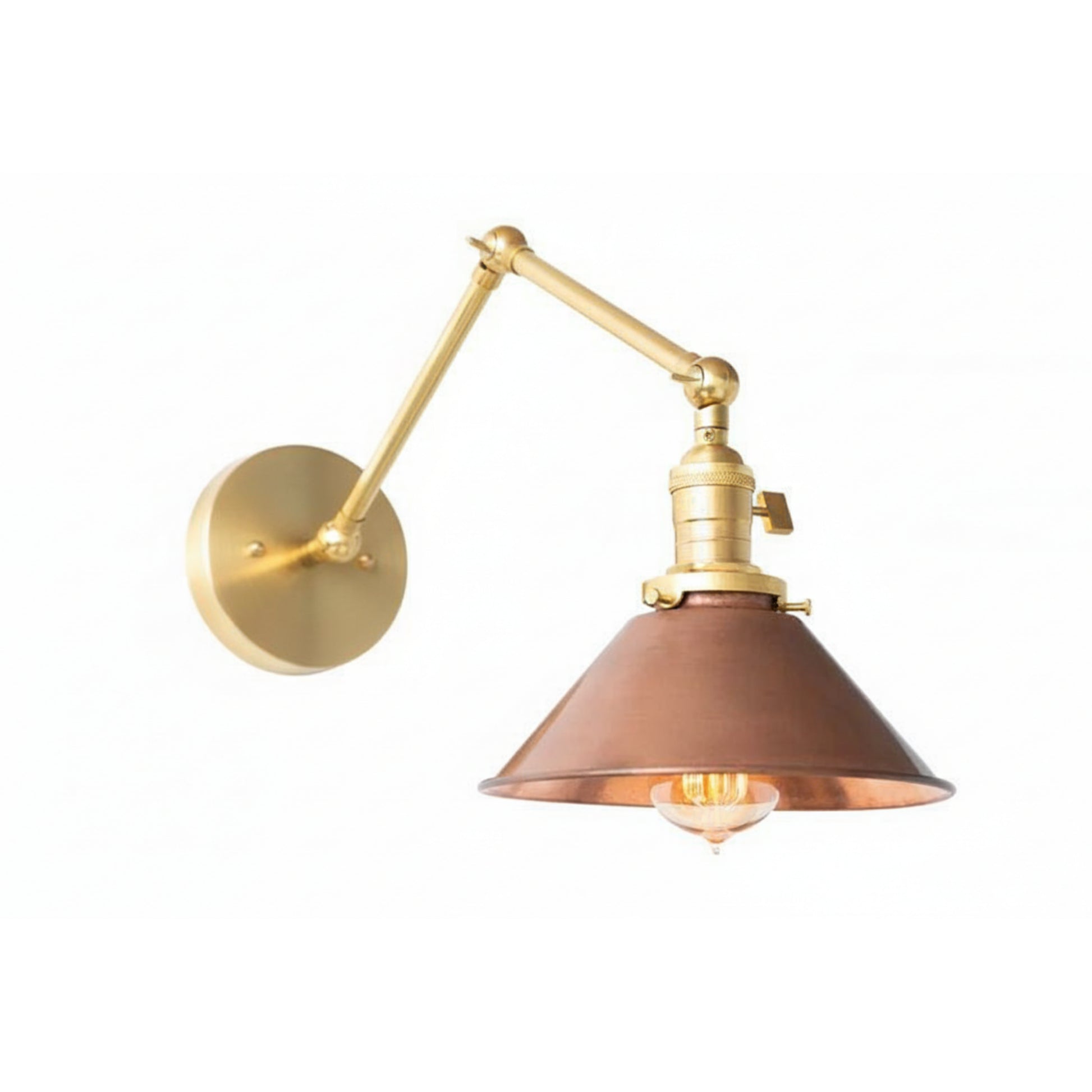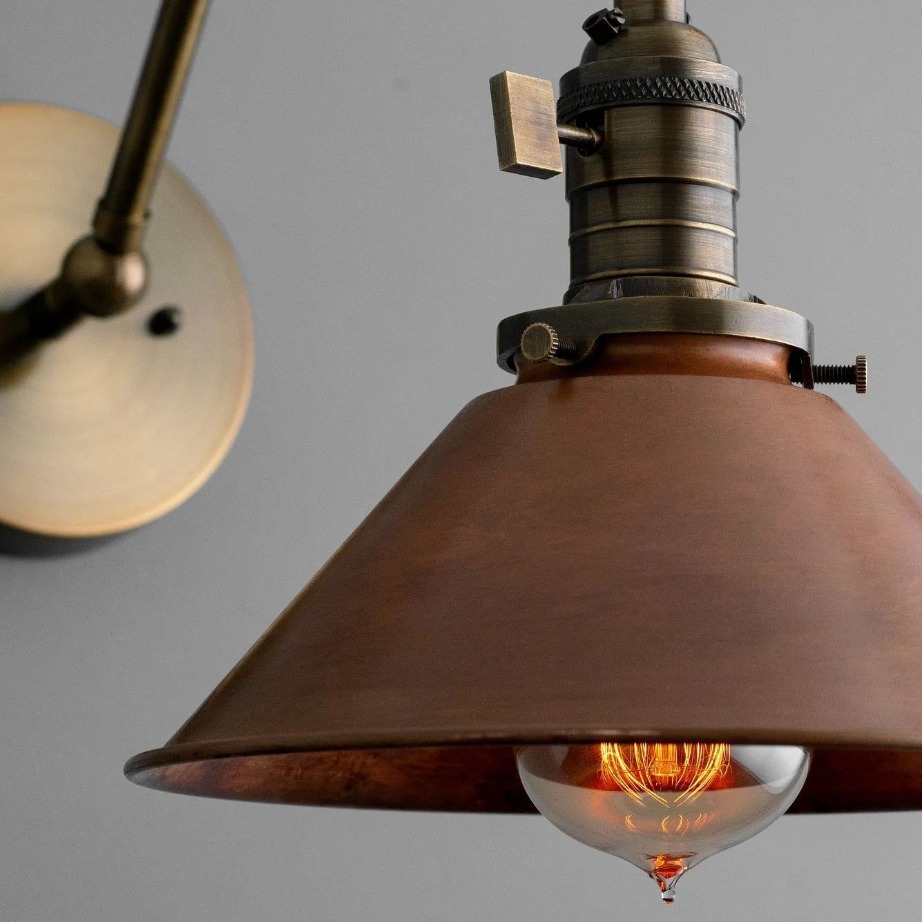 This Rustic Industrial Copper Swivel Wall Light features a hand-aged solid copper shade, each one uniquely patinated for a one-of-a-kind appearance.