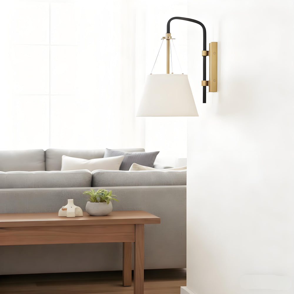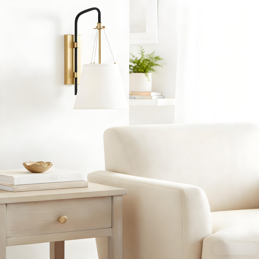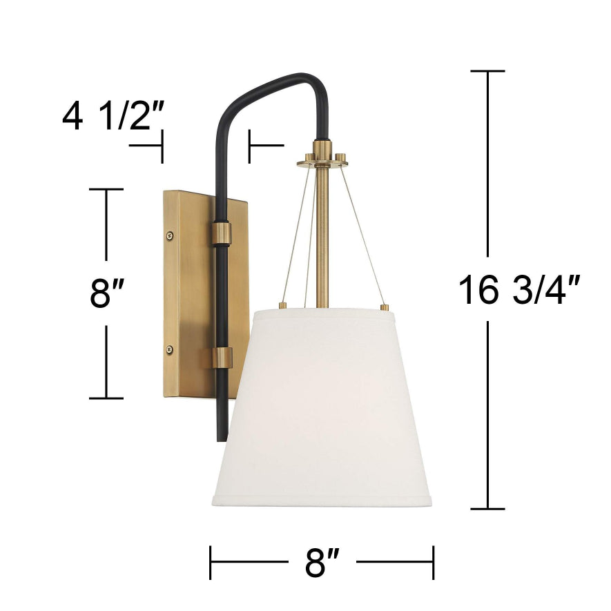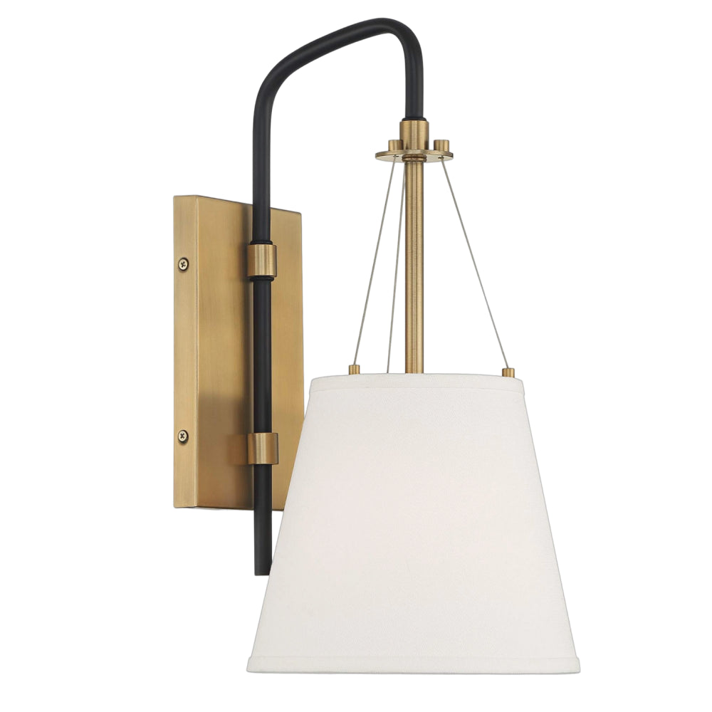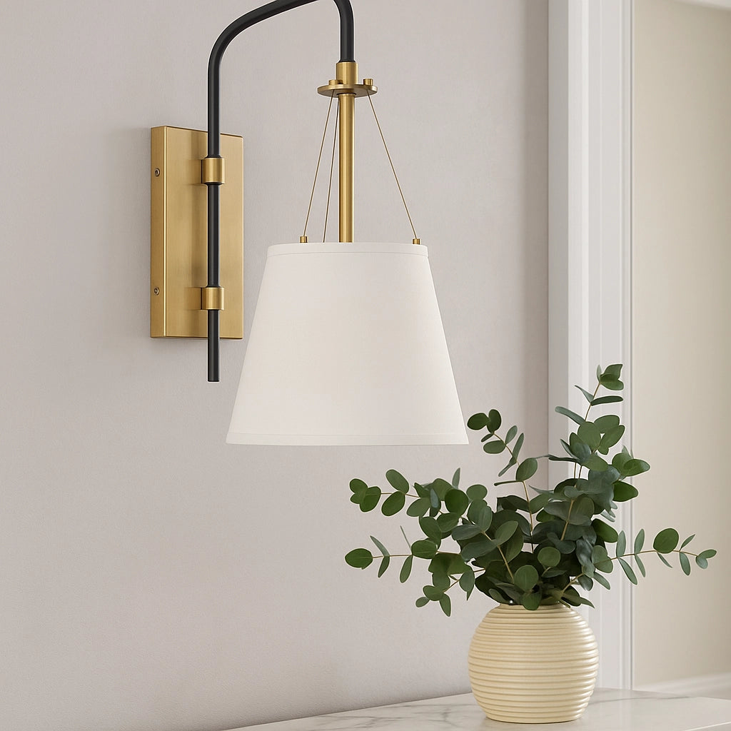 The Wall Sconce combines warm brass - toned metal with a sleek black arm, crowned by a soft white linen shade. Perfect for bedside nooks, entryways.